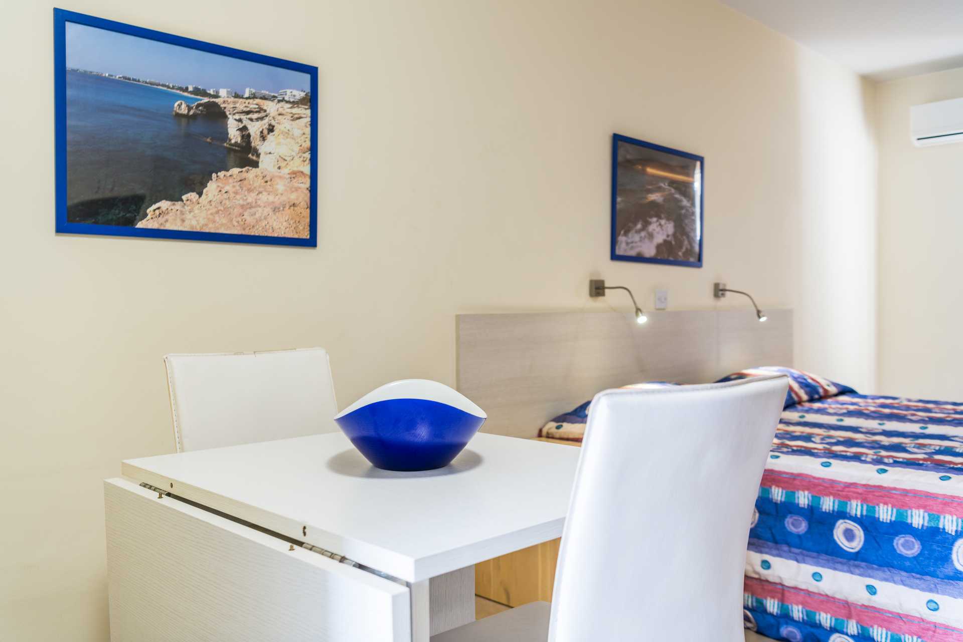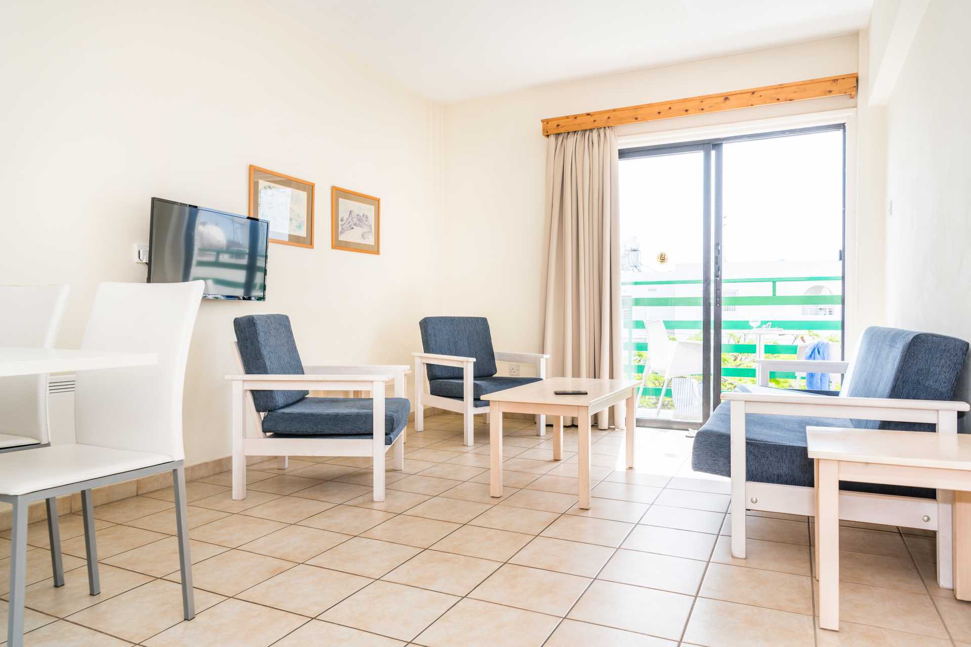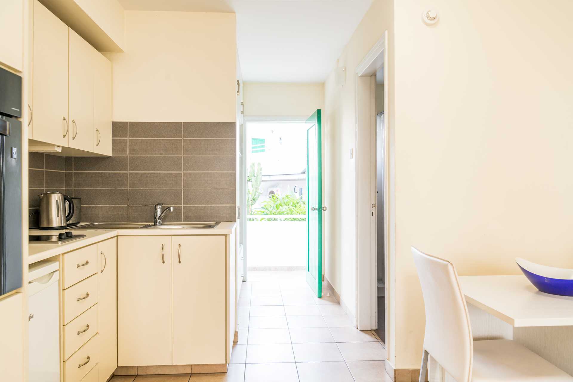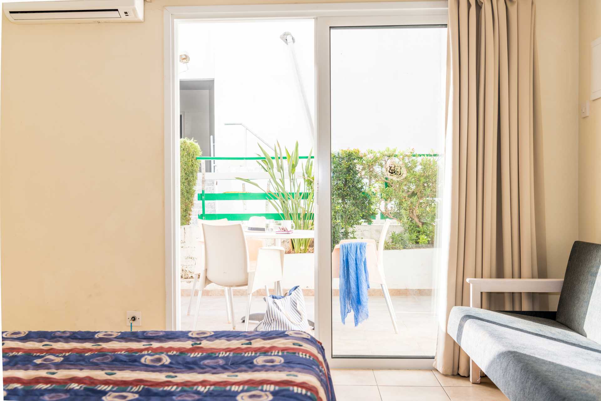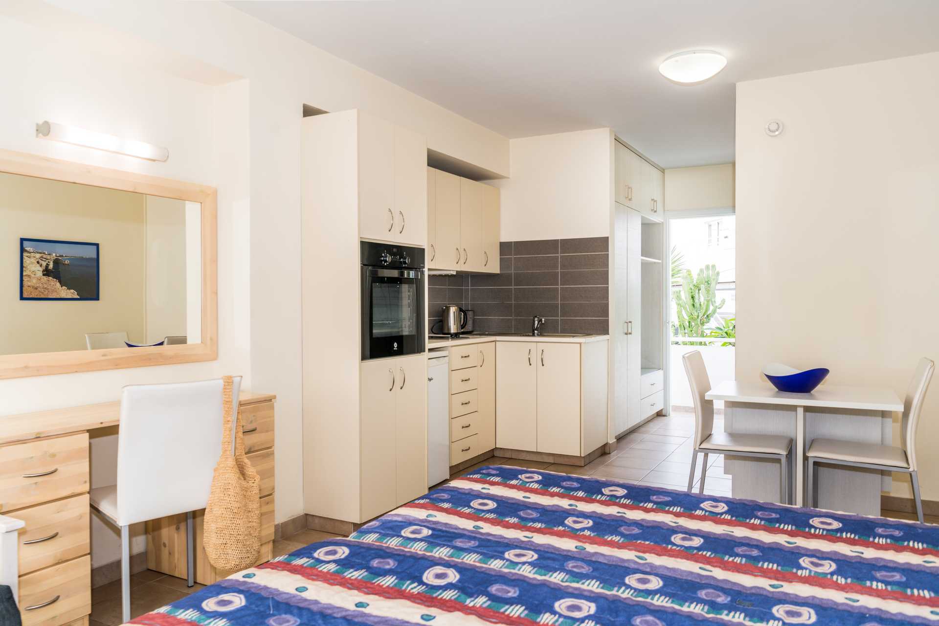 Ettromsleilighet med balkong eller markterrasse. Minikjøkken. To enkeltsenger. Mulig med ekstraseng i sovesofa. Minikjøkken med kjøleskap, kokeplater, brødrister, vannkoker, liten stekeovn eller mikrobølgeovn og enkelt kjøkkenutstyr. Wifi inkludert. Luftkondisjonering mot avgift, betales per enhet som er slått på og for minimum tre dager. De fleste leilighetene har dobbeltvinduer. TV. Badekar og dusj samt wc. Rengjøring 6 ggr/uke.