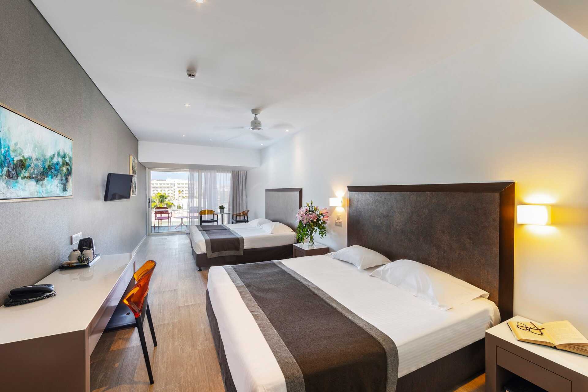 Familierom med balkong. En dobbeltseng og to enkeltsenger. Mulig med ekstraseng i ordinære senger. Wifi, luftkondisjonering og safe inkludert. Minibar. Vannkoker samt kaffe og te. TV. Dusj og wc, hårføner. Rengjøring 7 ggr/uke.