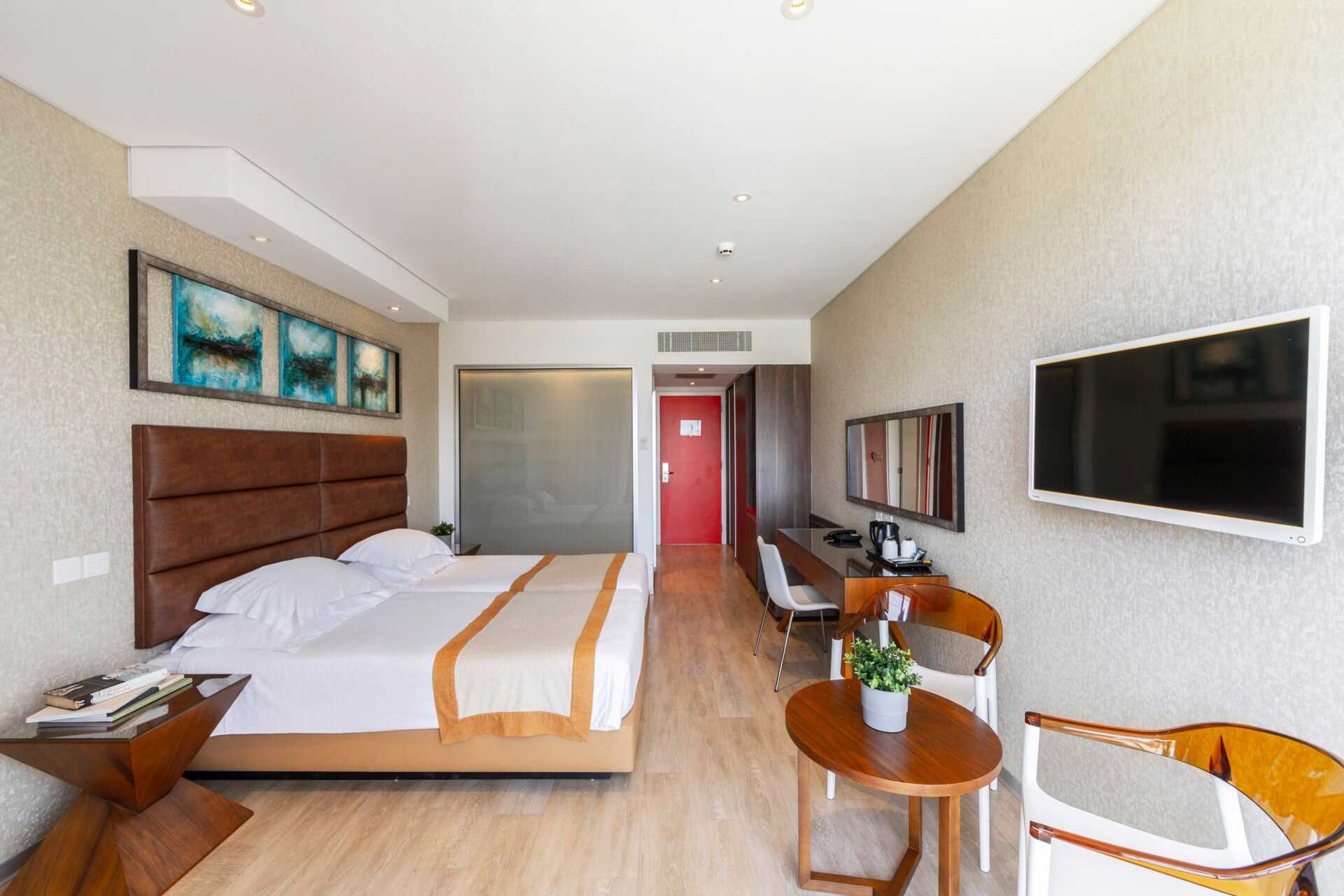 Dobbeltrom med balkong, noen med havutsikt. En dobbeltseng eller to enkeltsenger. Mulig med ekstraseng i feltseng. Wifi, luftkondisjonering og safe inkludert. Minibar. Vannkoker samt kaffe og te. TV. Dusj og wc, hårføner. Rengjøring 7 ggr/uke.