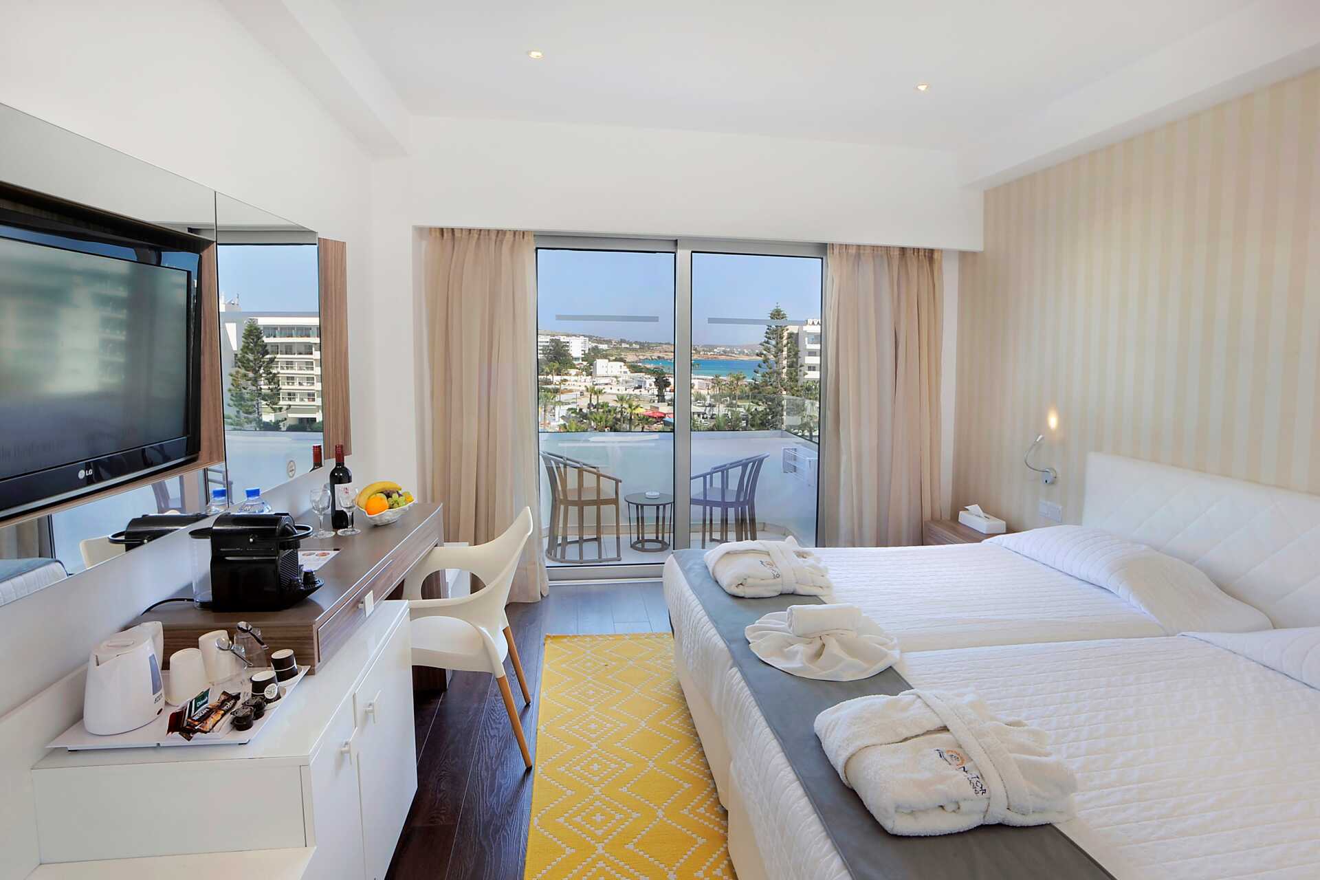 Superiorrom med balkong, noen med begrenset havutsikt. En dobbeltseng eller to enkeltsenger. Mulig med ekstraseng i feltseng. Hvis ekstrasengen brukes, kan rommet føles trangt. Wifi, luftkondisjonering og safe er inkludert. Kjøleskap. Vannkoker samt kaffe og te. TV. Hårføner. Badekar eller dusj samt wc. Rengjøring 7 ggr/uke. Barn under 2 år regnes inn i maksantallet i rommet.