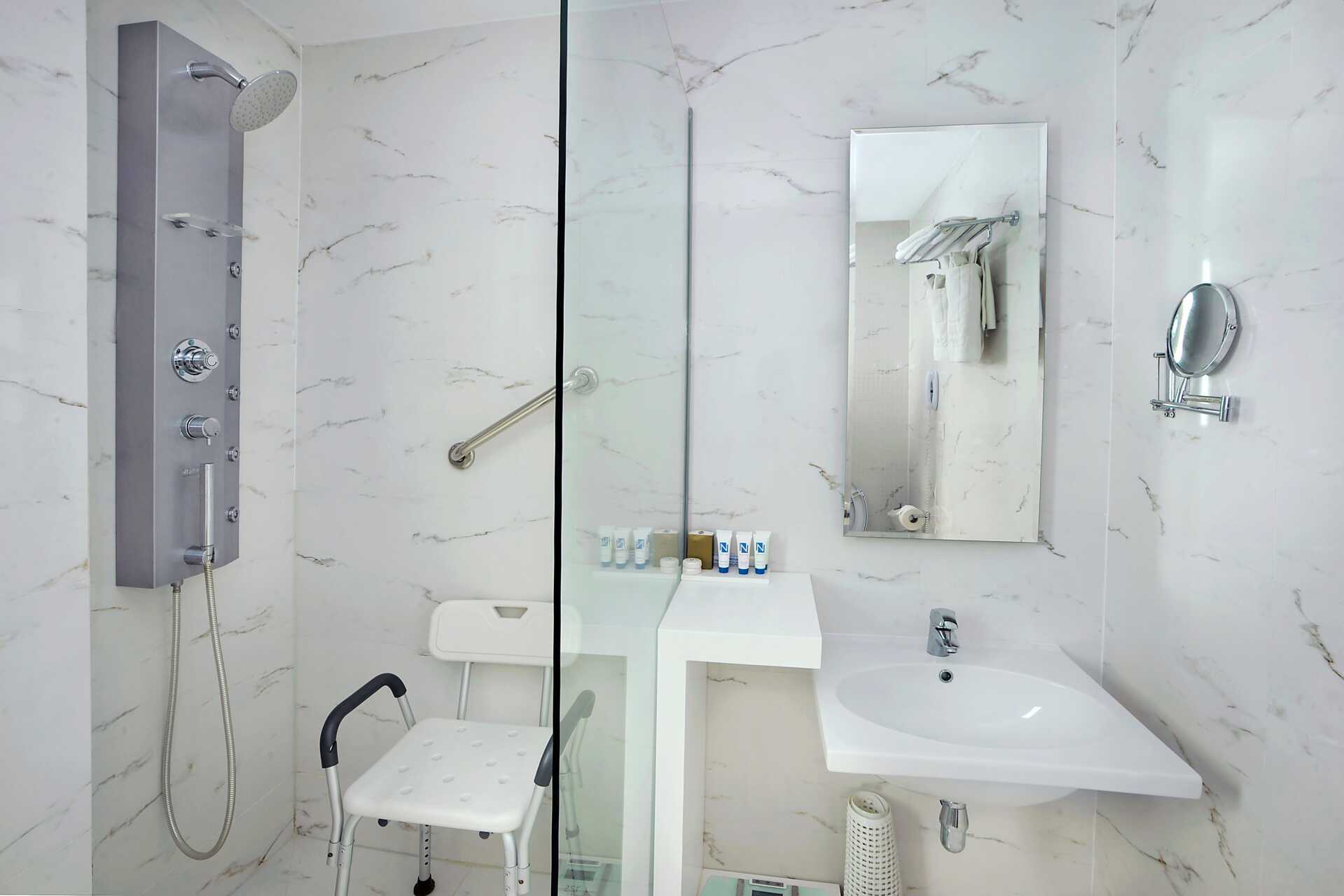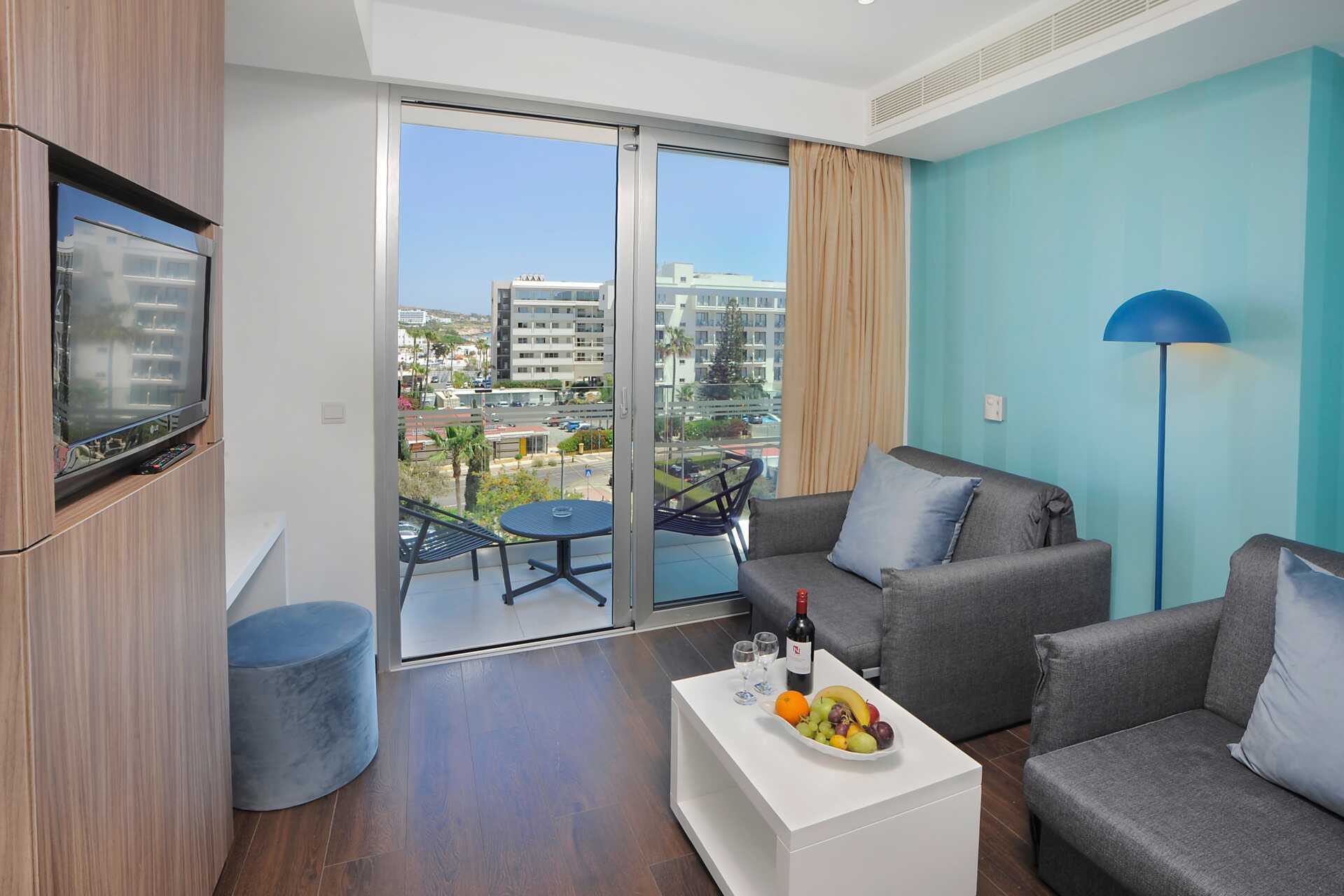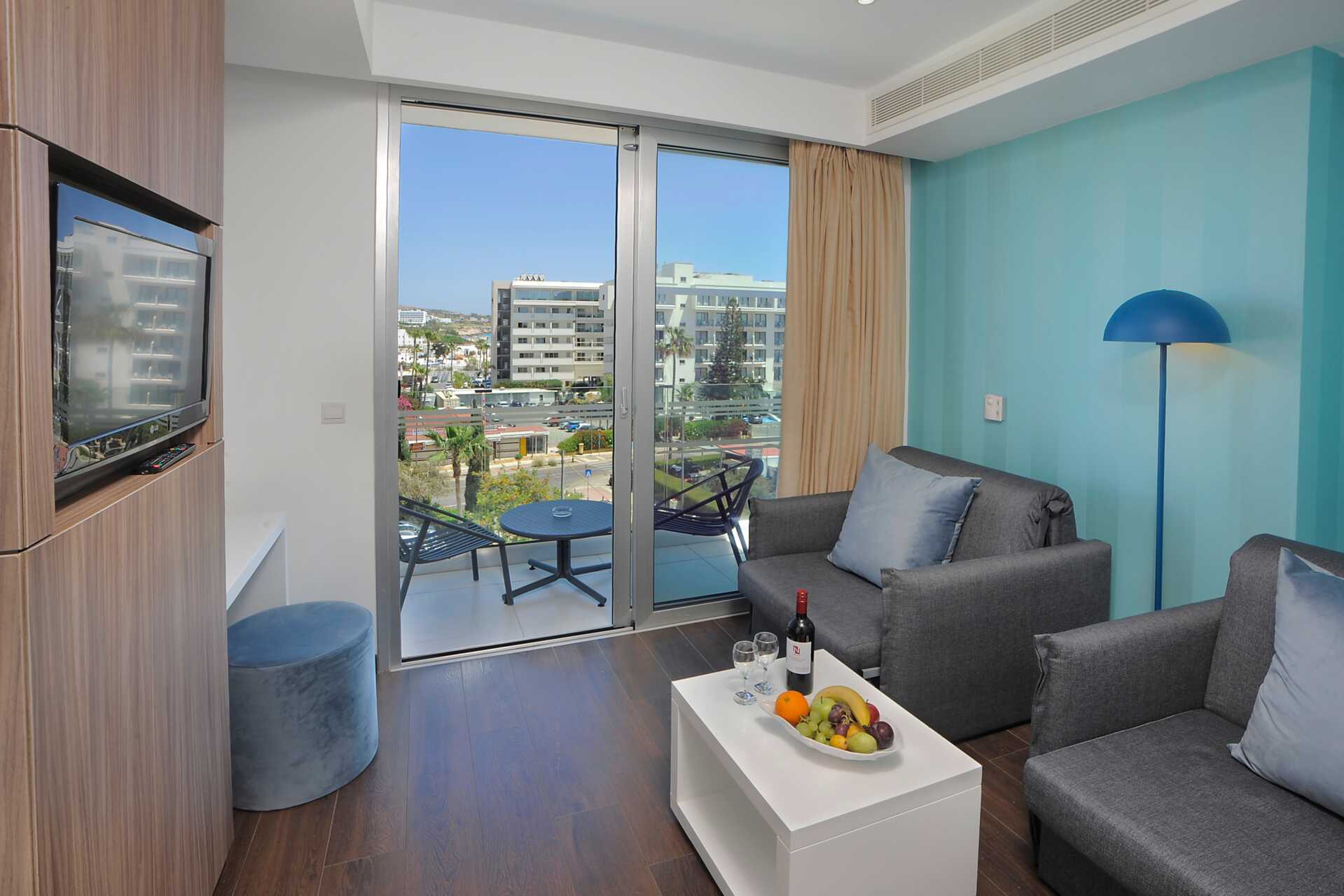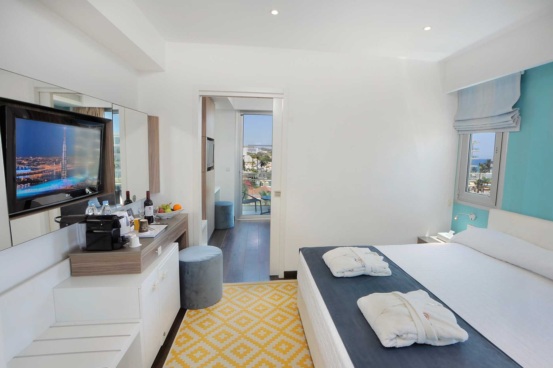 Juniorsuite med balkong og begrenset havutsikt. Juniorsuiten består av et soverom med loungedel. En dobbeltseng. Mulig med en ekstraseng i sovesofa. I noen rom er soveområdet adskilt fra stueområdet med skyvedører. Wifi, luftkondisjonering og safe inkludert. Kjøleskap. Vannkoker samt kaffe og te. Nespresso kaffemaskin, kapsler inkludert og etterfylles hver dag. TV. Ved ankomst venter frukt og vin på rommet. Badekåper og tøfler Hårføner. Dusj og wc. Rengjøring 7 ggr/uke. Barn under 2 år regnes inn i maksantallet i rommet.