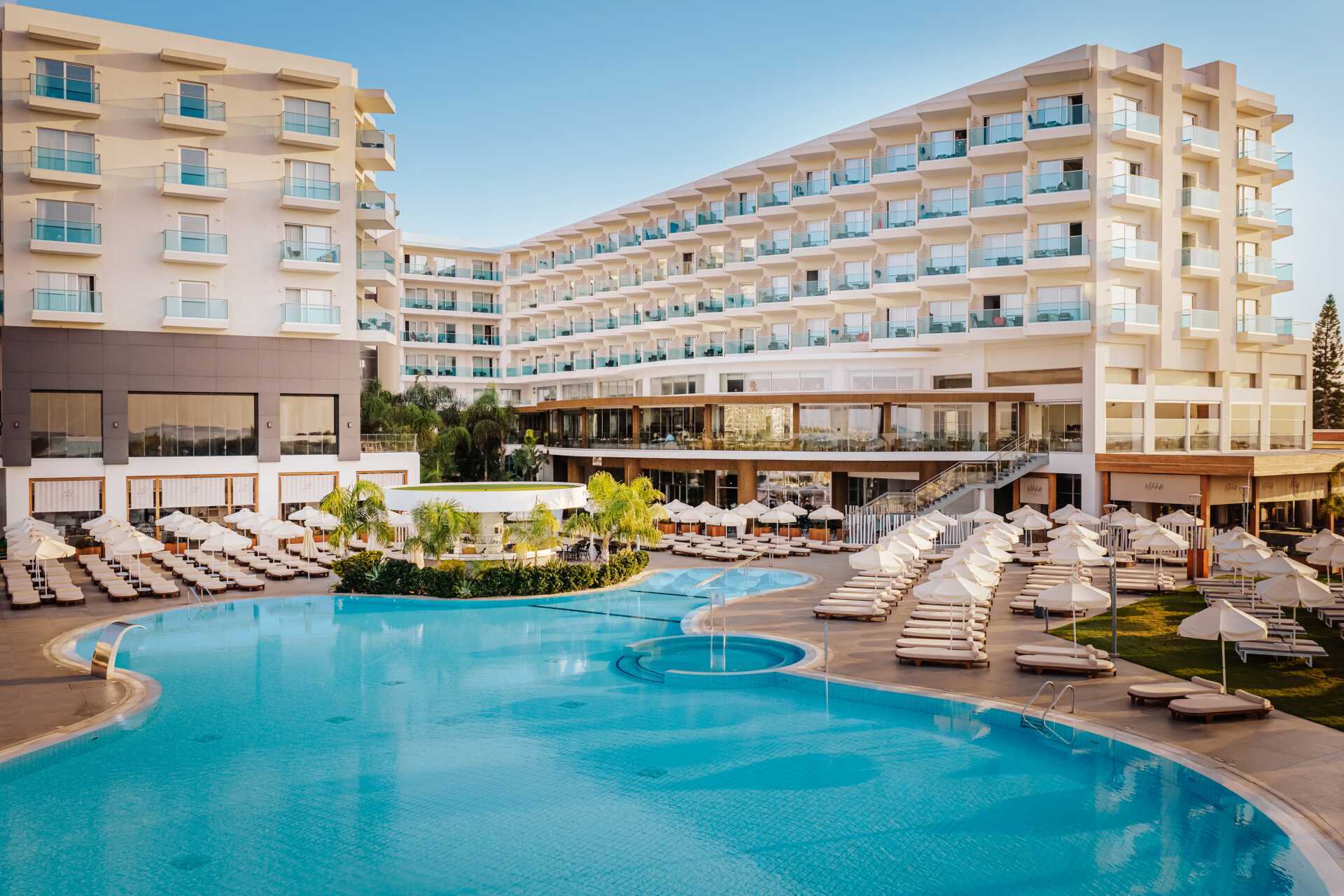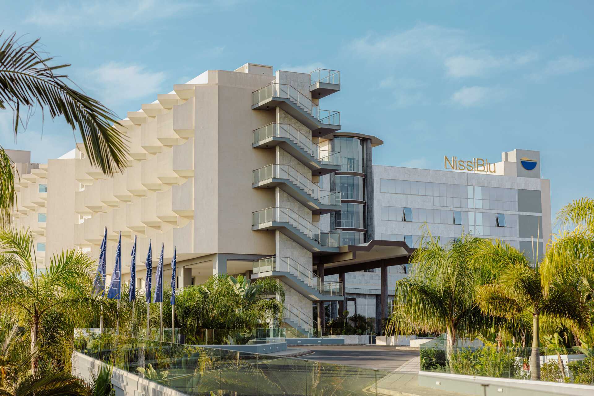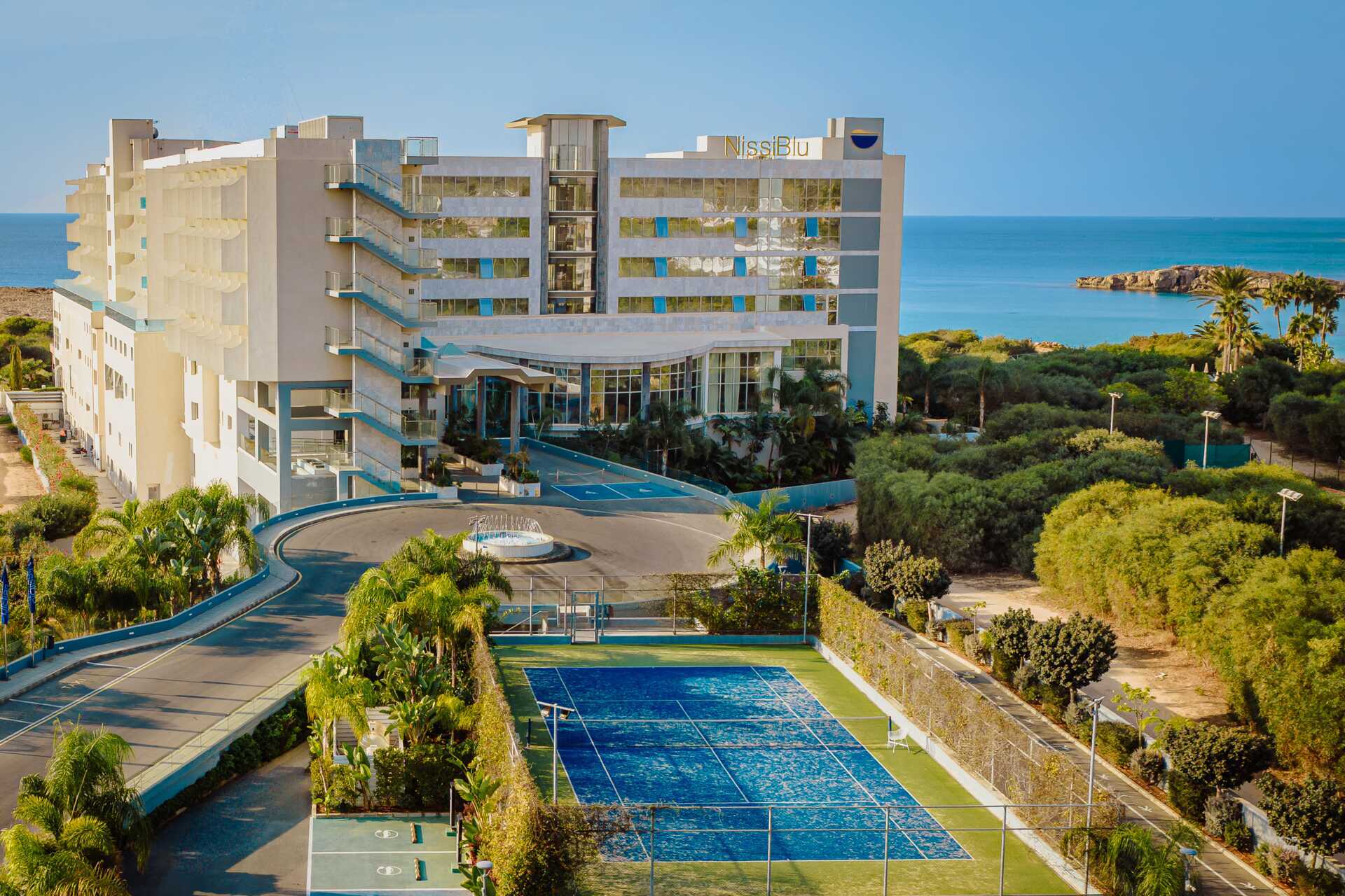 NissiBlu Beach Resort er et stilig og moderne hotell med lett gangavstand til Nissi Beach. Hotellet tilbyr flere ulike måltidspakker med alt fra halvpensjon til All Inclusive – en stor rikholdig frokostbuffé er inkludert. På hotellet finner du også et herlig bassengområde, et spa for avslapning og vil du trene eller bevege deg finner du en tennisbane og hotellet tilbyr også yoga og gruppetrening.