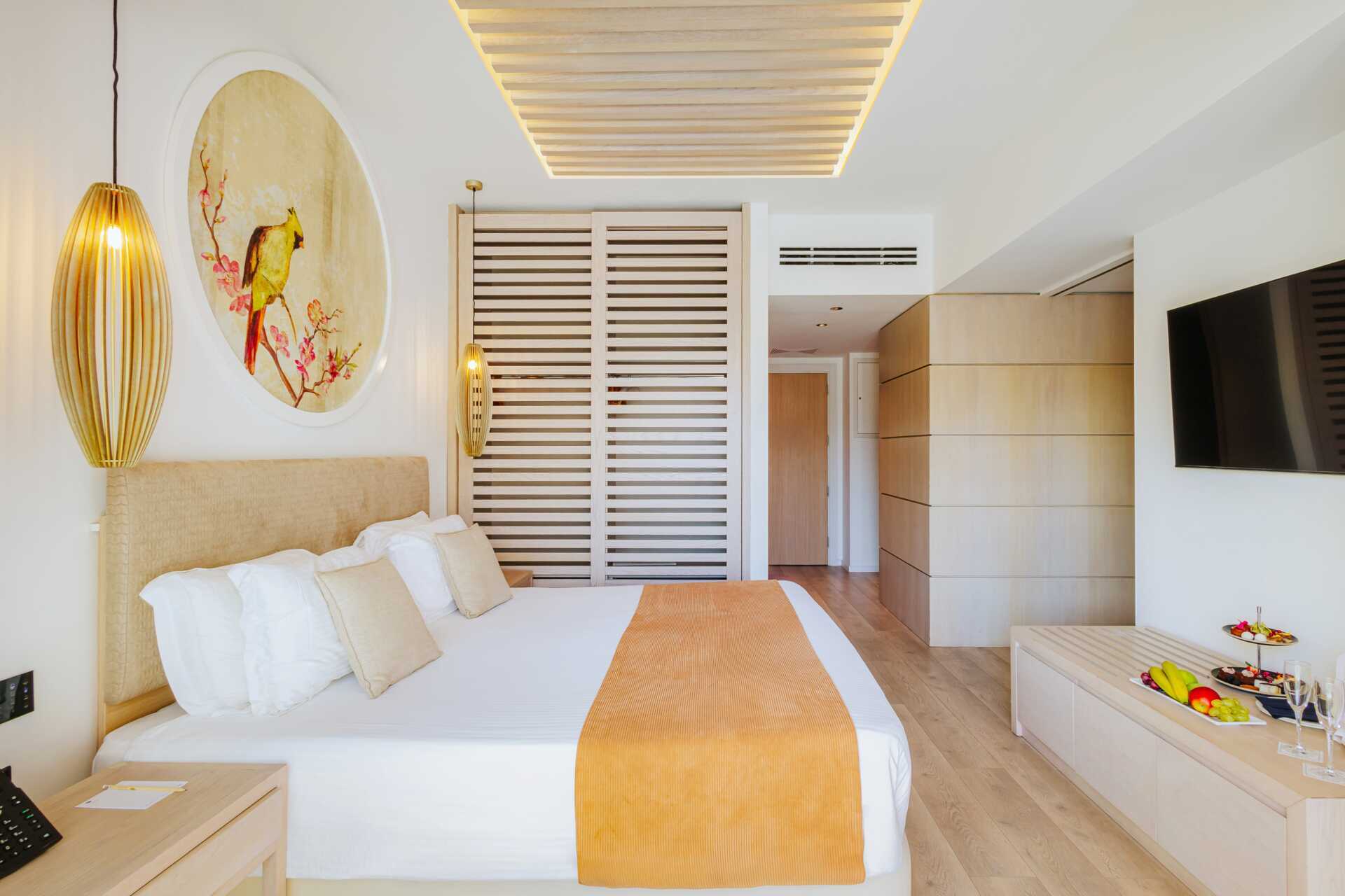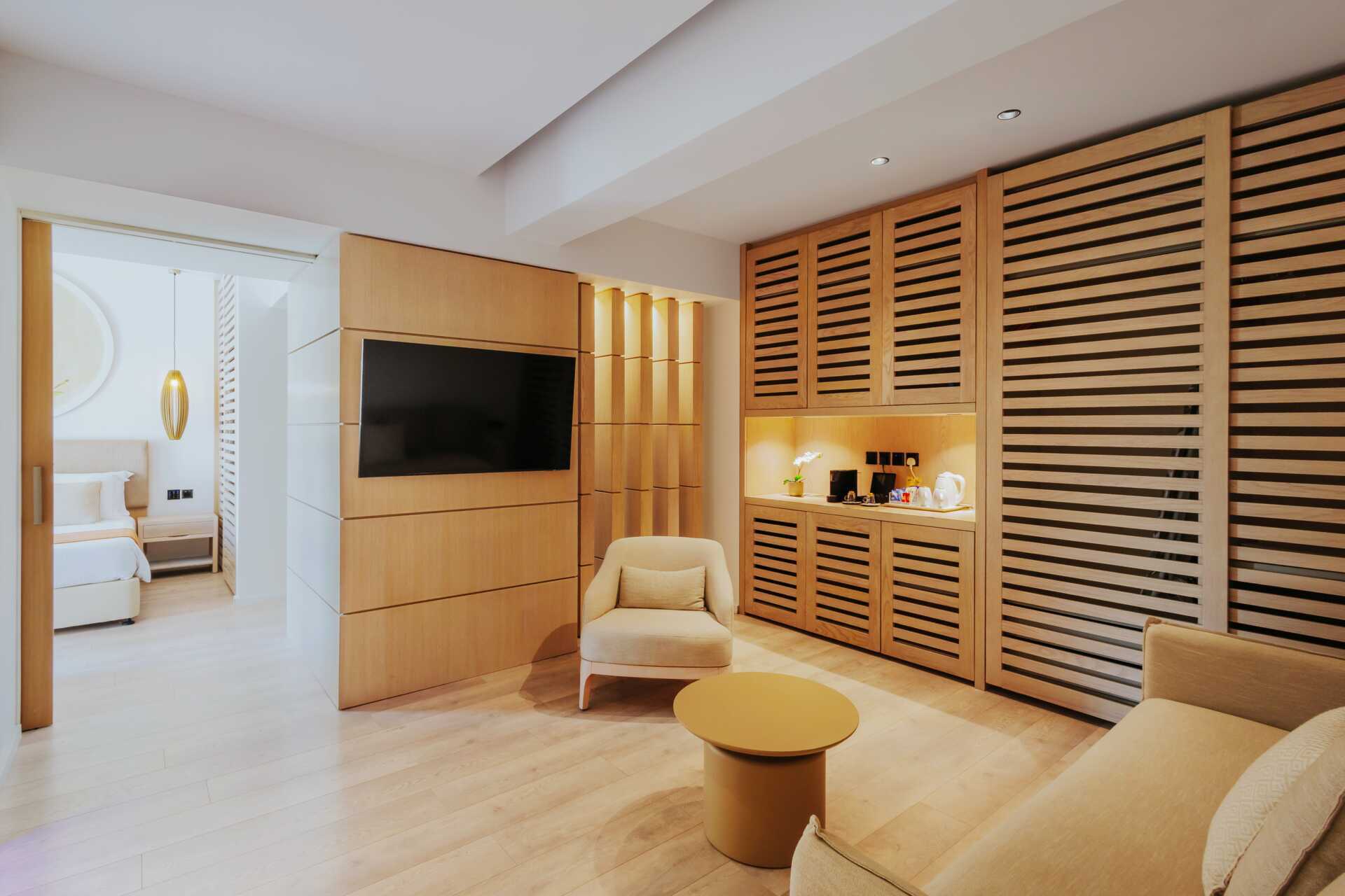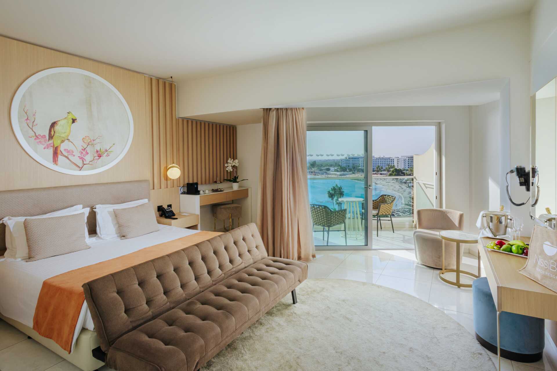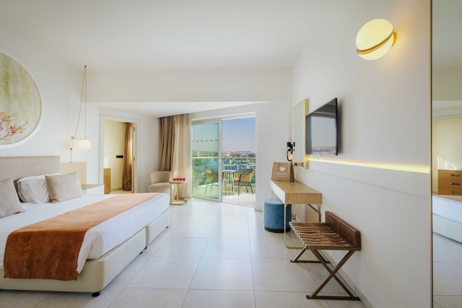 Juniorsuite med balkong og havutsikt. En dobbeltseng. Mulig med ekstra oppredning i sovesofa eller feltseng. Wifi, luftkondisjonering og safe inkludert. Minibar mot tillegg. Vannkoker samt kaffe og te. Kaffemaskin. TV. Strykejern og strykebrett. Badekåper og tøfler Hårføner. Badekar og wc. Rengjøring 7 ggr/uke. Barn under 2 år regnes inn i maksantallet i rommet.