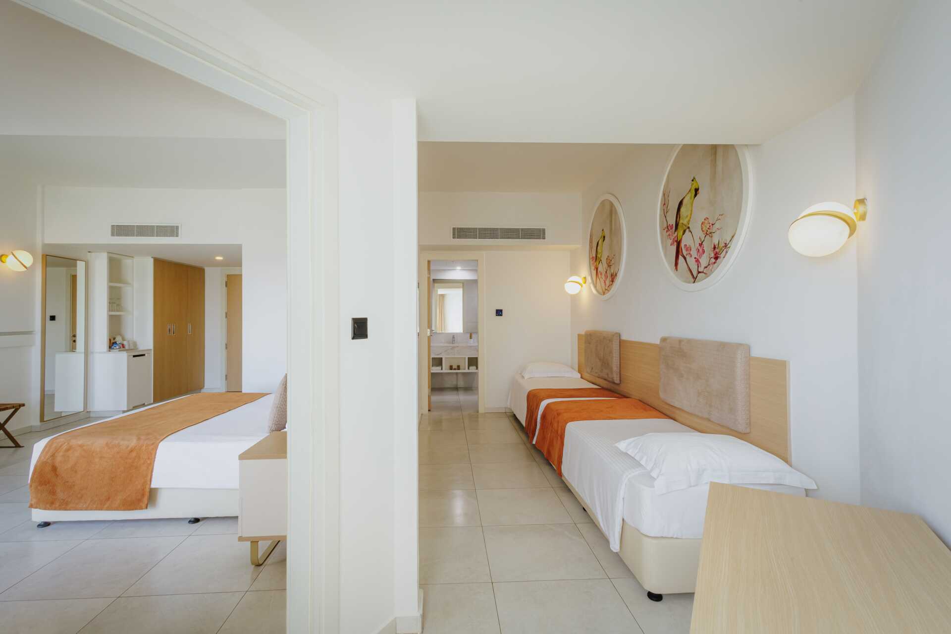 Familierom superior med balkong og havutsikt. Familierom superior består av to soverom, et med en dobbeltseng og et med to enkeltsenger. Wifi, luftkondisjonering og safe inkludert. Minibar mot tillegg. Vannkoker samt kaffe og te. TV. Badekåper og tøfler Hårføner. Baderom med badekar, separat dusj og wc. Rengjøring 7 ggr/uke. Barn under 2 år regnes inn i maksantallet i rommet.