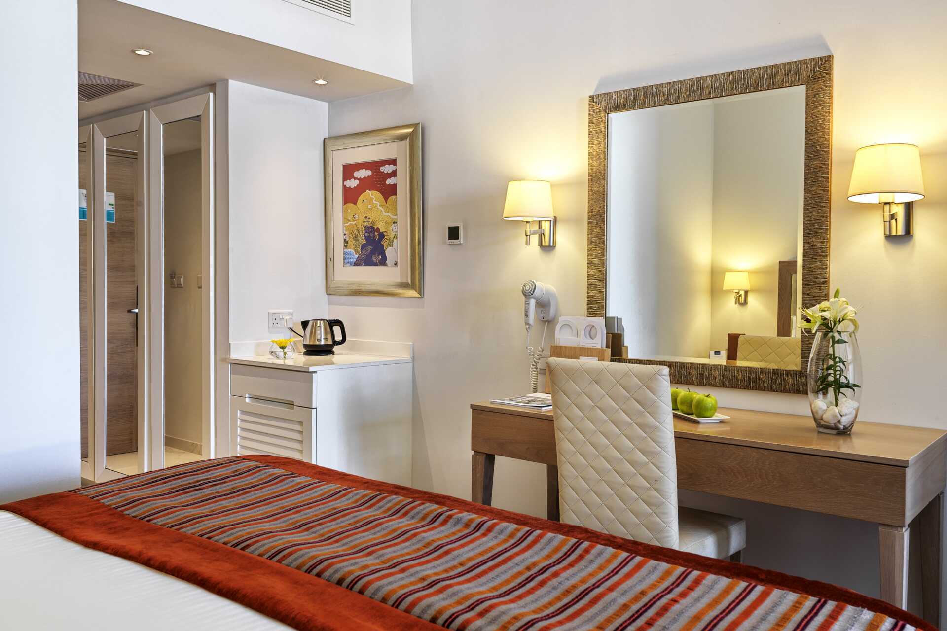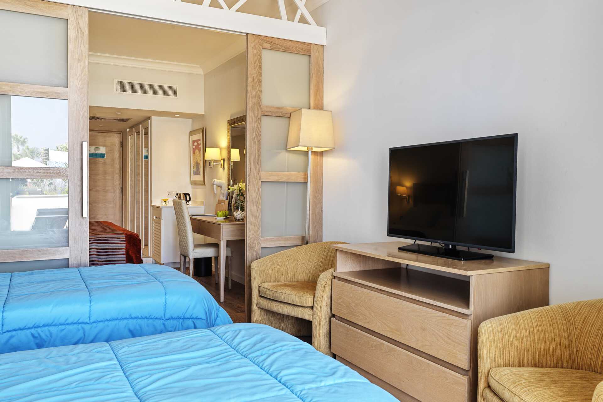 Deluxerom med fransk balkong. En dobbeltseng eller to enkeltsenger. Mulig med ekstraseng i sovesofa. Wifi, luftkondisjonering og safe inkludert. Kjøleskap. En vannflaske er inkludert, etterfylles daglig. Vannkoker samt kaffe og te. TV. Badekåper og tøfler. Hårføner. Dusj og wc. Rengjøring 7 ggr/uke. Barn under 2 år regnes inn i maksantallet i rommet.