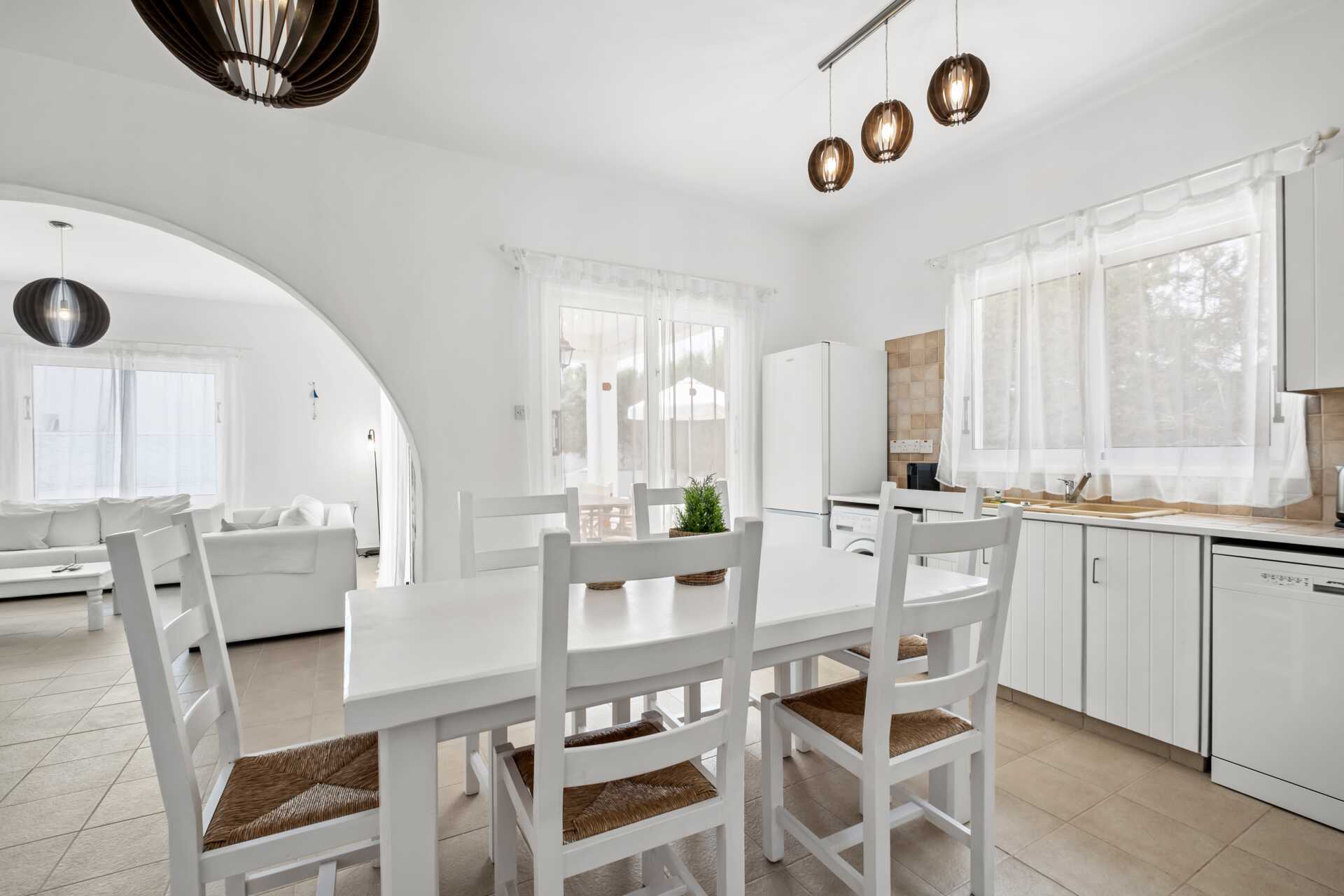 Villaen er i to etasjer, og i første etasje er det kjøkken og stue i åpen planløsning, et soverom med to enkeltsenger og et bad med hårføner, dusj og wc. Ovenpå er det tre soverom og et bad med hårføner, badekar og wc. Et soverom har en dobbeltseng og to har to enkeltsenger. Kjøkken med kjøleskap og fryser, komfyr, stekeovn, vaskemaskin, oppvaskmaskin, espressomaskin, kaffetrakter, mikrobølgeovn, brødrister, vannkoker og enkelt kjøkkenutstyr. Wifi, luftkondisjonering og safe inkludert. TV. Strykejern og strykebrett. Bassenget rengjøres hver dag, og villaen rengjøres to ganger i uken. Parkering er inkludert.