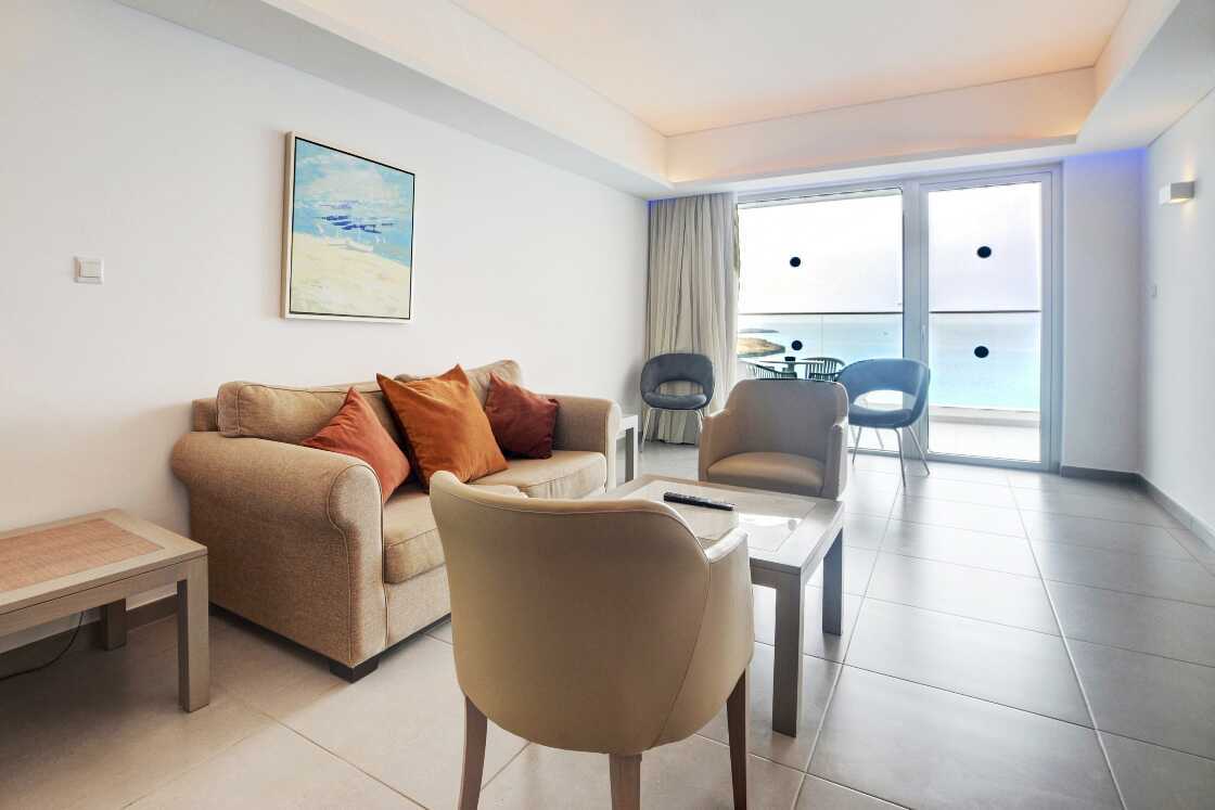 Juniorsuite med balkong og havutsikt. Juniorsuiten består av et soverom og en stue. En dobbeltseng. Mulig med ekstrasenger i sovesofa. Wifi, luftkondisjonering og safe inkludert. Kjøleskap. Vannkoker samt kaffe og te. Hårføner. Badekar og wc. Rengjøring 7 ggr/uke.