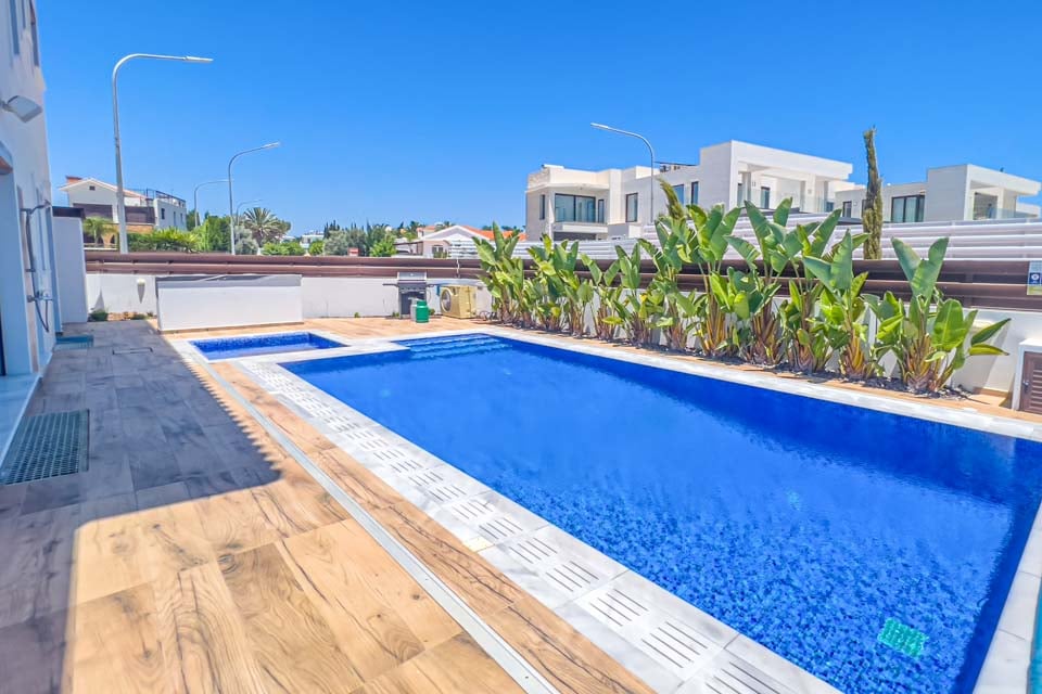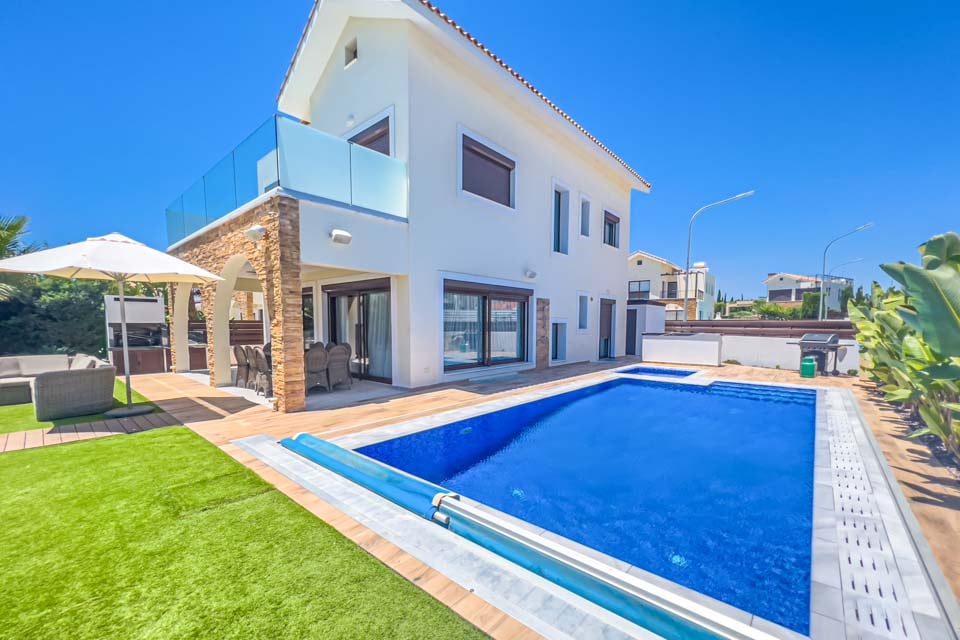 Denne fantastiske villaen ligger i utkanten av Ayia Napa, og tilbyr den ideelle balansen mellom avslapning og moderne livsstil, ideelt for de som søker et romslig tilfluktssted ved stranden. Selv om en bil er viktig for å utforske området rundt og få tilgang til lokale fasiliteter, gir villaen enkel tilgang til den pulserende byen Ayia Napa og dens vakre kystlinje.