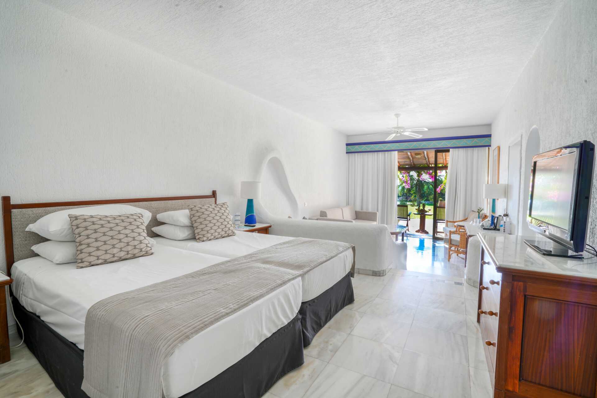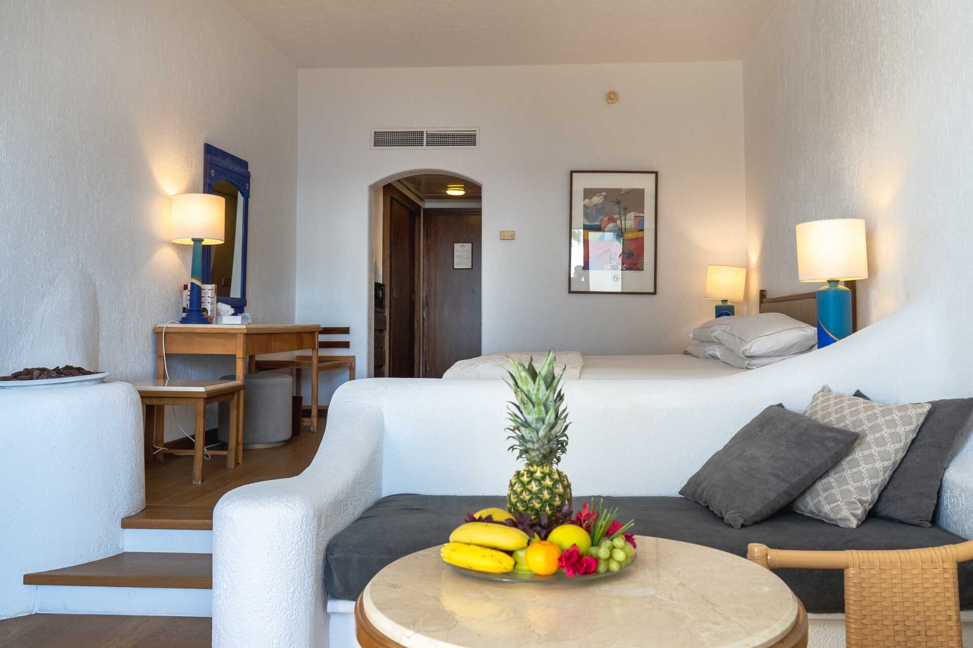 Suite med markterrasse. Suiten har både hage og havet utenfor. Noen få trappetrinn mellom soverommet og stuen. En dobbeltseng og en enkeltseng. Mulig med en ekstraseng i sovesofa. Wifi, luftkondisjonering og safe inkludert. Minibar mot avgift. Vannkoker samt kaffe og te. TV. Hårføner. Bad med dusj og wc. Rengjøring 7 ggr/uke. Barn under 2 år regnes inn i maksantallet i rommet.