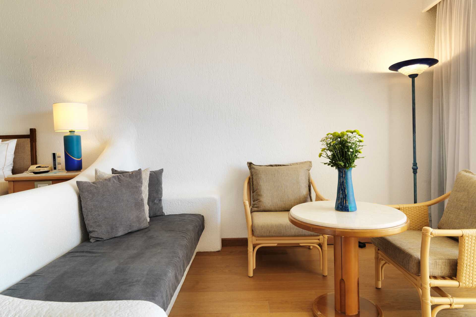 Juniorsuite med balkong og havutsikt. En dobbeltseng og en enkeltseng. Mulig med ekstrasenger i sovesofa. Wifi, luftkondisjonering og safe inkludert. Minibar mot avgift. Vannkoker samt kaffe og te. TV. Hårføner. Badekar og wc. Rengjøring 7 ggr/uke. Barn under 2 år regnes inn i maksantallet i rommet.