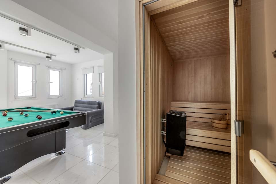 Gå inn og oppdag perlene som venter. Enten du lengter etter en middagslur på de myke lakenene på soverommet, føler deg småsulten og prøver deg på en lekre matbit på det elegante kjøkkenet, eller utfordrer følget ditt til et hyggelig slag biljard, finnes det noe for ethvert humør. Og hvis du er ute etter en velværeøkt, kan du ta turen til den varmende badstuen og sette deg i full zen-modus. Fall inn i strømmen av villalivet og oppdag noe nytt i hvert hjørne av denne idylliske oasen.