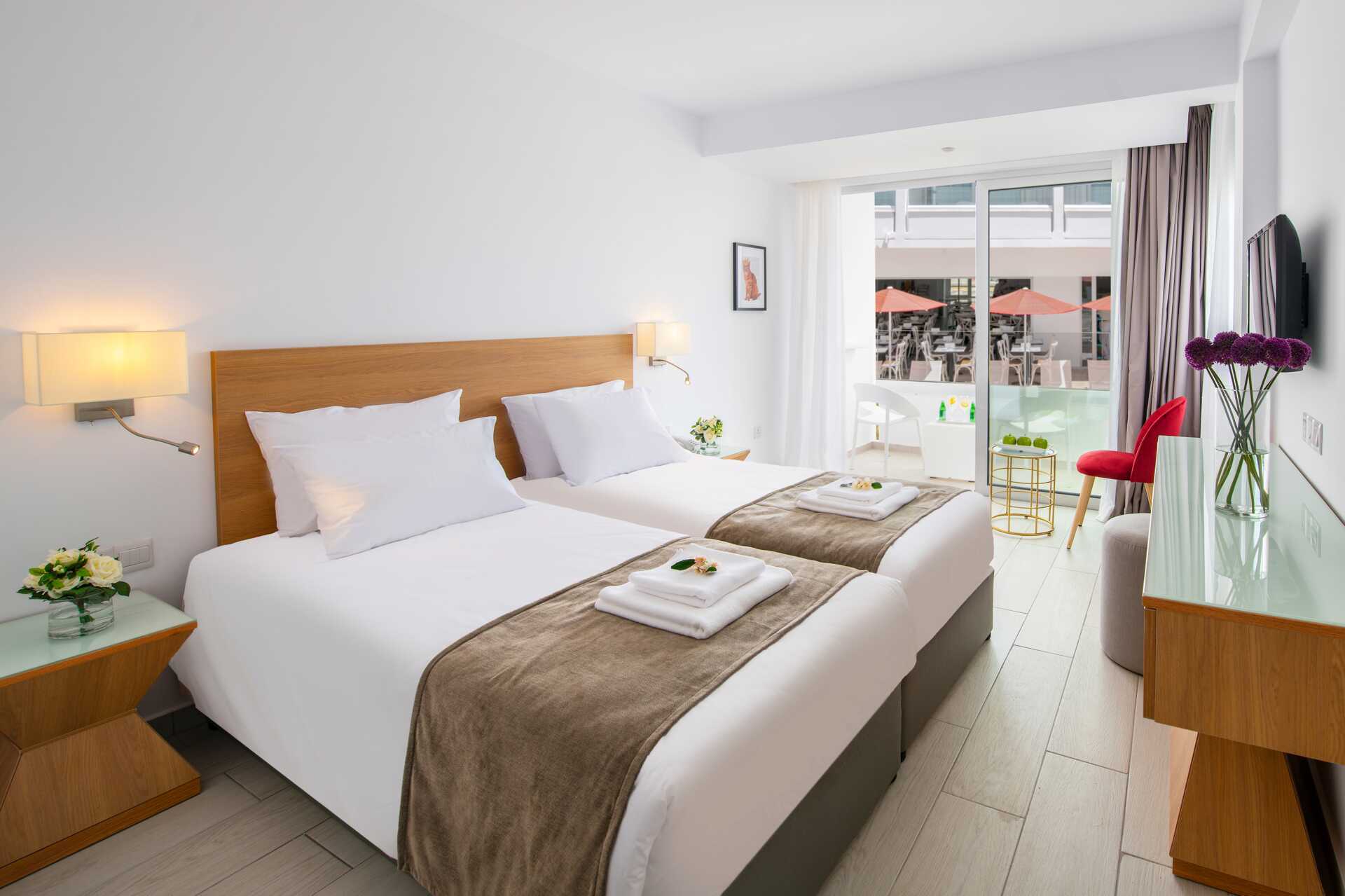 Superiorrom med balkong, noen med bassengutsikt, noen med begrenset havutsikt og noen med havutsikt. En dobbeltseng eller to enkeltsenger. Mulig med ekstraseng i feltseng. Wifi, luftkondisjonering og safe inkludert. Kjøleskap. Vannkoker samt kaffe og te. TV. Strykejern og strykebrett. Hårføner. Dusj og wc. Rengjøring 7 ggr/uke.