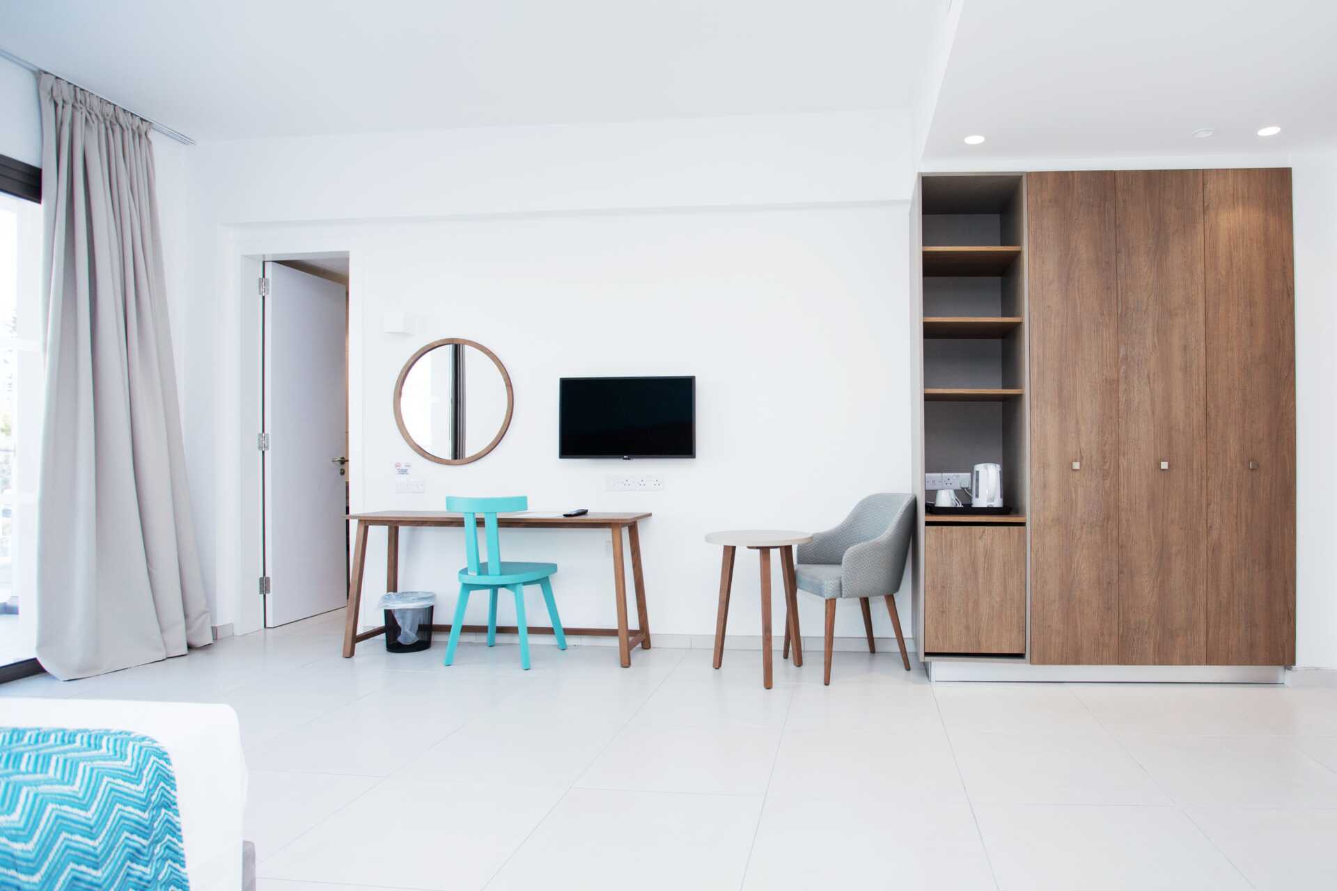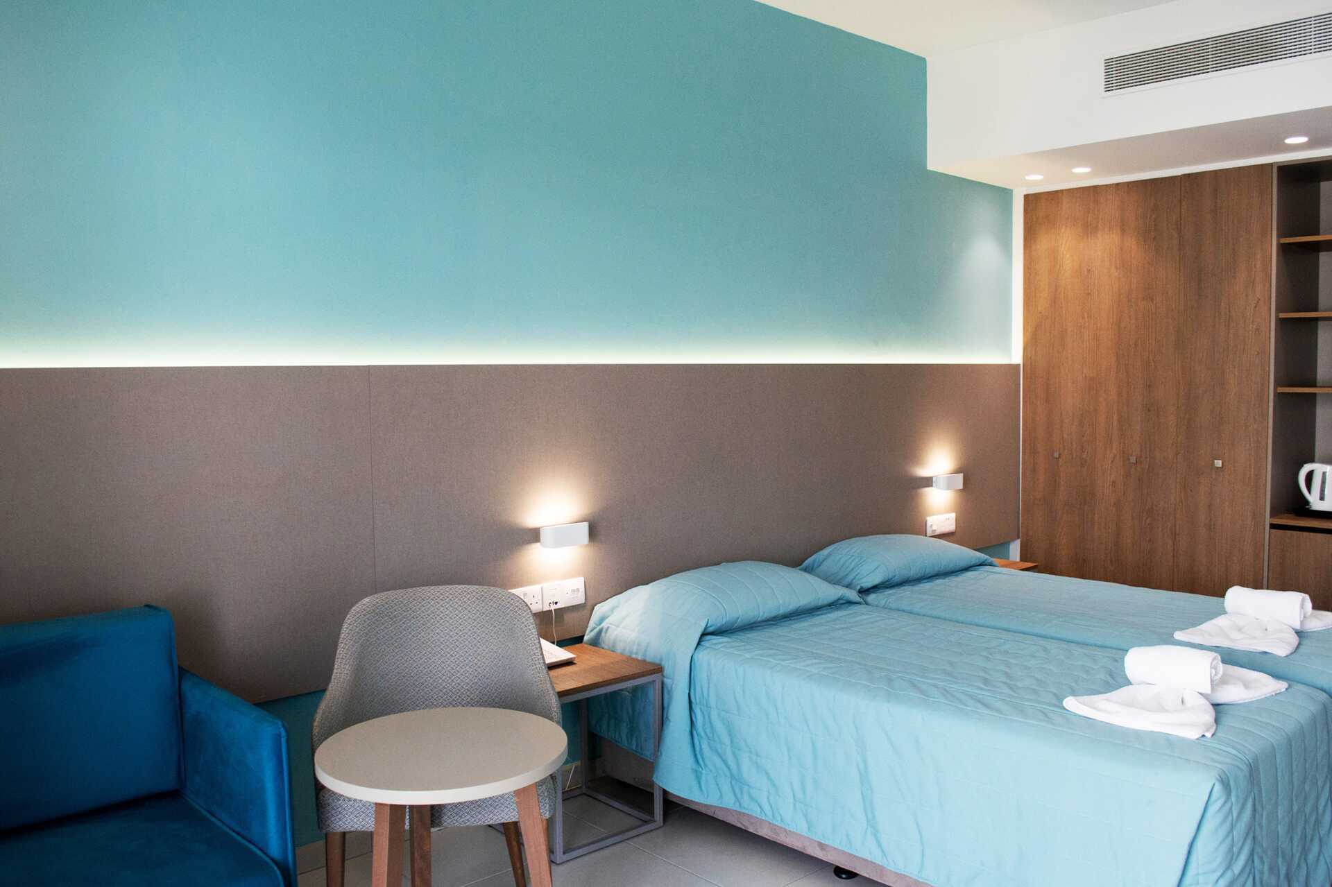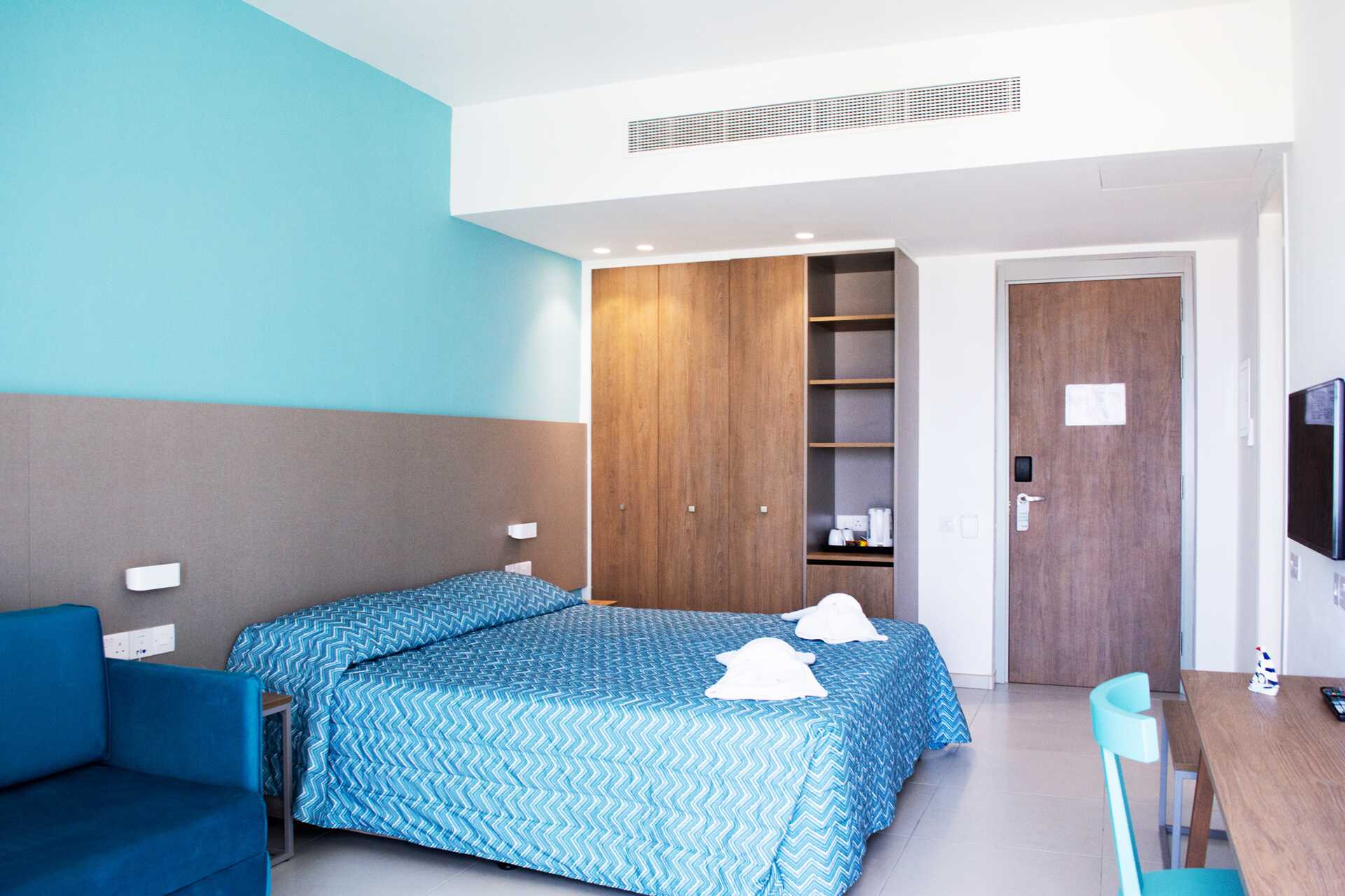 Dobbeltrom med balkong, noen med begrenset havutsikt, noen med havutsikt. En dobbeltseng eller to enkeltsenger. Mulig med ekstraseng i sovesofa. Wifi og luftkondisjonering inkludert. Safe mot avgift. Lite kjøleskap. Vannkoker samt kaffe og te. TV. Dusj og wc. Rengjøring 7 ggr/uke.