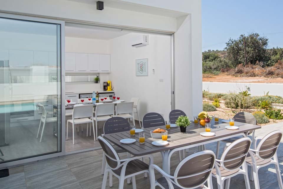 Utenfor tilbyr villaen en moderne terrasse med en ren hvit fasade som skiller seg ut mot den blendende asurblå himmelen. Når du går gjennom entréen, ønskes du velkommen av et friskt, moderne preg. Den romslige stuen, spisestuen og kjøkkenområdet flyter sømløst inn i hverandre, badet i naturlig lys som strømmer gjennom terrassedørene. Stuen har myke sofaer og flatskjerm-TV, mens kjøkkenet kan skilte med en rekke moderne bekvemmeligheter, inkludert kjøleskap, vannkoker, mikrobølgeovn, brødrister og oppvaskmaskin.