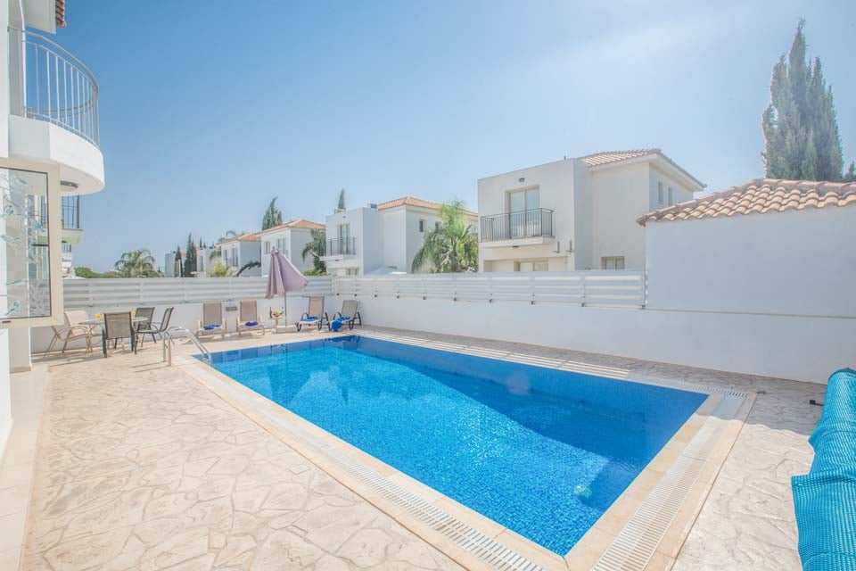 Den hvitkalkede villaen er innredet i en moderne stil med en komfortabel åpen stue og spisestue med sitteplass til seks, et utstyrt kjøkken med moderne hvitevarer og et lite bad i underetasjen. Ovenpå har villaen et moderne familiebad i tillegg til tre lyse soverom, to med en liten balkong foran og bak og ett med eget bad. Få mest mulig ut av middelhavsvarmen i villahagene, hvor et romslig privat basseng med solsenger og et grillområde med utemøbler er tilgjengelig for utendørsaktiviteter.