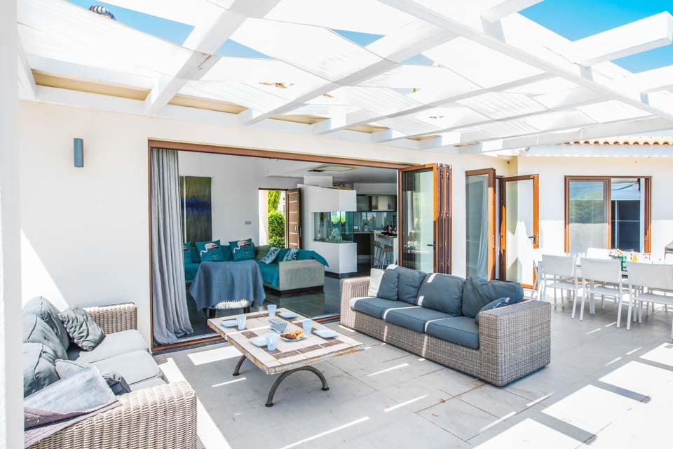 Denne fantastiske eiendommen er fordelt på ett plan og passer perfekt for alle aldre. Når du kommer inn, blir du møtt av den store, stilfulle stuen som har en komfortabel sittegruppe omgitt av store terrassedører som fører ut til den terrassebelagte sittegruppen. Dette fører rundt til et moderne spise- og kjøkkenområde, fullt utstyrt med alt som trengs for et komfortabelt selvhusholdningsopphold, inkludert en frokostbar med plass til 8 personer. Møblene og innredningen er veldig moderne og stilig, noe som gjør at det føles som «hjem borte fra hjemmet».
