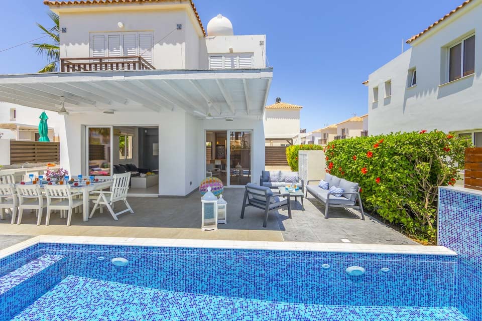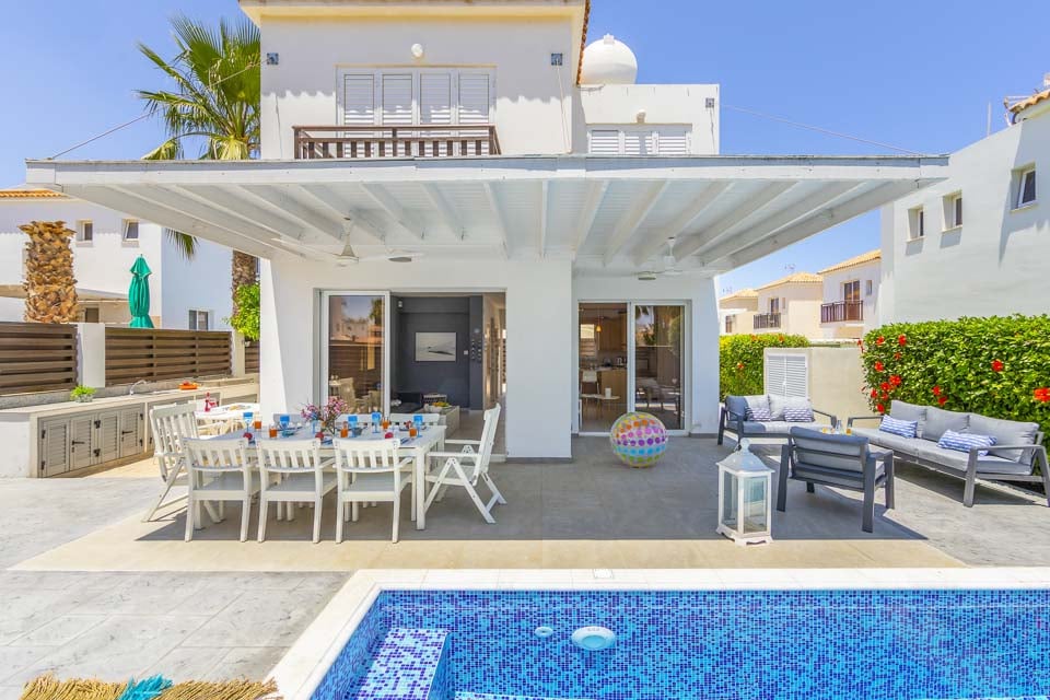 Innvendig er villaen hjemmekoselig, med innslag av hvitt og blått som skaper en gresk marine-vibe. Med klimaanlegg overalt, et fullt utstyrt kjøkken og gratis bassenghåndklær, er denne villaen godt utstyrt for å gjøre din selvhusholdningsferie så enkel som mulig.