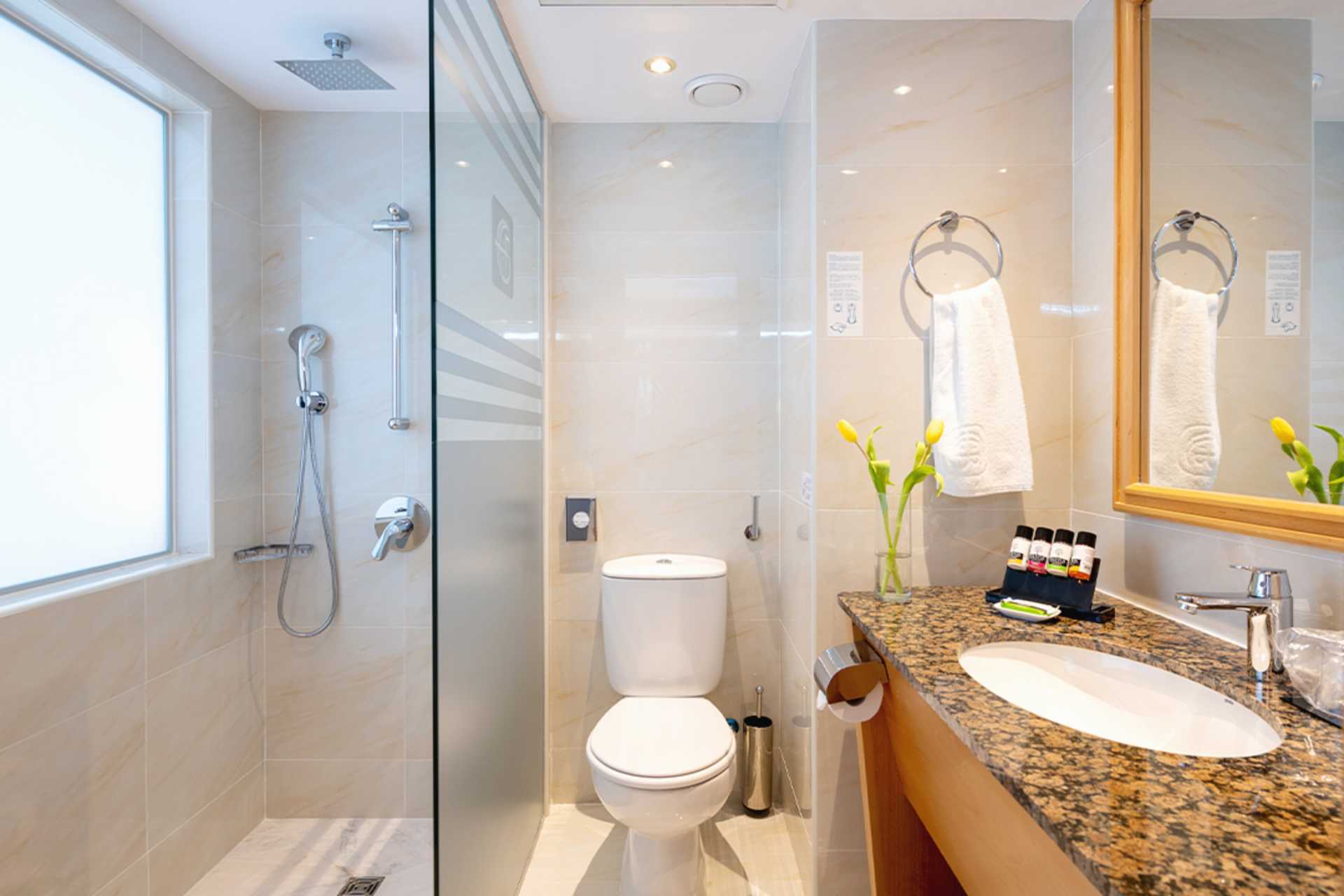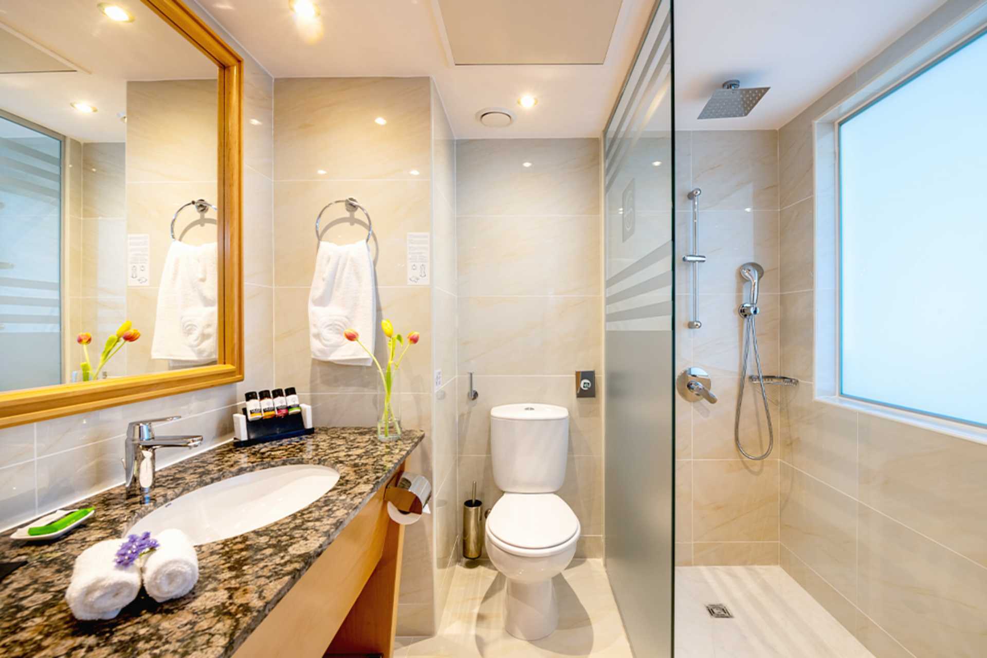 Familiesuite med balkong og havutsikt. Et soverom og en stue. En dobbeltseng eller to enkeltsenger. Mulig med ekstrasenger i sovesofa. Wifi, luftkondisjonering og safe er inkludert. Kjøleskap. Vannkoker samt kaffe og te. Espressomaskin – kapsler er ikke inkludert, men kan kjøpes på hotellet. TV. Strykejern og strykebrett. Hårføner. Badekåper og tøfler. To bad, begge med badekar og wc. Rengjøring 7 ggr/uke.