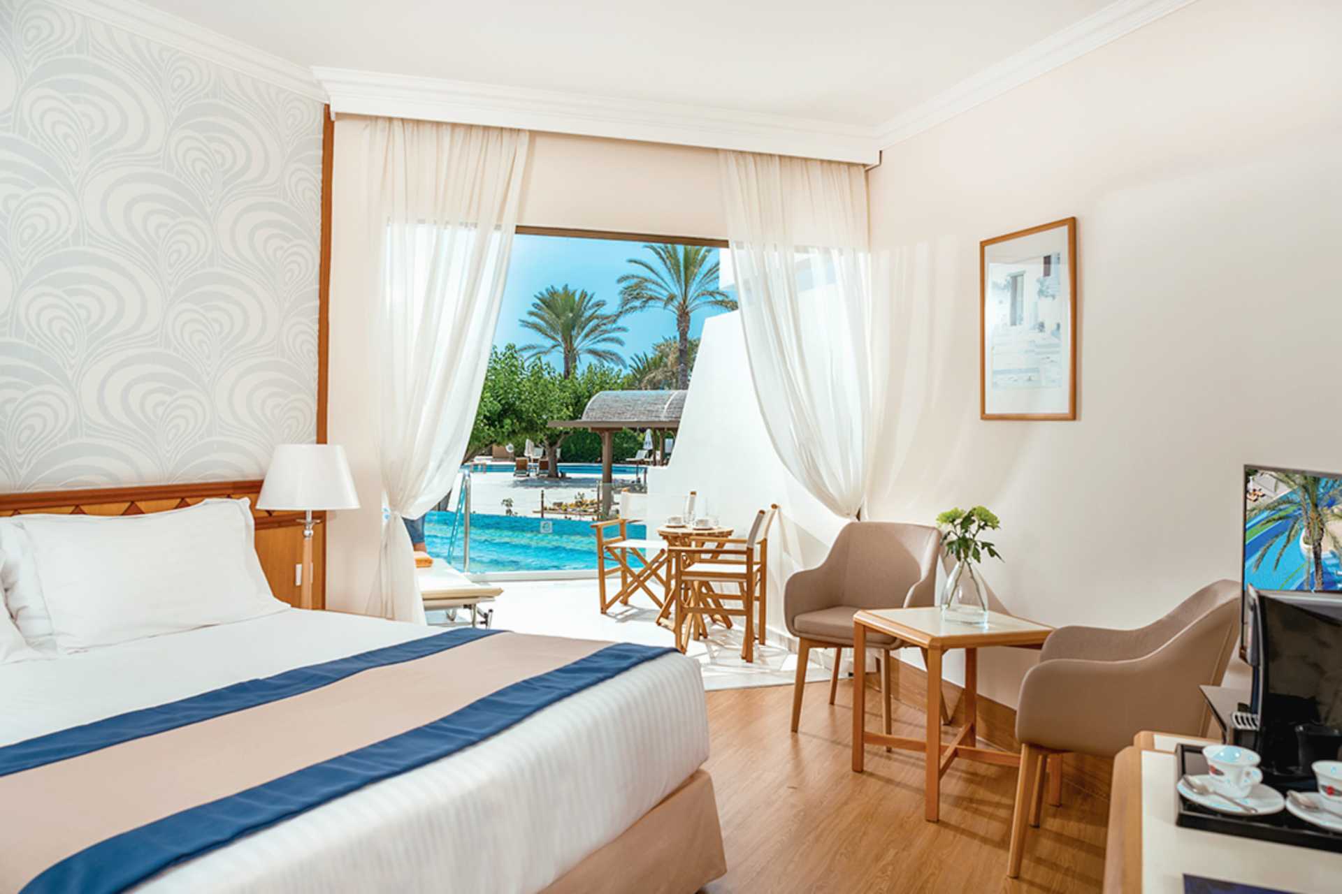 Superiorrom med markterrasse og utgang til delt basseng. En dobbeltseng eller to enkeltsenger samt mulighet for en ekstraseng. Wifi, luftkondisjonering og safe er inkludert. Kjøleskap. Vannkoker samt kaffe og te. Espressomaskin – kapsler er ikke inkludert, men kan kjøpes på hotellet. TV. Strykejern og strykebrett. Hårføner. Badekåper og tøfler. Dusj og wc. Rengjøring 7 ggr/uke.