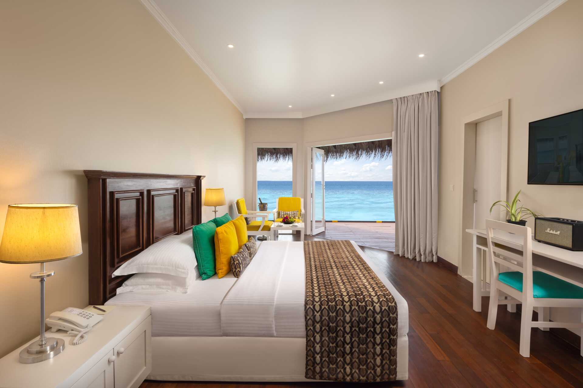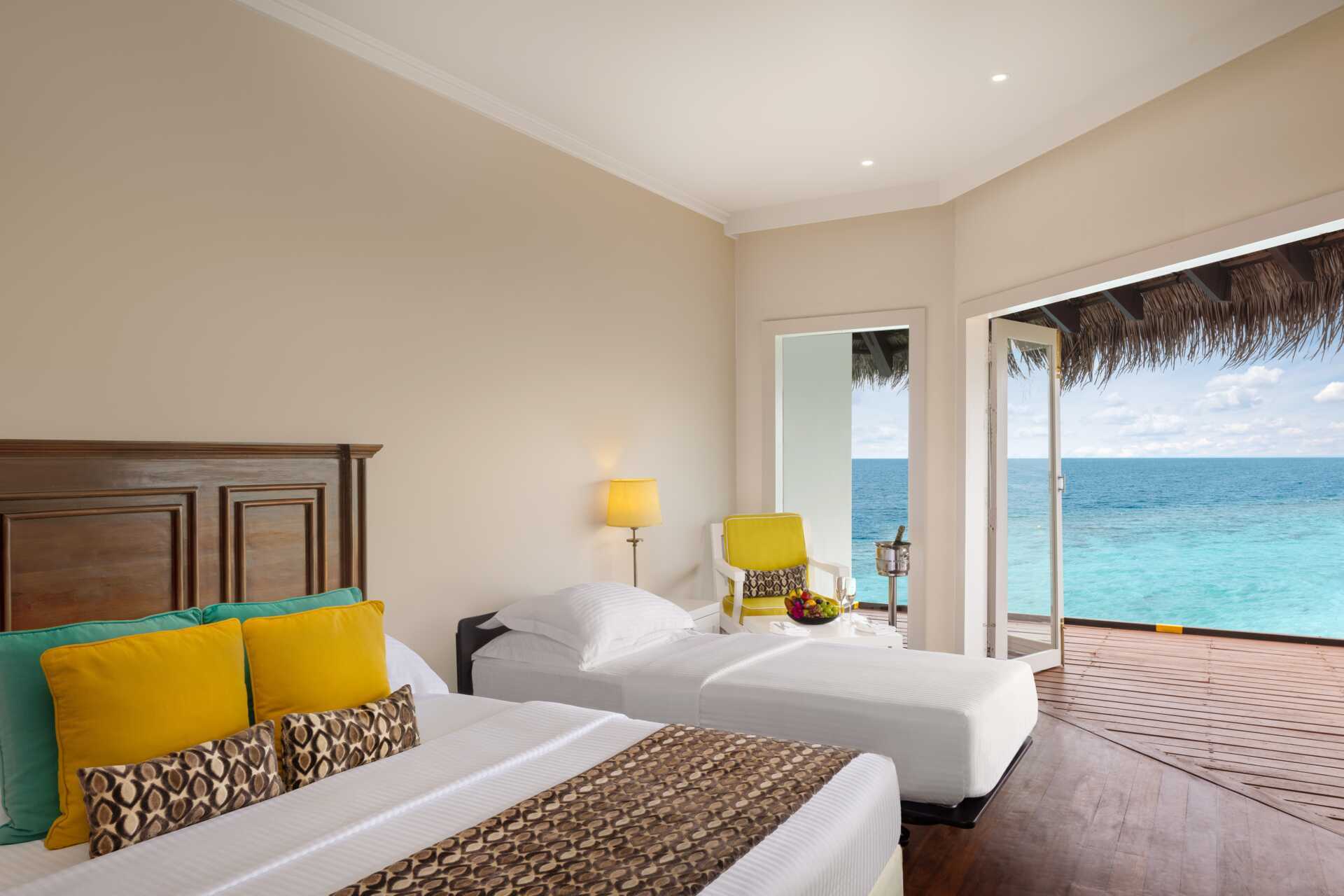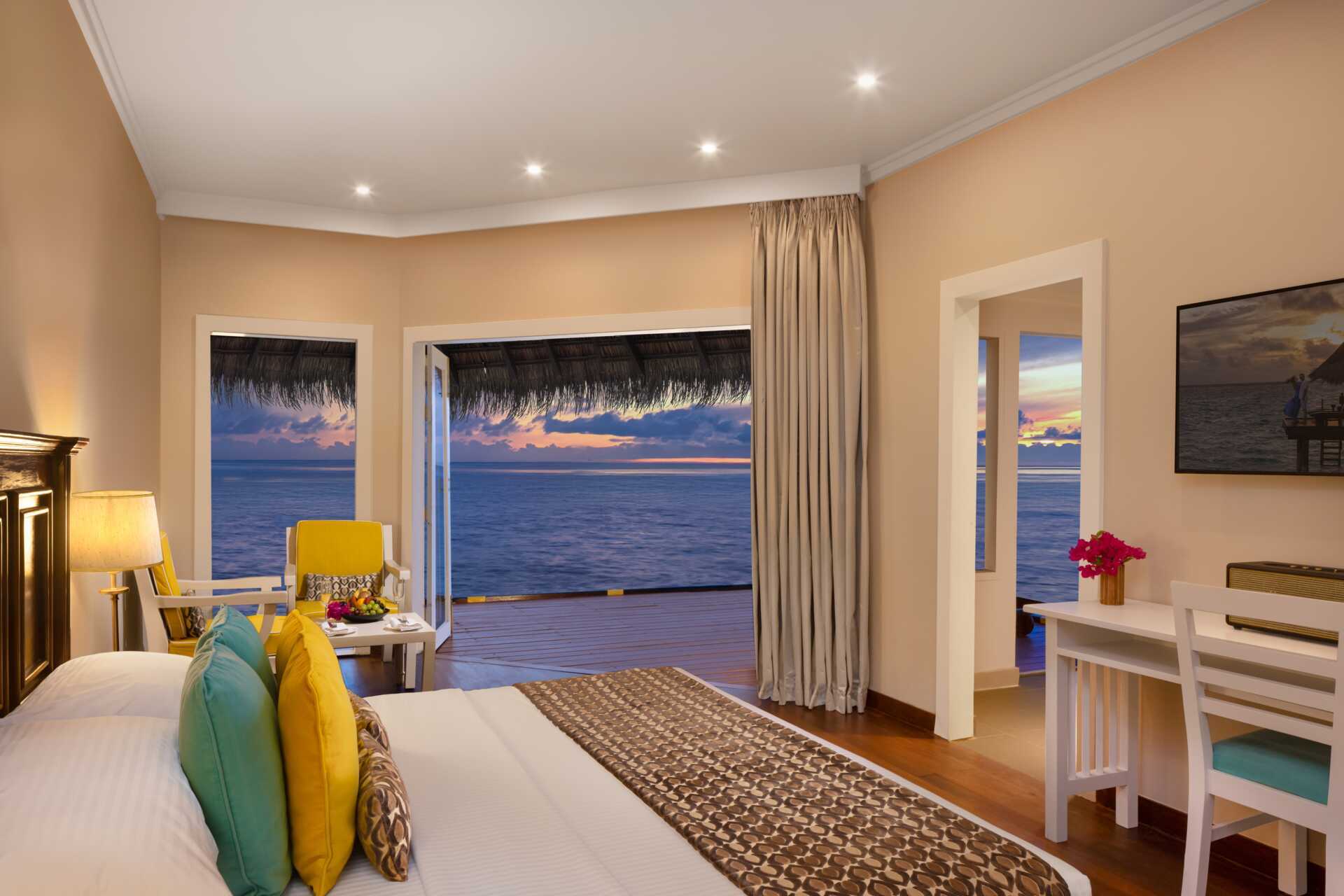 Water villa med solterrasse, solsenger og stige rett ut i Det indiske hav. En dobbeltseng. Mulig med ekstraseng til én person. Wifi, luftkondisjonering og safe. Kjøleskap. Vannkoker samt kaffe og te. TV. Hårføner. Dusj og wc. Rengjøring 7 ggr/uke.
