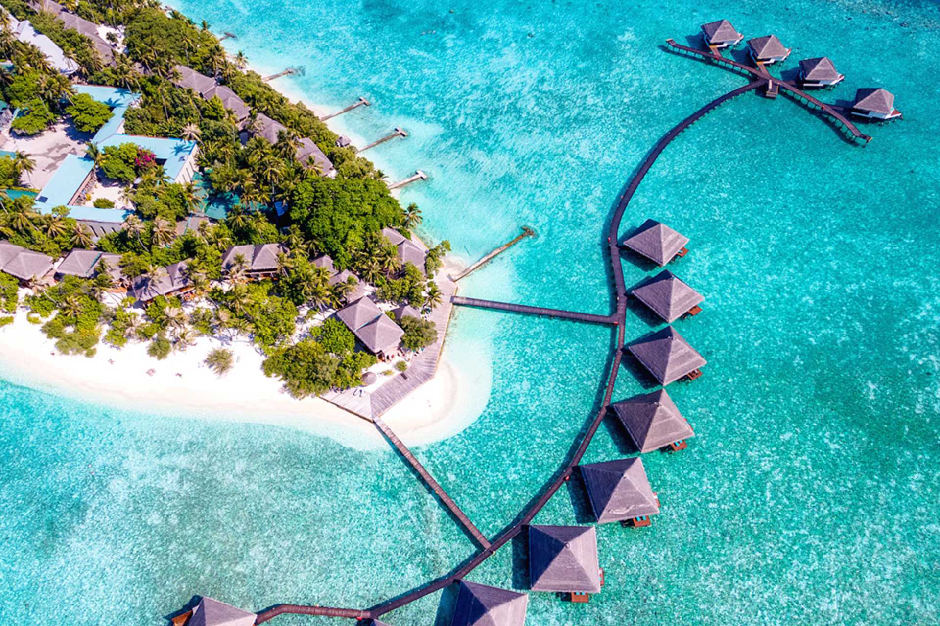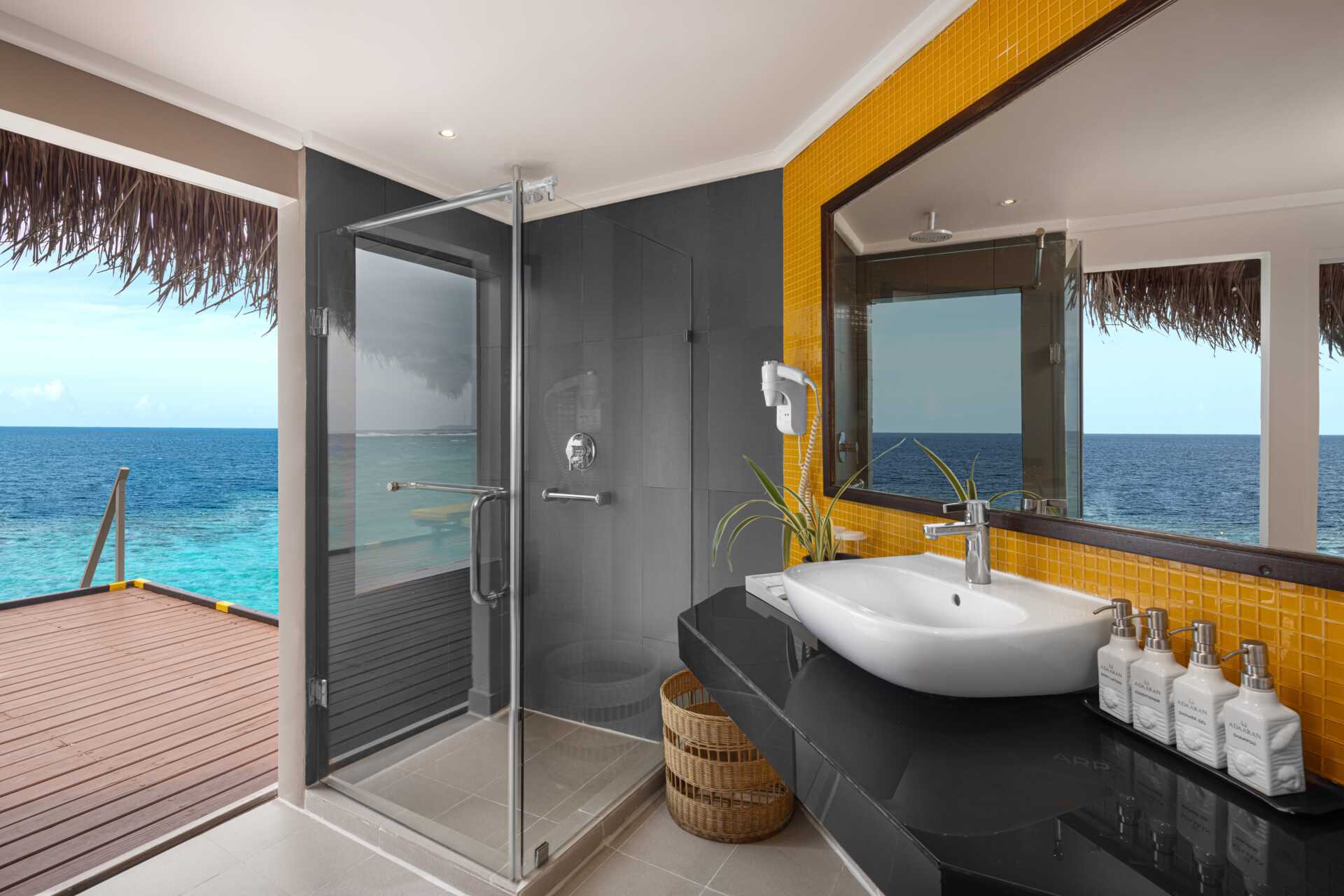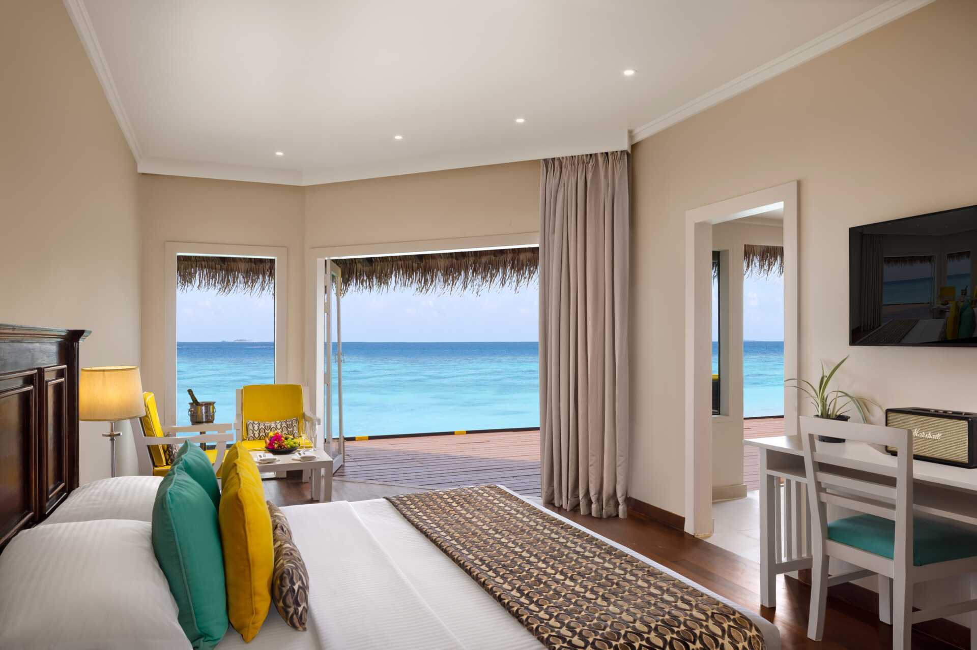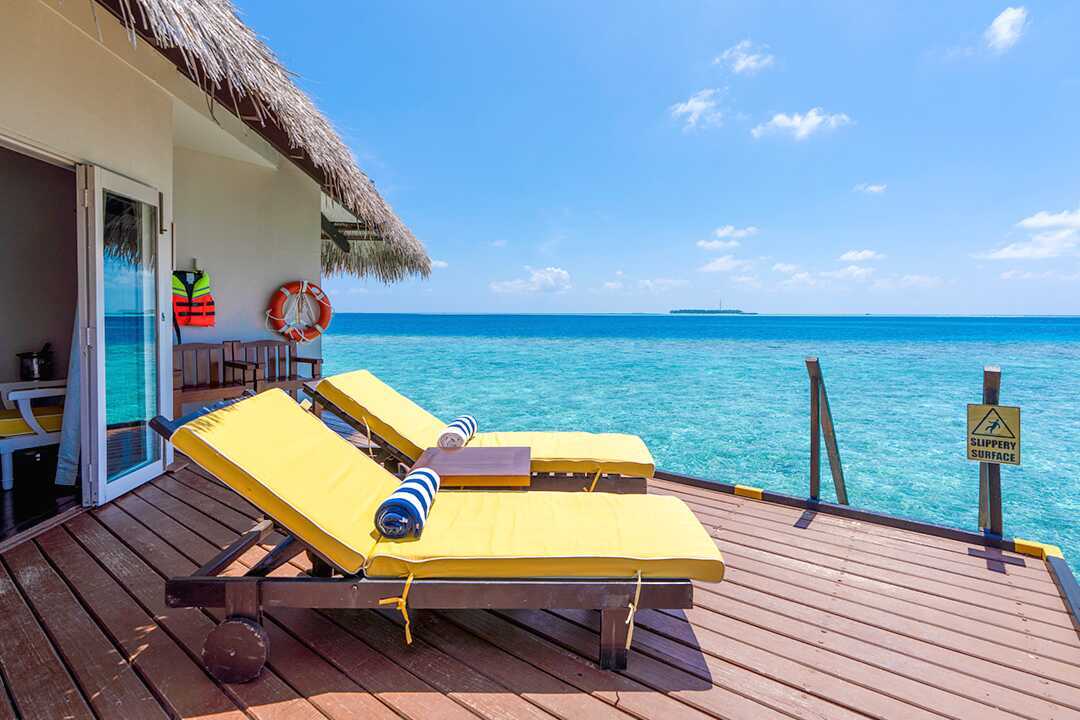 Water villa med solterrasse, solsenger og stige rett ut i Det indiske hav. En dobbeltseng. Mulig med ekstraseng til én person. Wifi, luftkondisjonering og safe. Kjøleskap. Vannkoker samt kaffe og te. TV. Hårføner. Dusj og wc. Rengjøring 7 ggr/uke.