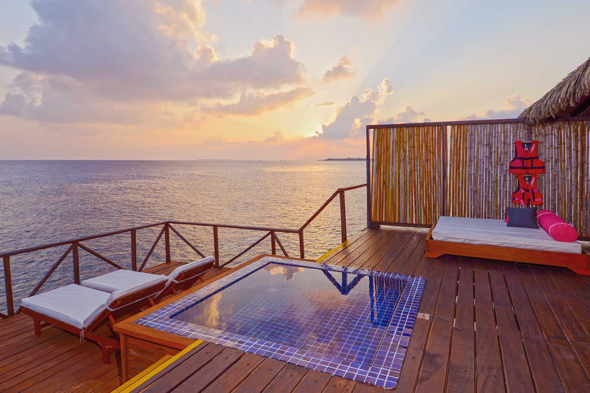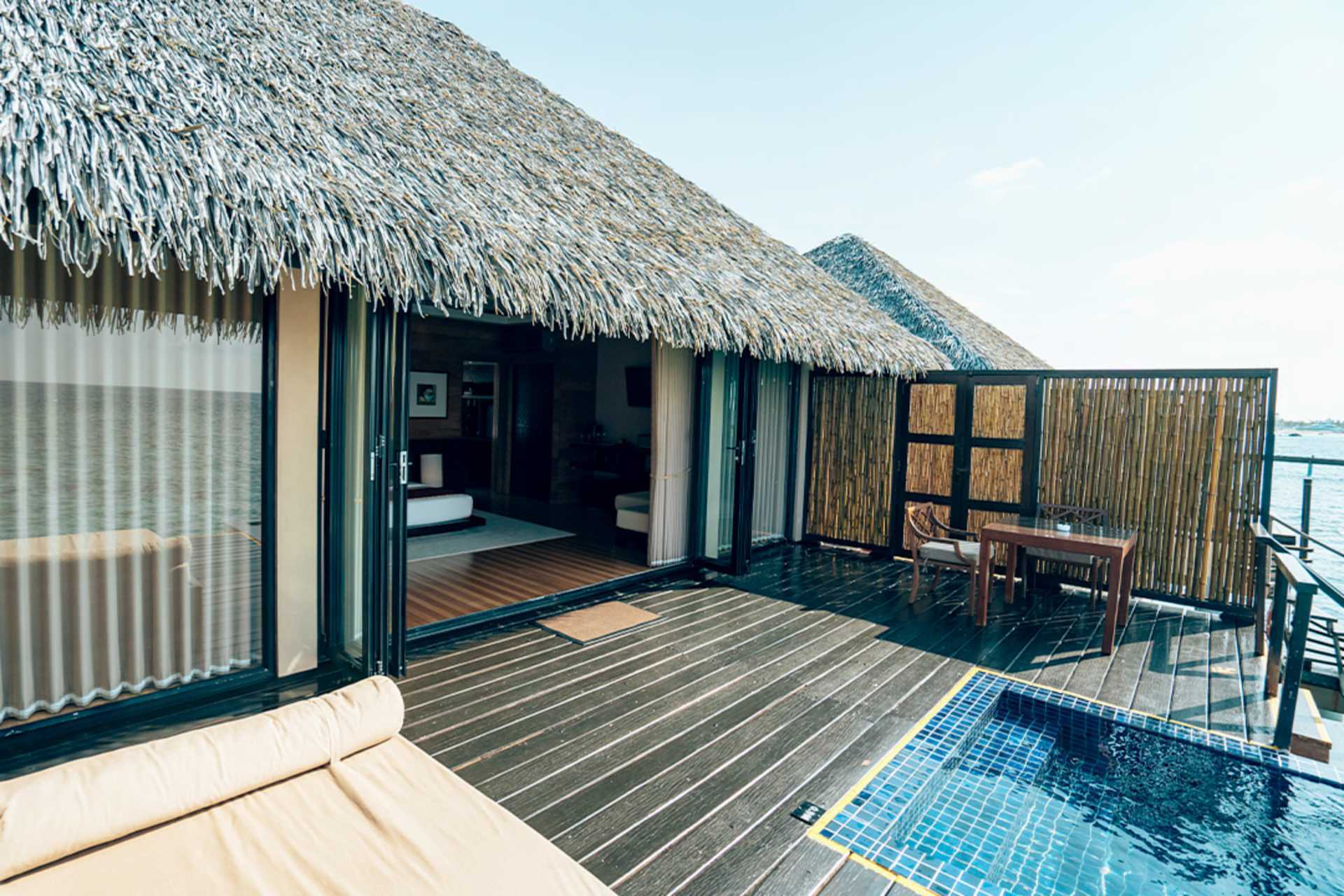 Water Villa Deluxe med solterrasse, et lite stupebasseng og en stige ned i havet. En dobbeltseng. Wifi, luftkondisjonering og safe inkludert. Minibaren er inkludert (fire bokser med øl, en liten flaske hvitvin og rødvin, juice, to flasker hver med Coca-Cola, tonic, brus og bitter lemon) og fylles på én gang daglig. Rommet har også frisk frukt, sjokolade og chips, som etterfylles daglig. Vannkoker samt kaffe og te. Espresso-maskin, kapsler inkludert og etterfylles hver dag. TV med internasjonale kanaler. Hårføner. Baderom med jacuzzi, separat dusj og wc. Rengjøring 7 ggr/uke.