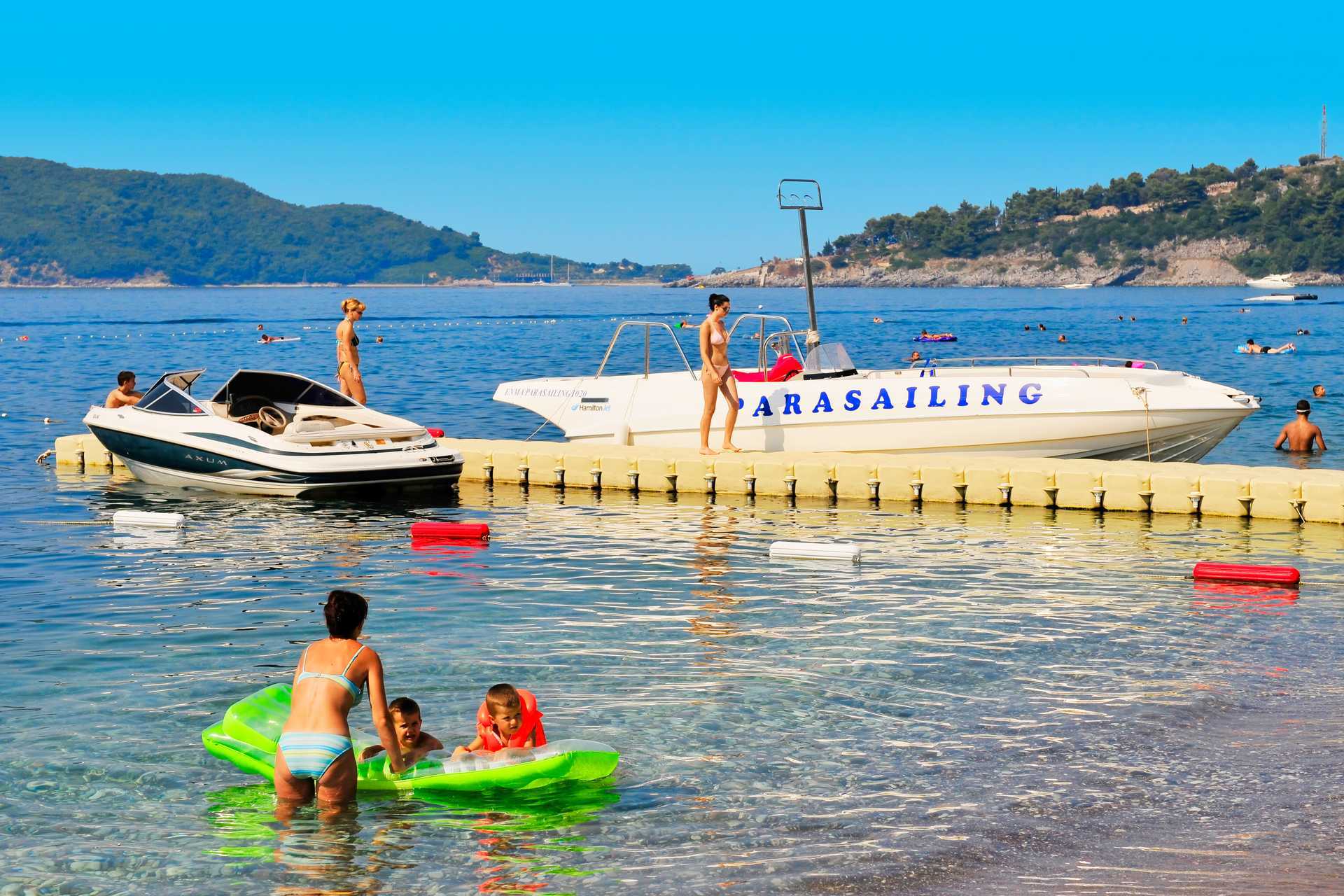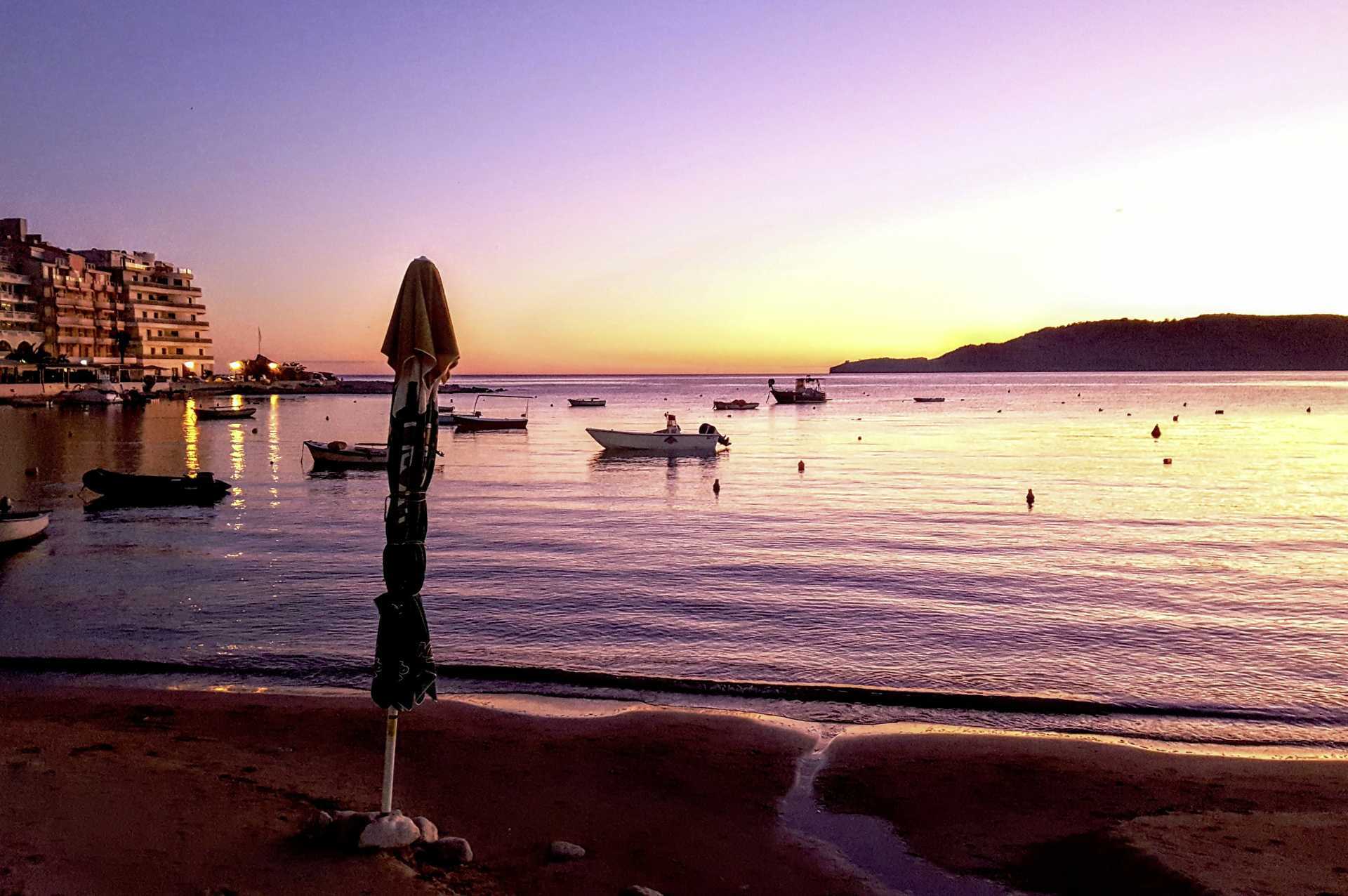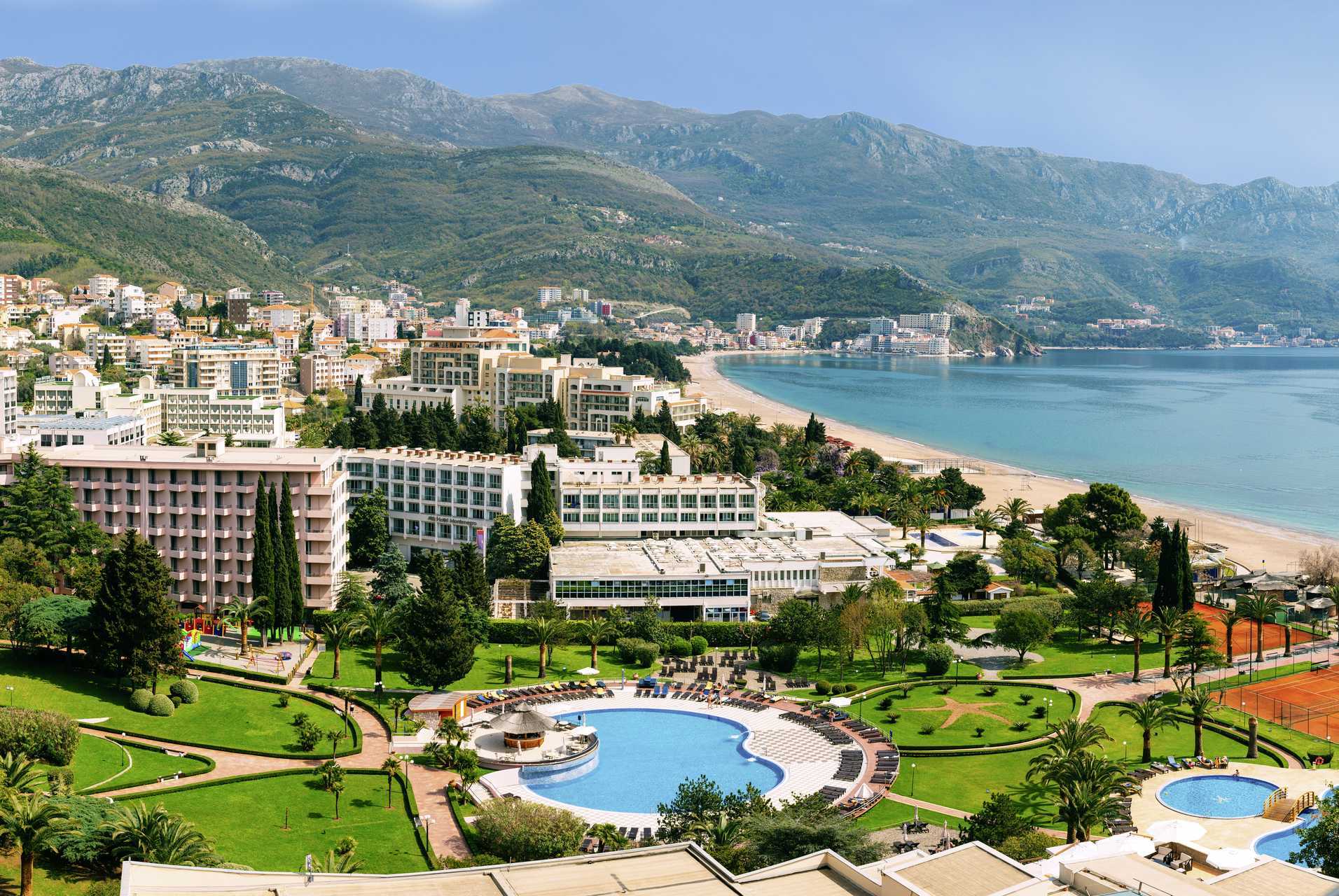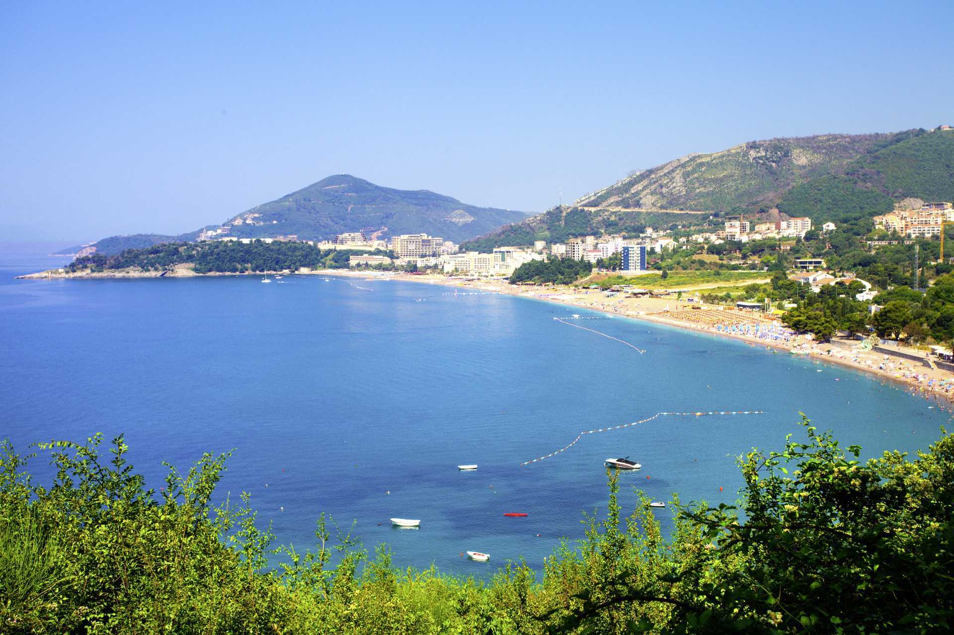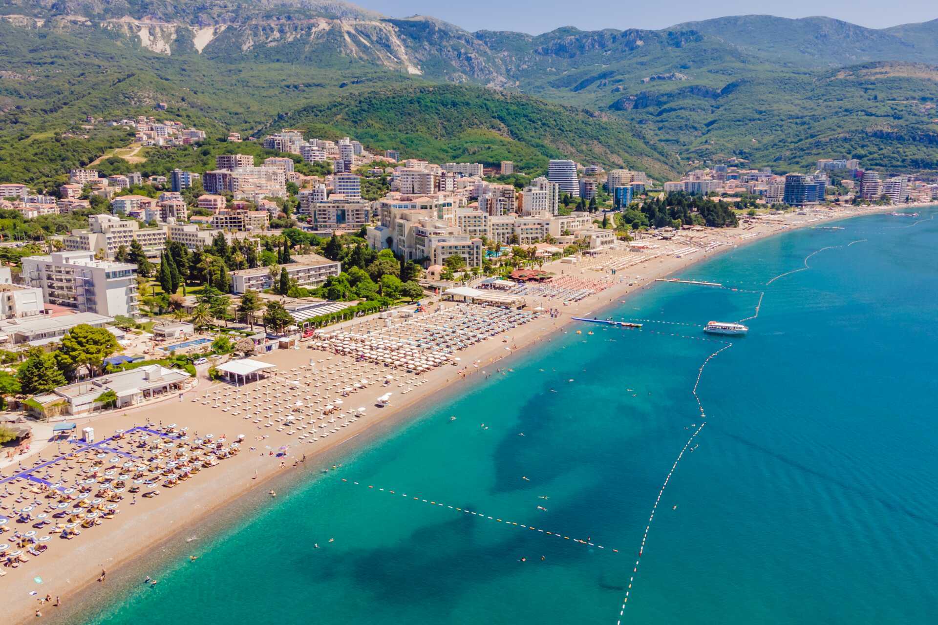 Bečići har en lang, grovkornet sandstrand, hvor deler av den tilhører hotellene. Solsenger og parasoller mot avgift.