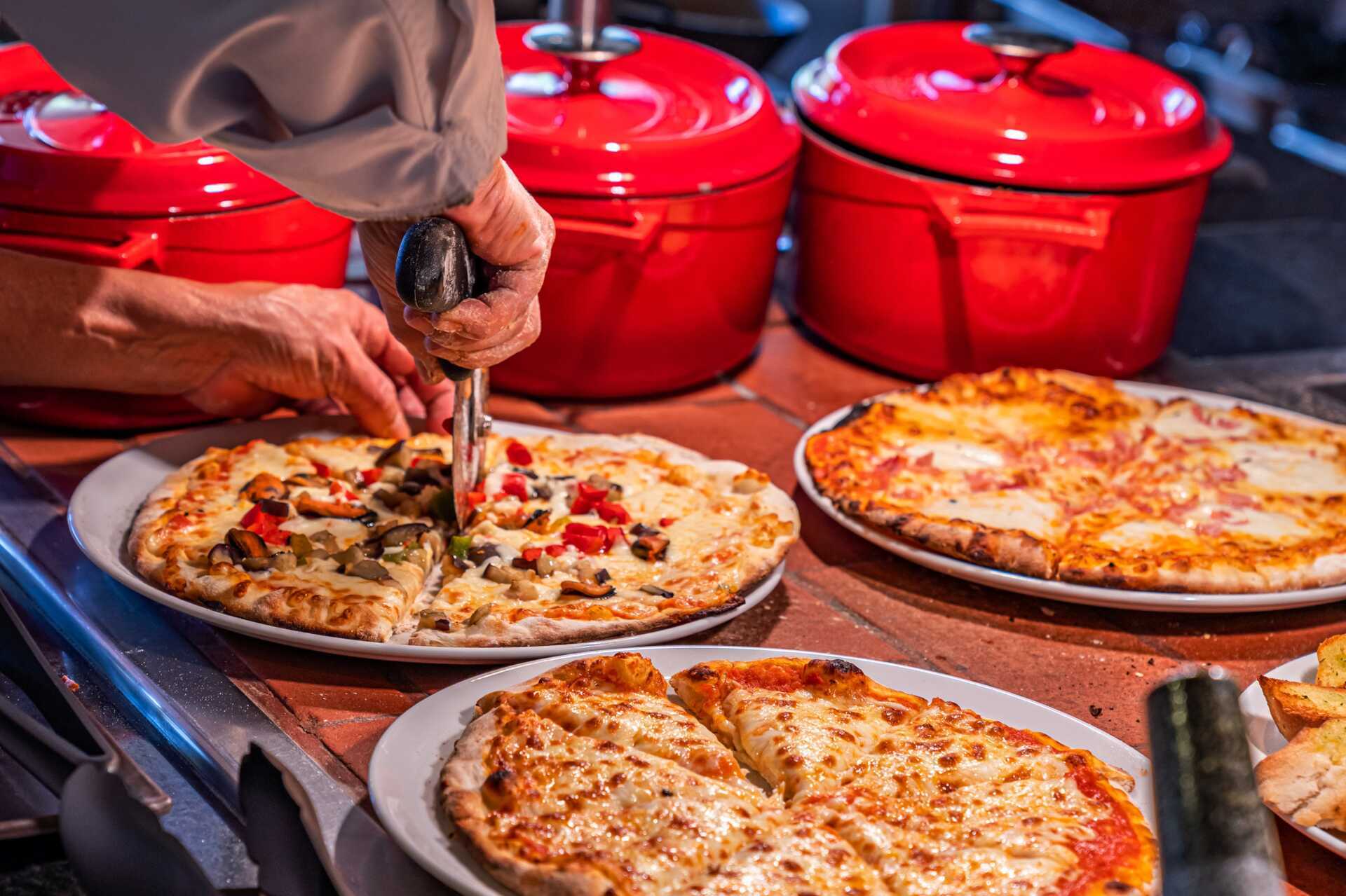 Hamburgere, pizza, smørbrød, kaker, frukt, iskrem i bufférestauranten Azeitona kl. 12.00-19.00.