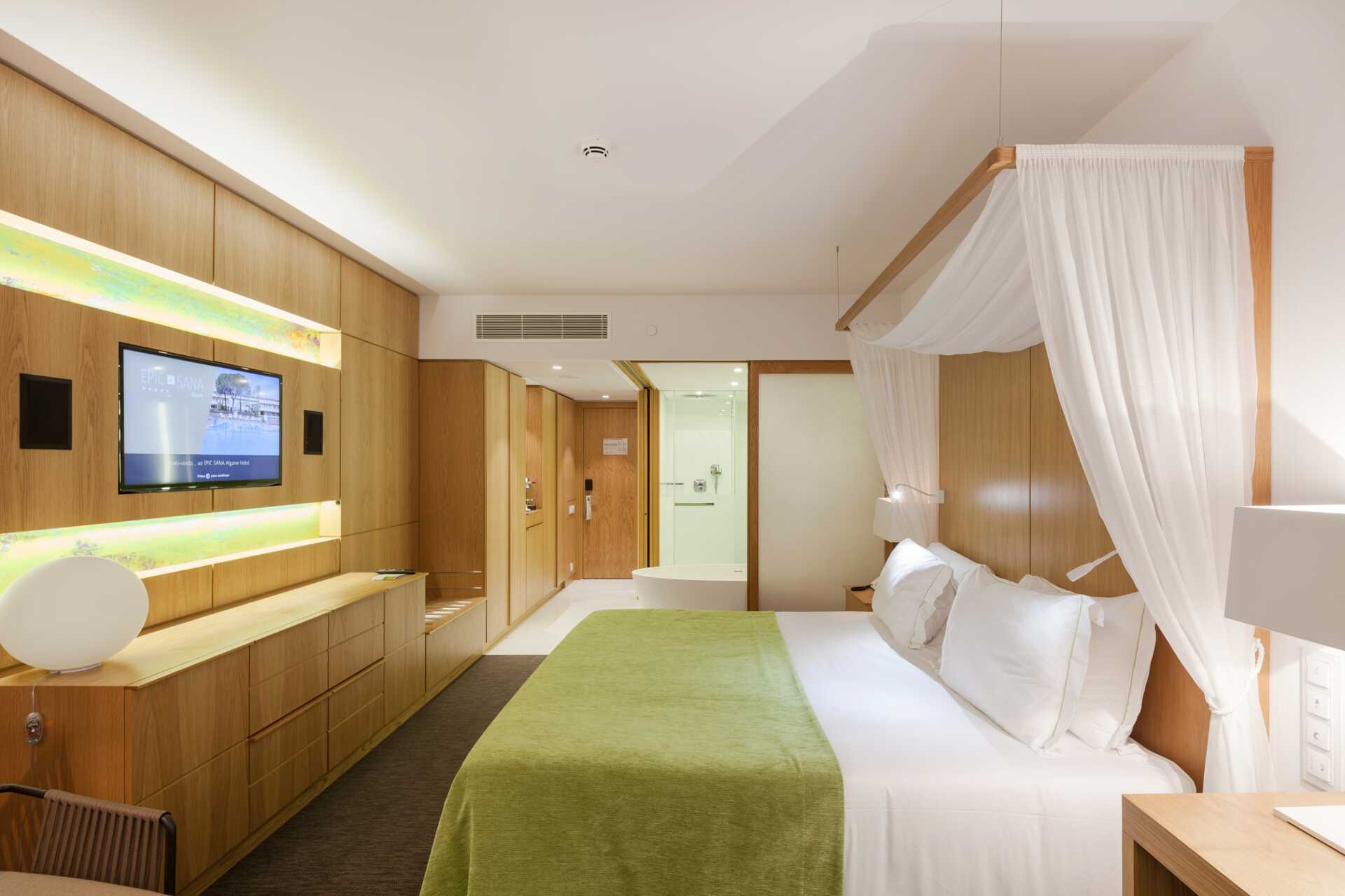 Deluxerom med balkong eller terrasse, noen vender mot havet og noen mot bassenget, men grøntområder hindrer utsikten. Wifi, luftkondisjonering og safe inkludert. To enkeltsenger eller en dobbeltseng. Minibar. Nespresso kaffemaskin med kapsler. TV. Hårføner. Badekåper og tøfler. Bad med badekar, separat dusj og wc. Rengjøring 7 ggr/uke. Barn under 2 år regnes inn i maksantallet i rommet.
