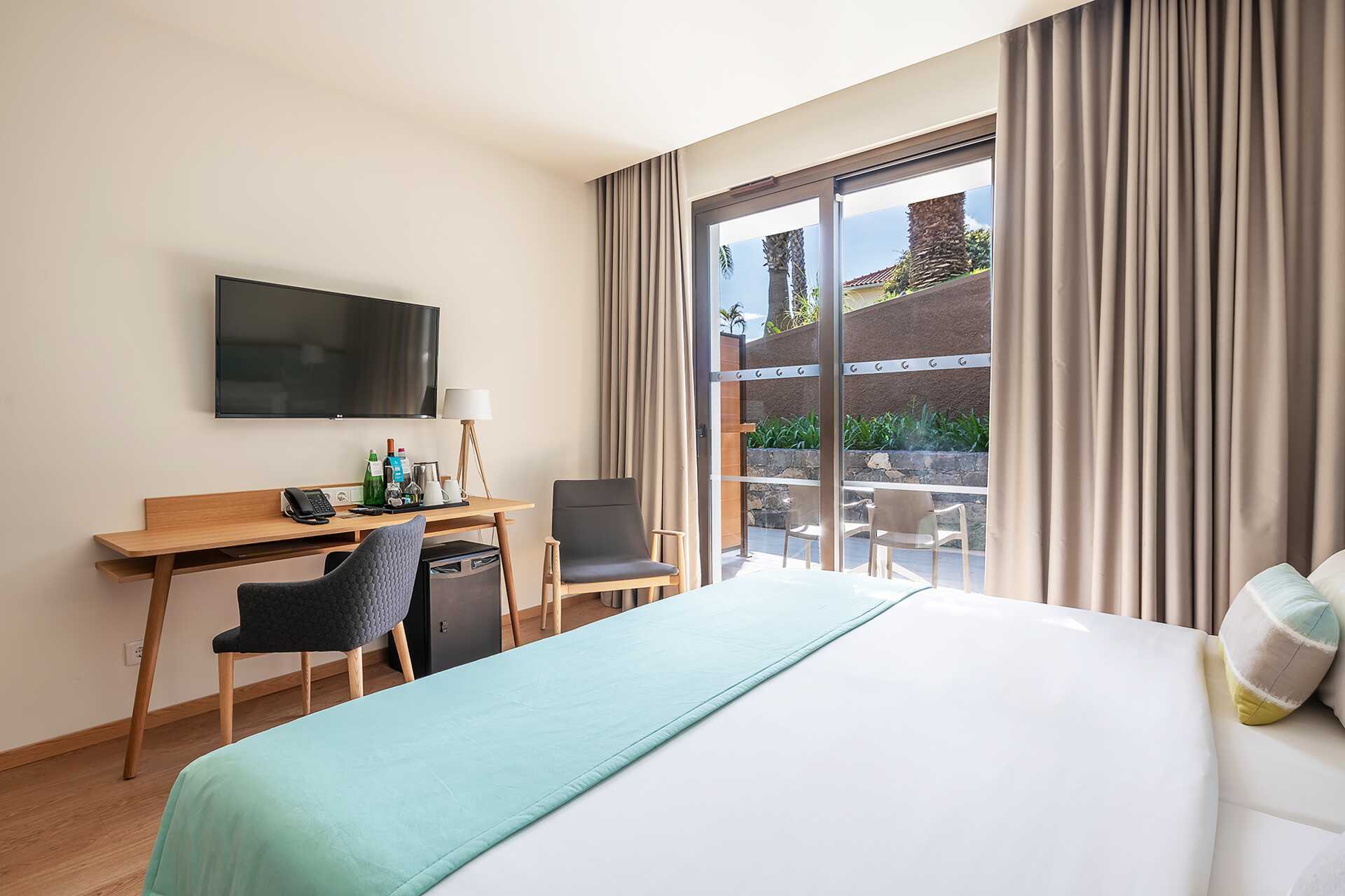 Dobbeltrom med hageutsikt og balkong eller terrasse. En dobbeltseng eller to enkeltsenger. Putemeny. Wifi, luftkondisjonering og safe inkludert. Vannkoker samt kaffe og te. Kjøleskap. TV. Hårføner. Dusj og wc. Rengjøring 7 ggr/uke.