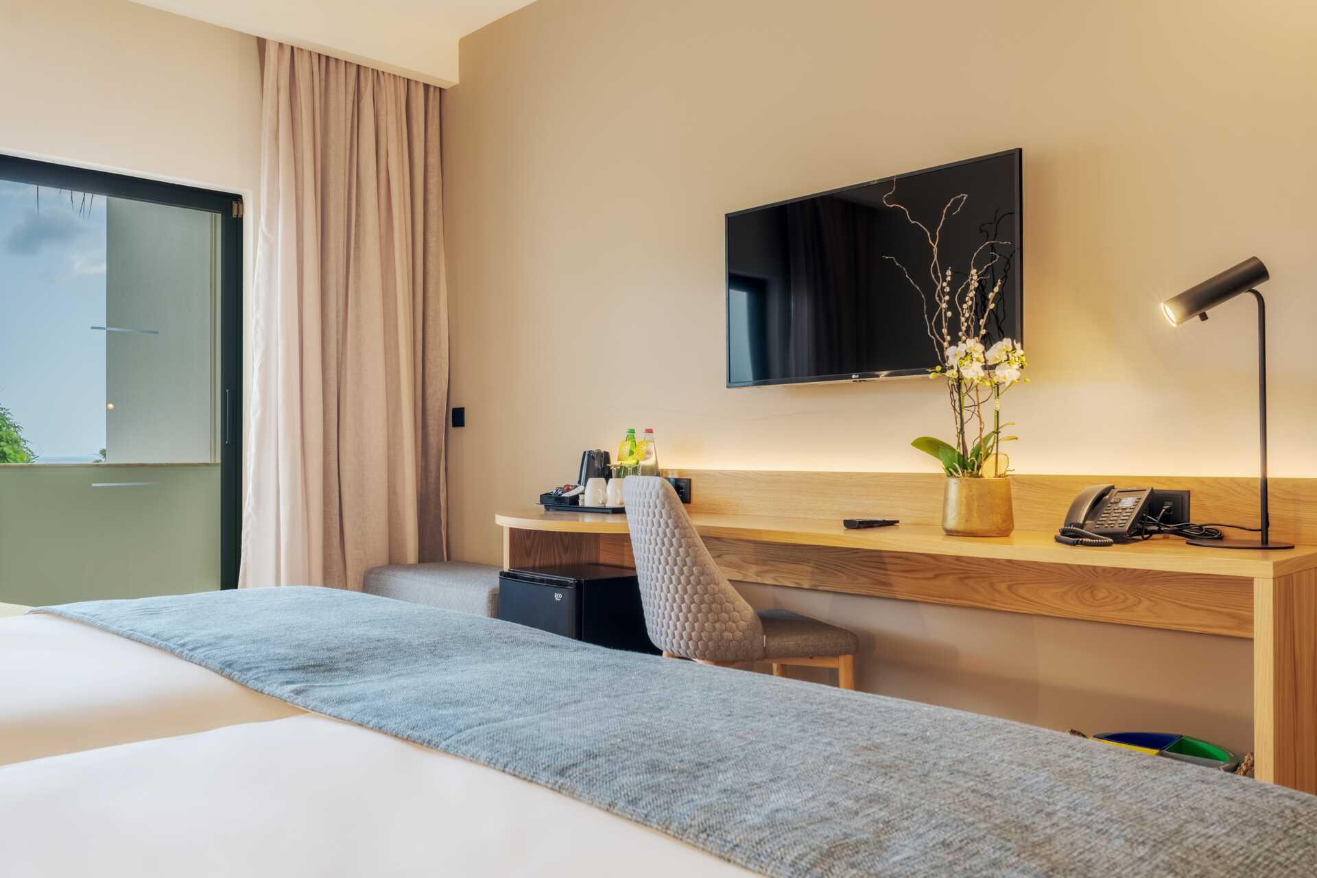 Dobbeltrom med balkong eller terrasse med havutsikt. En dobbeltseng eller to enkeltsenger. Mulig med en ekstraseng i sovesofa. Putemeny. Wifi, luftkondisjonering og safe inkludert. Kjøleskap. Vannkoker samt kaffe og te. TV. Hårføner. Dusj og wc. Rengjøring 7 ggr/uke.