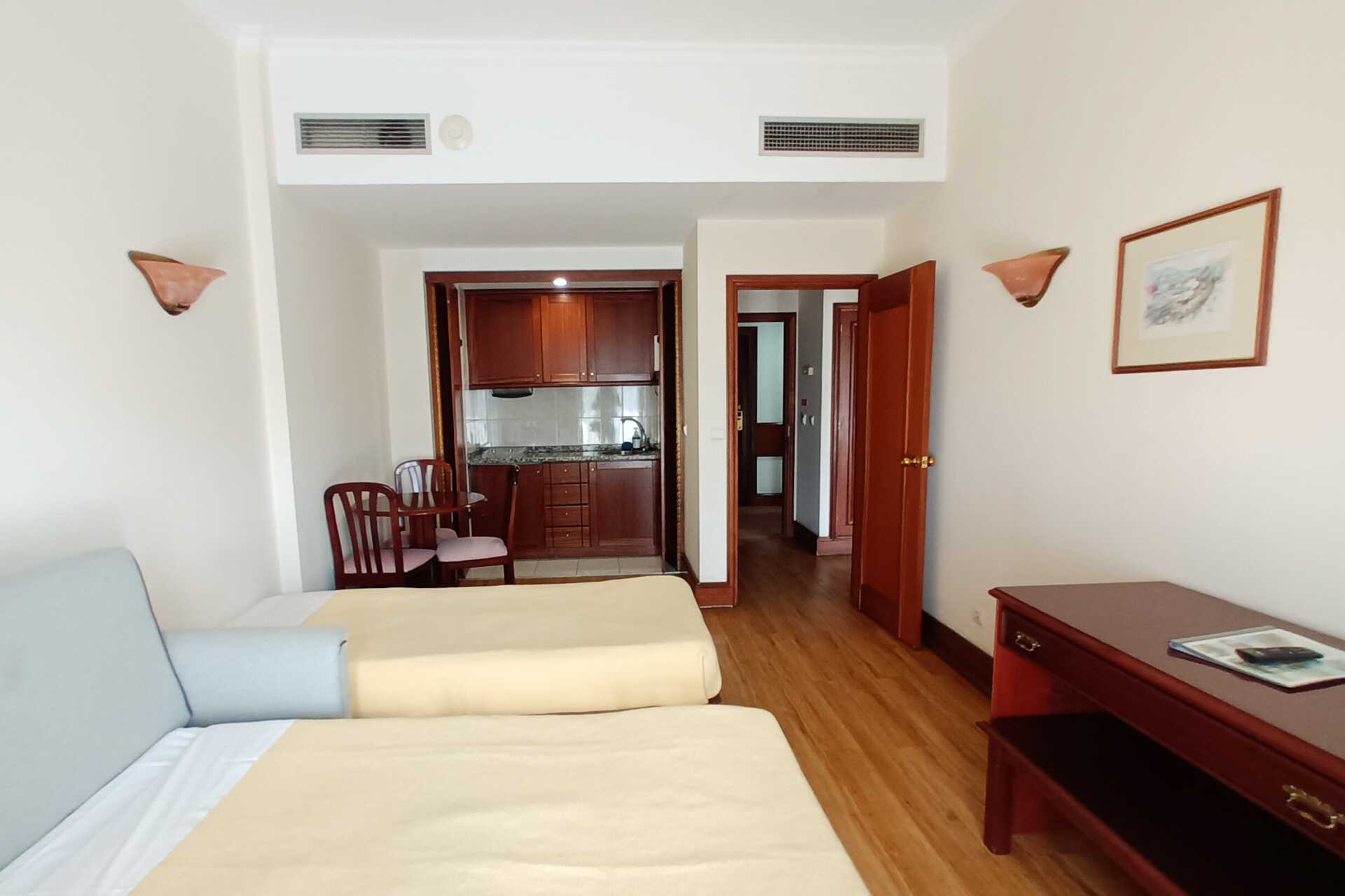 Ettromsleilighet med balkong. Minikjøkken. To enkeltsenger. Mulig med en ekstraseng i sovesofa. Minikjøkken med kokeplater, kjøleskap og enkelt kjøkkenutstyr. Wifi og luftkondisjonering inkludert. Safe mot avgift. TV. Hårføner. Badekar og wc. Rengjøring 7 ggr/uke.