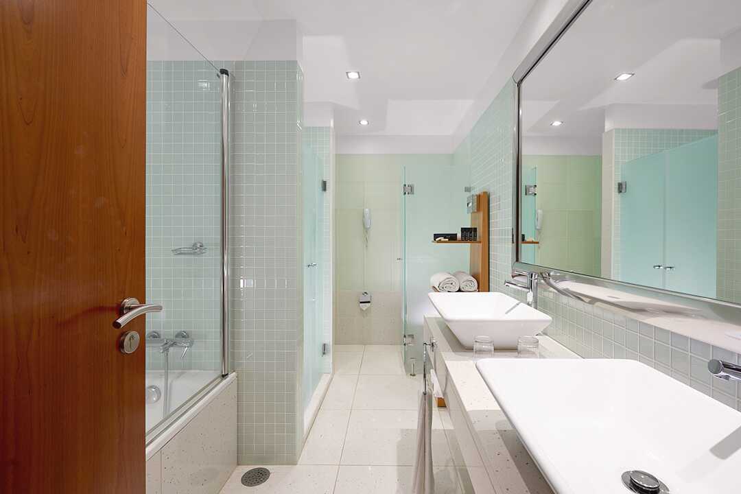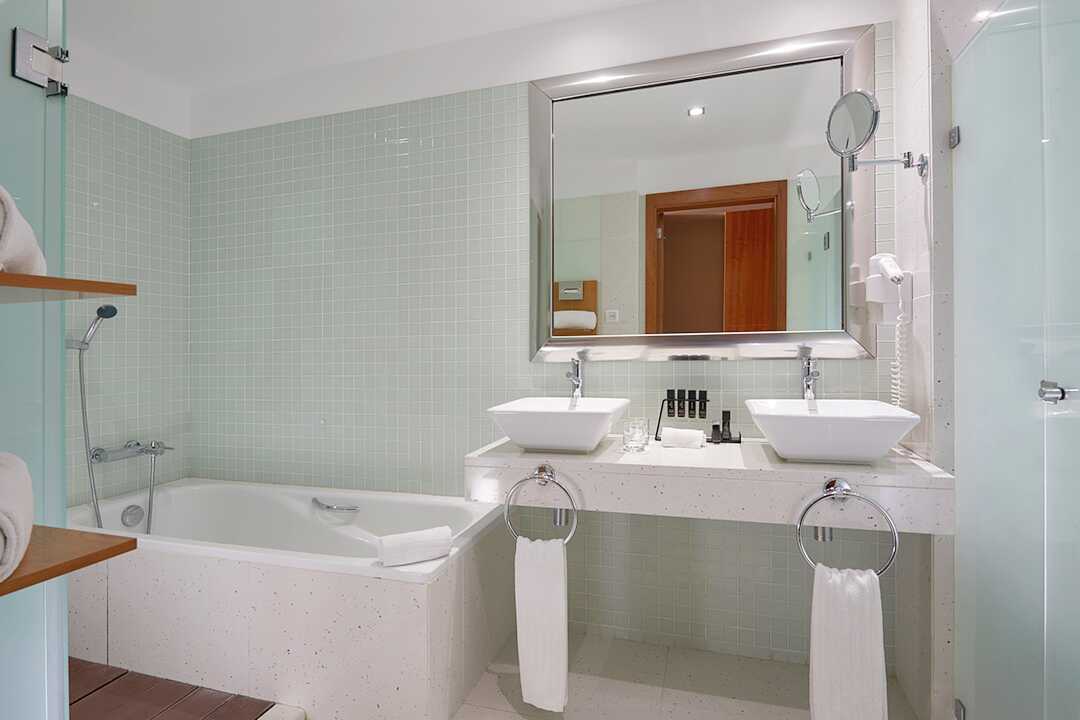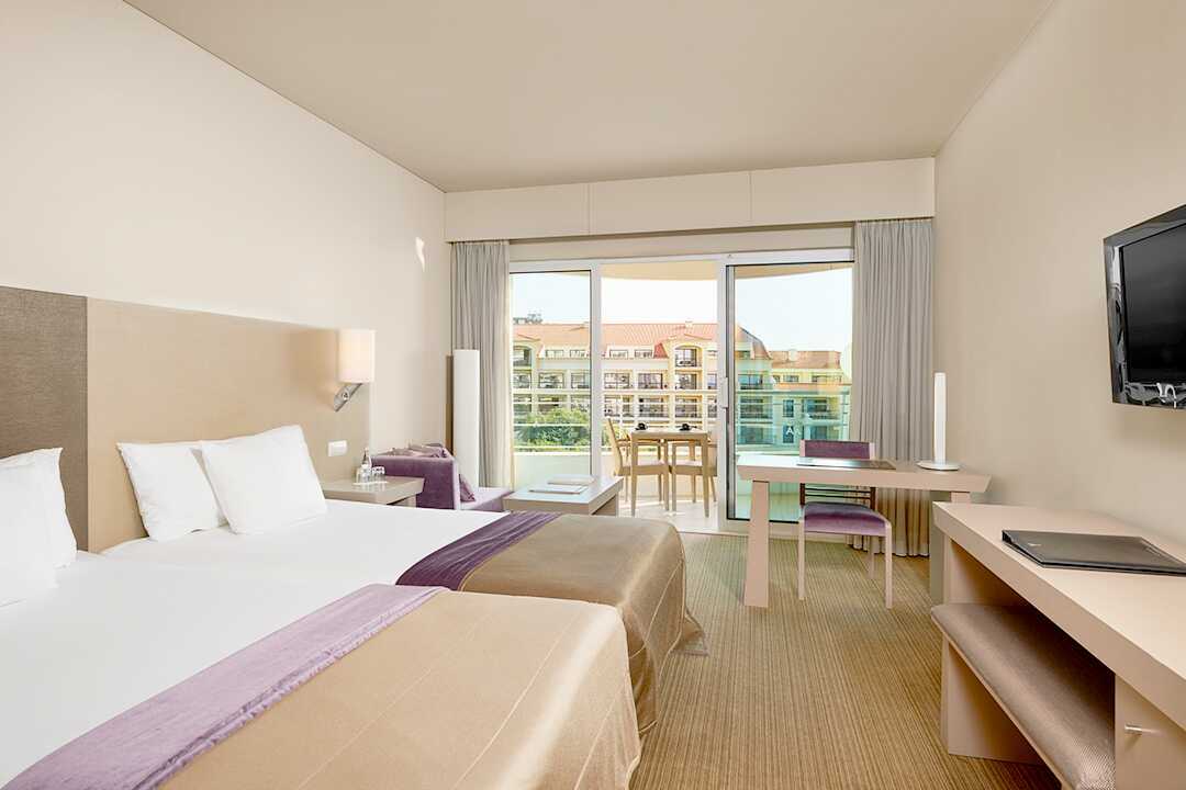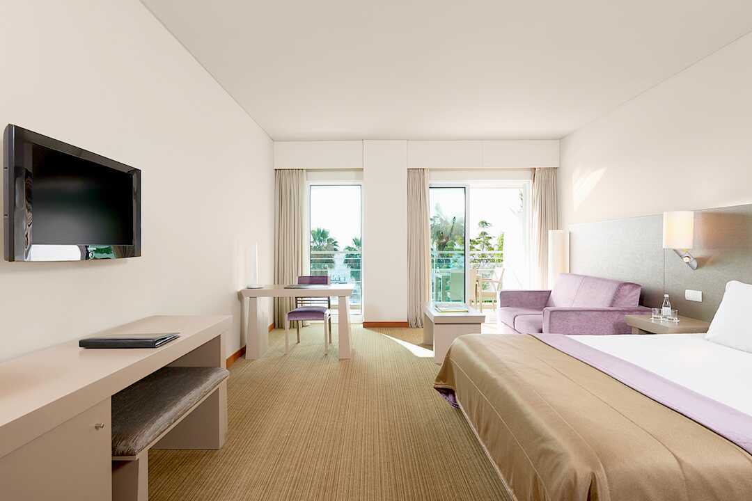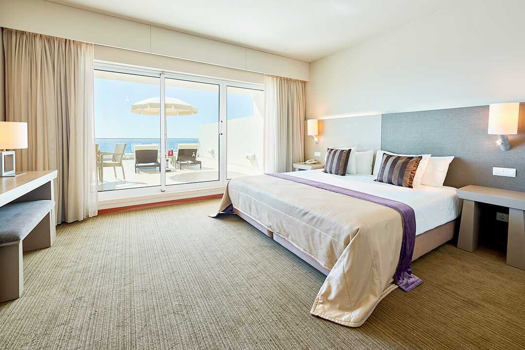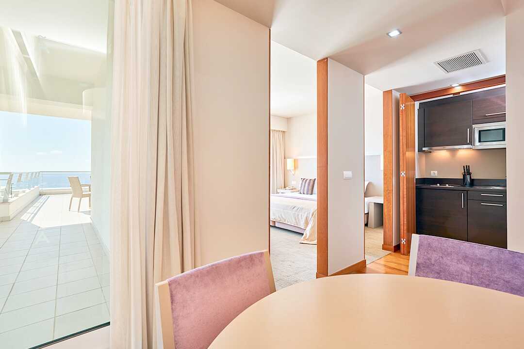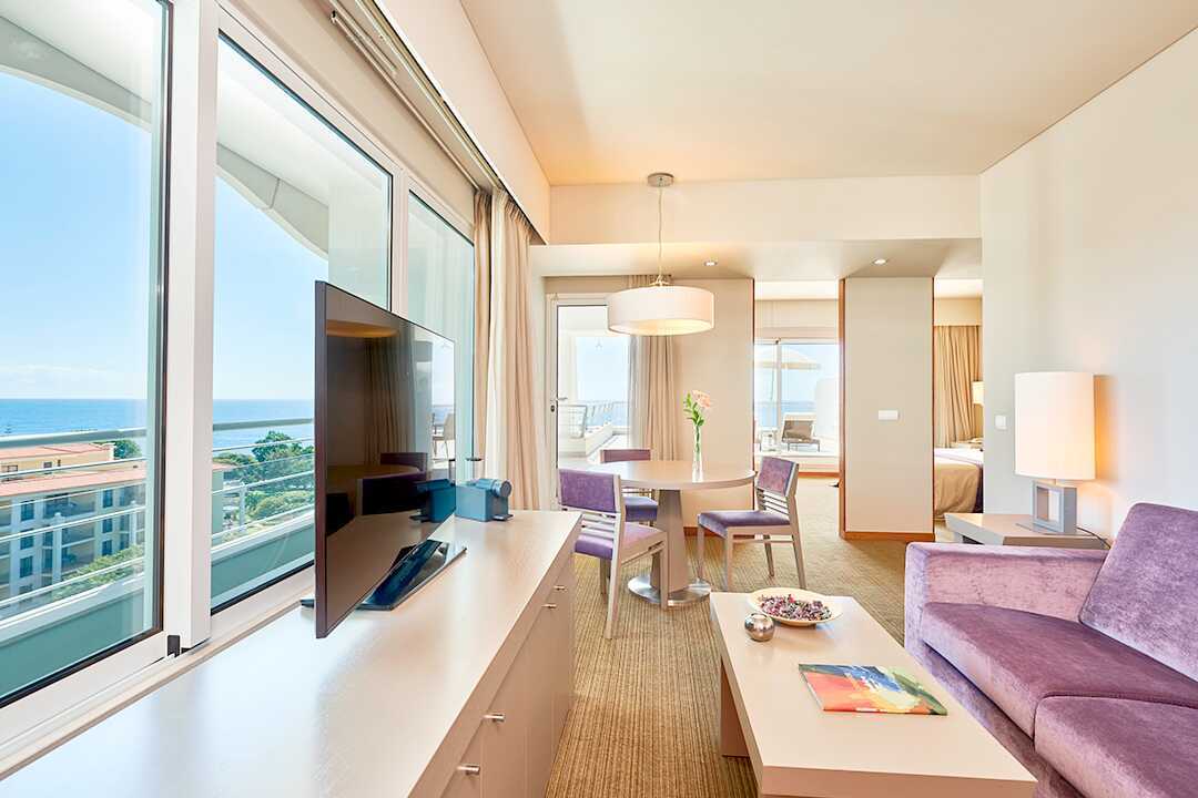 Suite med balkong eller terrasse og havutsikt. Suiten består av et soverom, en stue med minikjøkken og en stor terrasse (32 kvm) med solsenger, stoler og bord. En dobbeltseng eller to enkeltsenger. Mulig med en ekstraseng i sovesofa. Vegg-til-vegg-teppe. Minikjøkken med mikrobølgeovn, komfyr, kjøleskap, kaffetrakter, vannkoker med kaffe og te og enkelt kjøkkenutstyr. Wifi, luftkondisjonering og safe inkludert. TV. Hårføner. Badekar, separat dusj og wc. Rengjøring 7 ggr/uke. Barn under 2 år regnes inn i maksantallet i rommet.