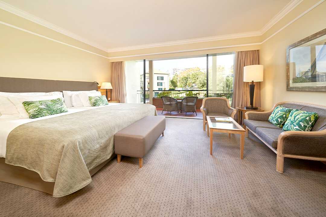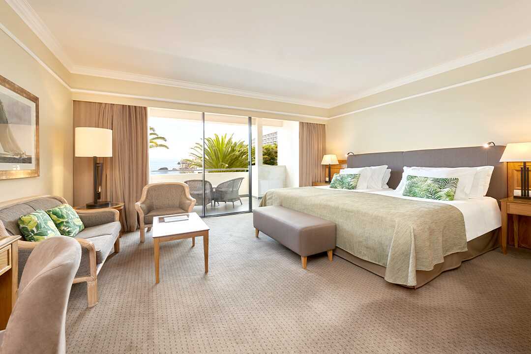 Deluxerom med balkong og havutsikt. Deluxerommene ligger i 1. til 5. etasje med utsikt over Funchal by, havnen og havet. To brede enkeltsenger eller en dobbeltseng. Mulig med ekstraseng i ordinære senger eller i enkeltseng. Wifi, luftkondisjonering og safe inkludert. Vegg-til-vegg-teppe. Minibar. Vannkoker samt kaffe og te. Nespresso kaffemaskin. TV. Badekåper og tøfler. Hårføner. Bad med badekar, separat dusj og wc. Rengjøring 7 ggr/uke. Barn under 2 år regnes inn i maksantallet i rommet.