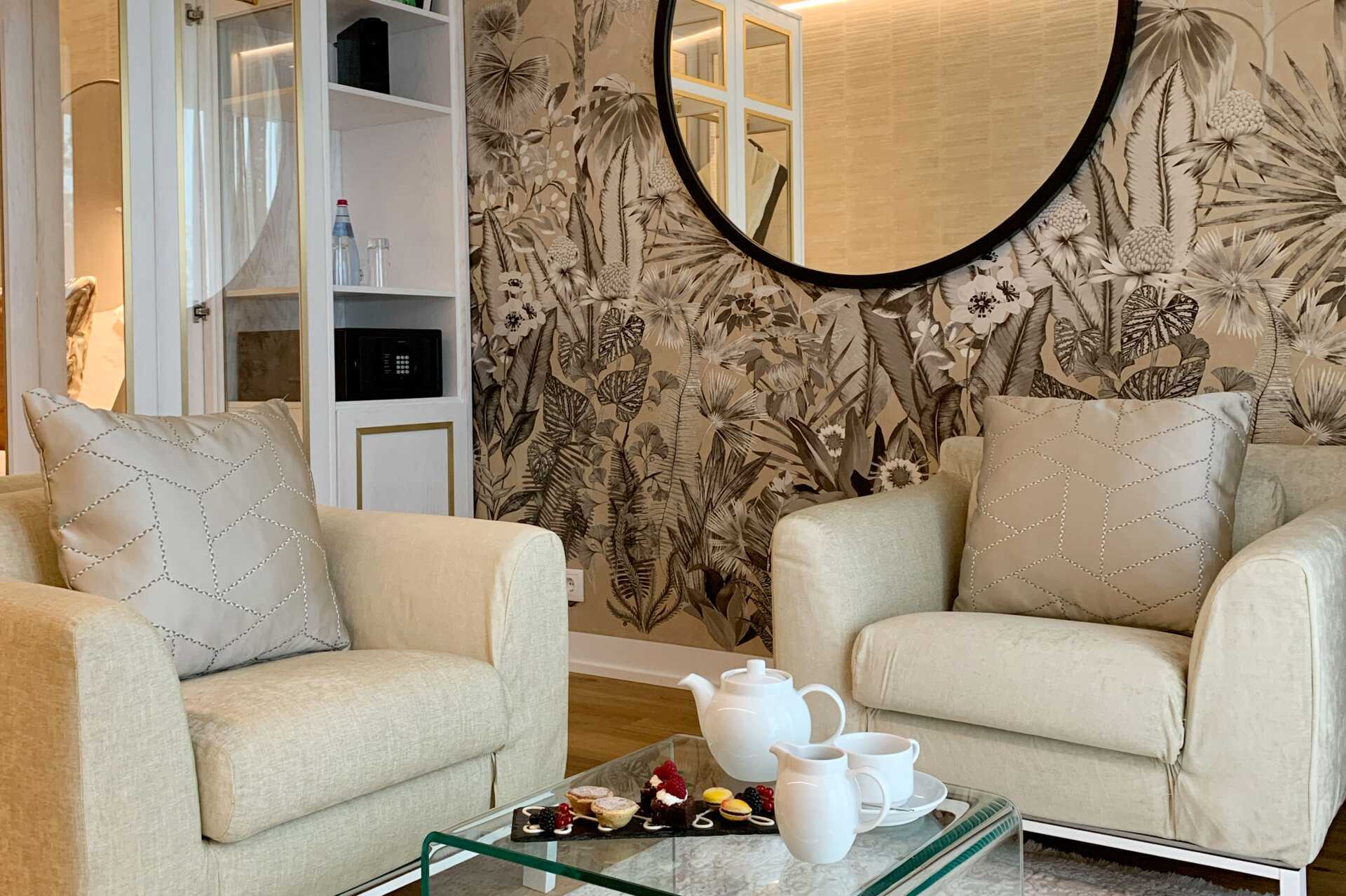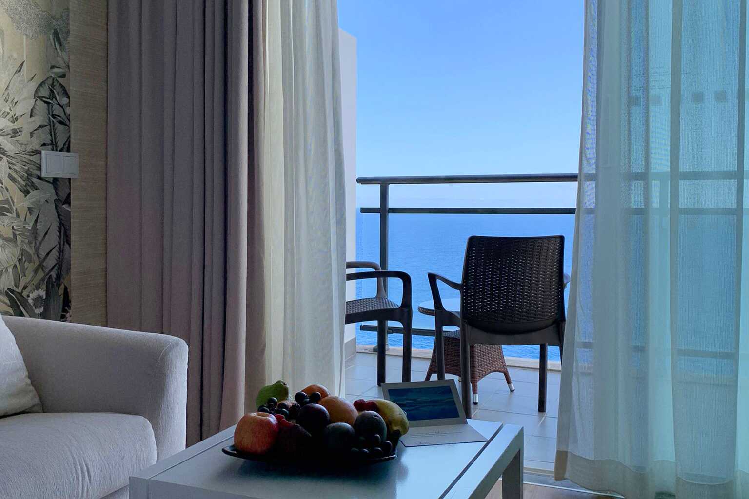Suite med balkong og havutsikt. Suiten består av et soverom med dobbeltseng og en stue med sittegruppe. Suitene ligger i 9.-10. etasje. Wifi, luftkondisjonering og safe inkludert. Kjøleskap. Vannkoker samt kaffe og te. TV. Badekåper og tøfler. Hårføner. Bad med dusj og wc. Rengjøring 7 ggr/uke. Barn under 2 år regnes inn i maksantallet i rommet. Røyking er ikke tillatt på balkongen.