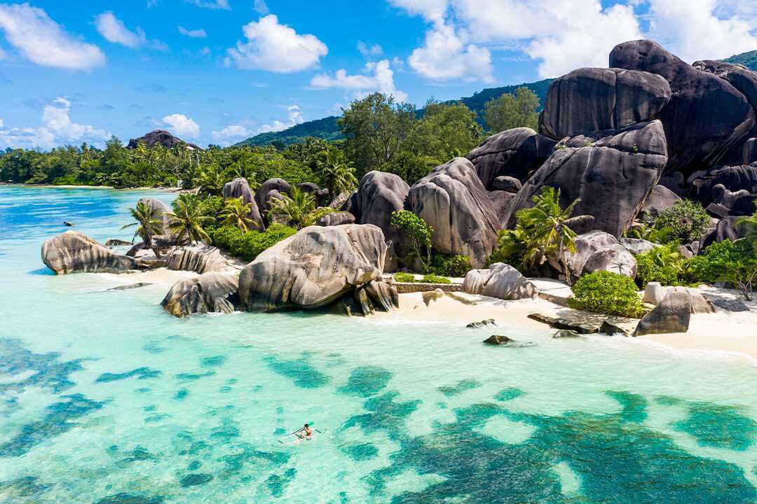 På øya Praslin ligger stranden Anse Lazio, hyllet som en av verdens vakreste strender. Her bør du benytte anledningen til å snorkle da stranden er beskyttet av et korallrev. Nasjonalparken på øya, Vallée de Mai, står på Unescos verdensarvliste for den intakte naturen. Her finner du også de beskyttede dobbel kokosnøtt-palmen Coco-de-mer, som har blitt symbolet på Seychellene. Fra Praslin kan du ta ferge over til de andre øyene, og på La Digue venter stillheten, med færre besøkende og bebyggelse. På La Digue sykler man helst rundt og ta dagen som den kommer. Curieuse Island ligger like ved Praslin og er hjemsted for 500 gigantiske skilpadder.