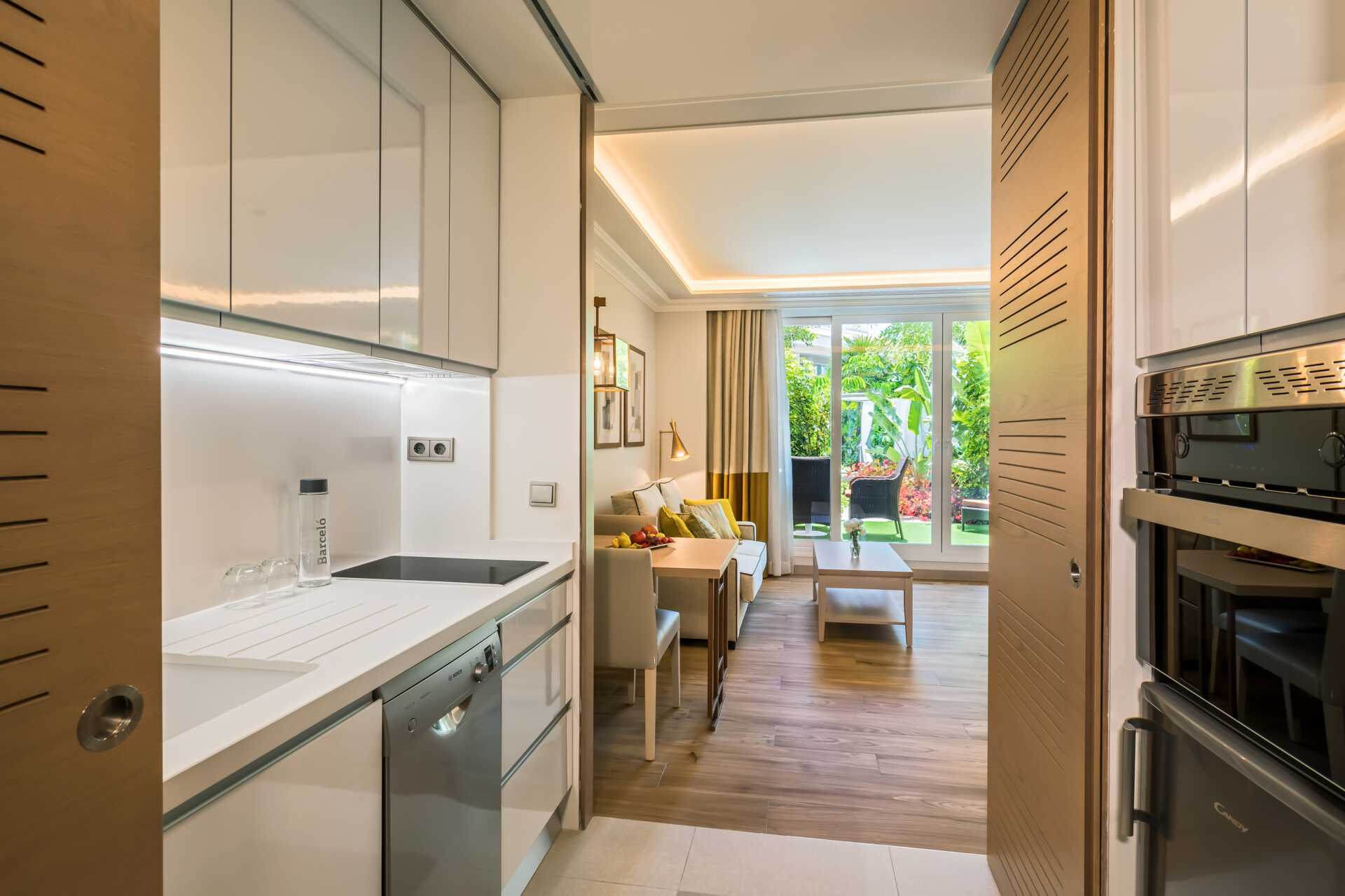 Deluxerom med balkong eller terrasse. En dobbeltseng. Mulig med ekstrasenger i sovesofa. Det er også et separat kjøkken med kokeplater, kjøleskap, oppvaskmaskin, stekeovn og mikrobølgeovn. Kjøkkenutstyr på forespørsel. Wifi og luftkondisjonering inkludert. Safe mot avgift. TV. Hårføner. Dusj og wc. Rengjøring 5 ggr/uke.
