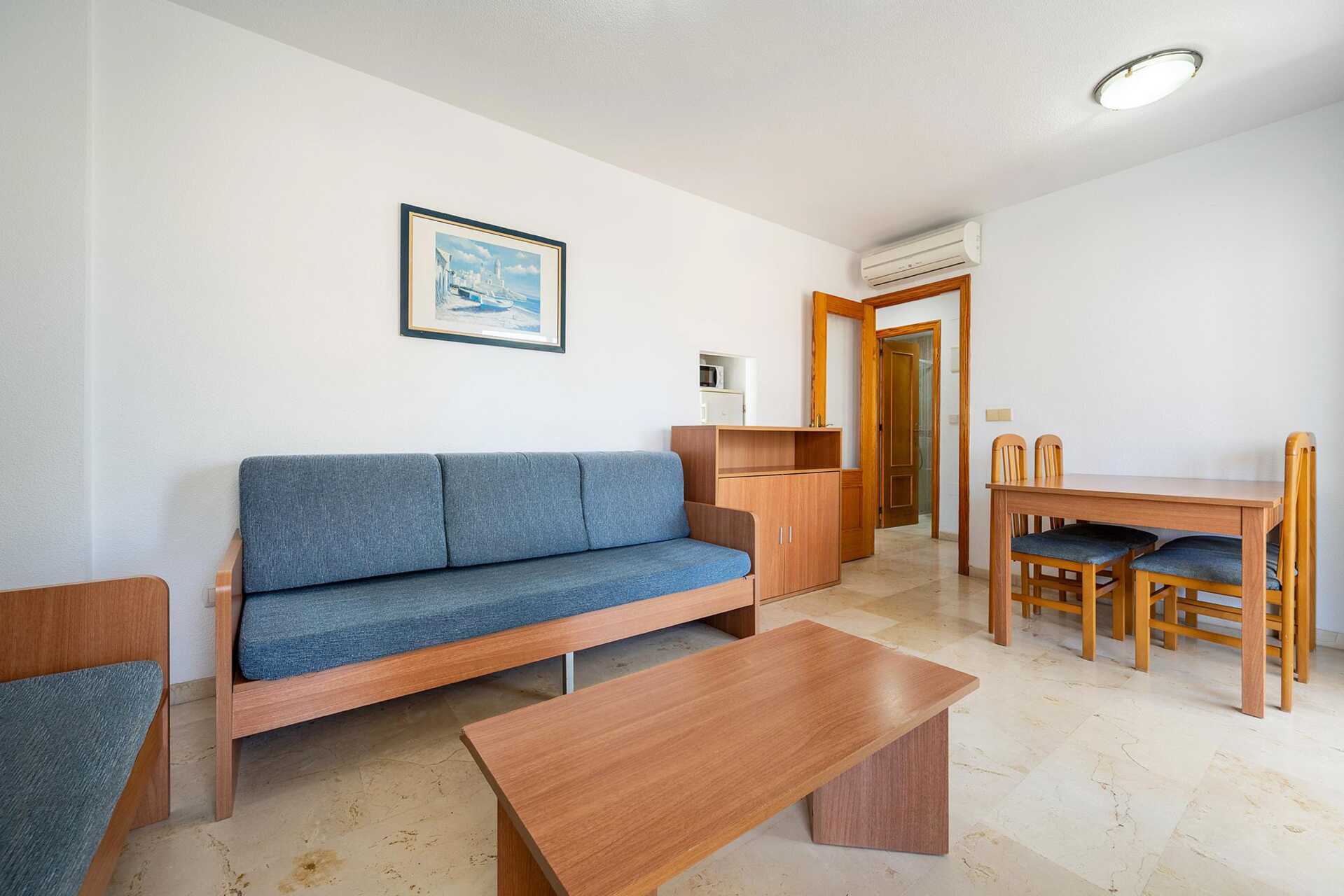 2-romsleilighet med balkong. Et separat soverom med en dobbeltseng eller to enkeltsenger. Kombinert stue/kjøkken med sovesofa. Minikjøkken med grunnleggende kjøkkenutstyr, kjøleskap, mikrobølgeovn, vannkoker og brødrister. TV. Luftkondisjonering inkludert. Vaskemaskin. Bad med badekar/dusj og wc. Rengjøring 1 gg/uke.