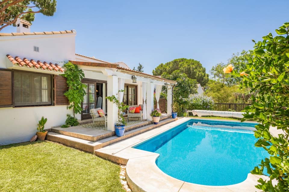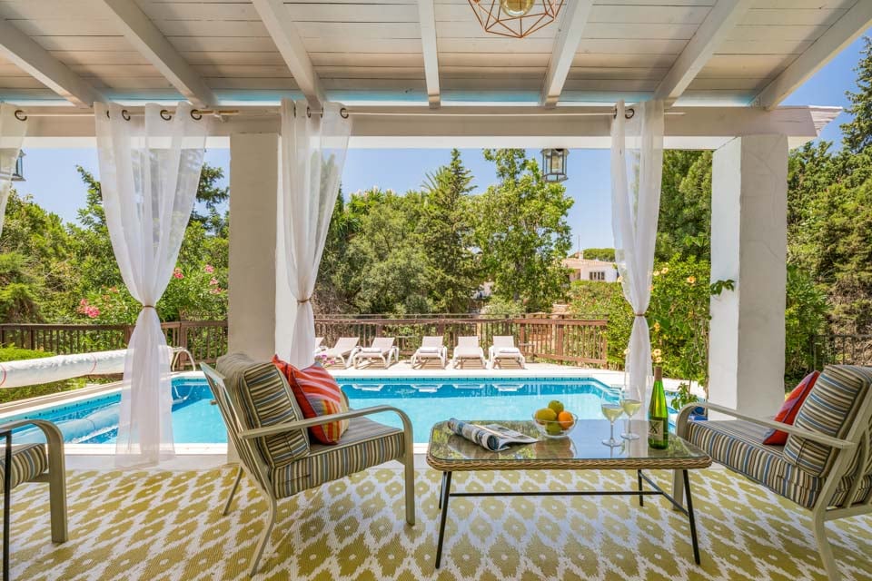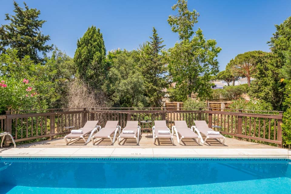 Terrassedører fører til utendørsterrassen og det private svømmebassenget. Omgitt av solsenger og uteserveringer, er dette et flott sted for soling og å nyte et måltid i utendørsstil tilberedt på grillen.