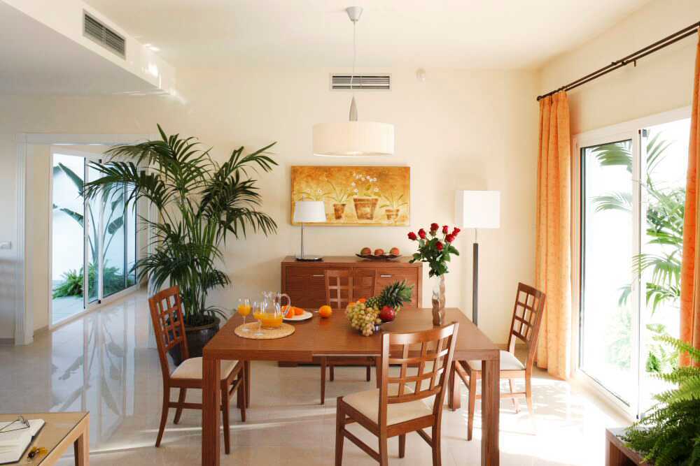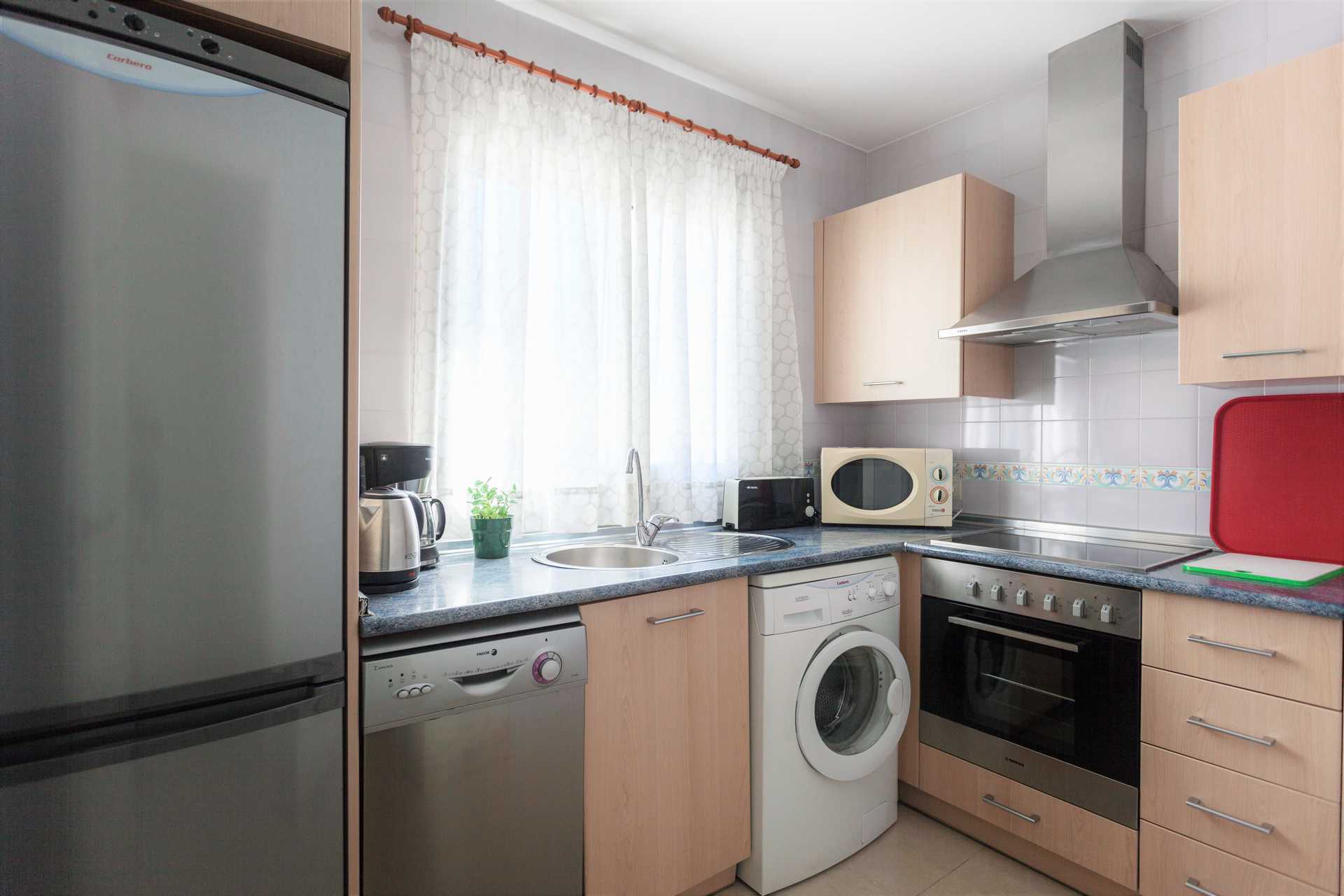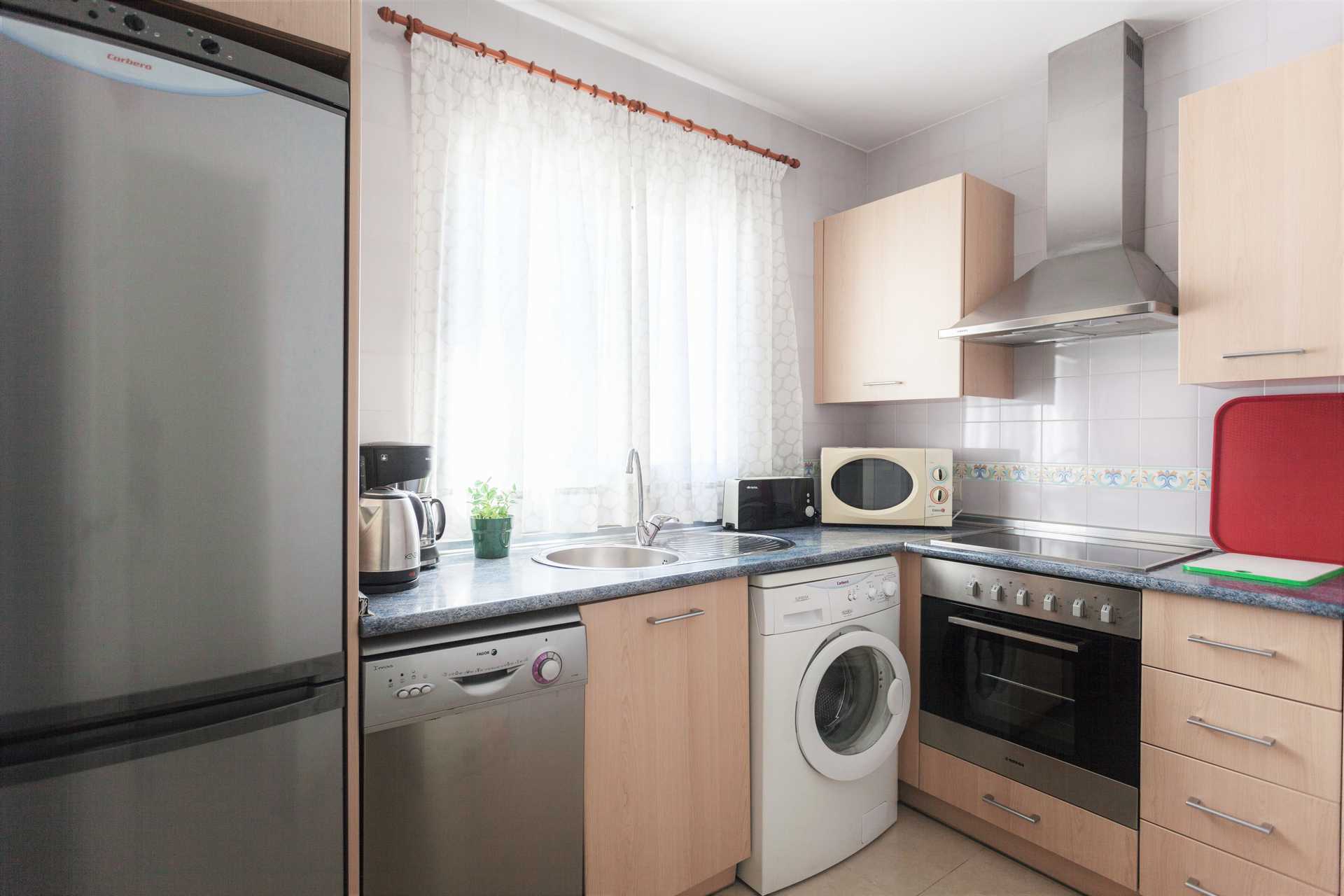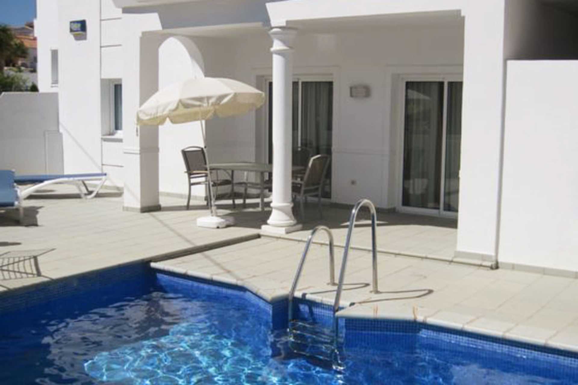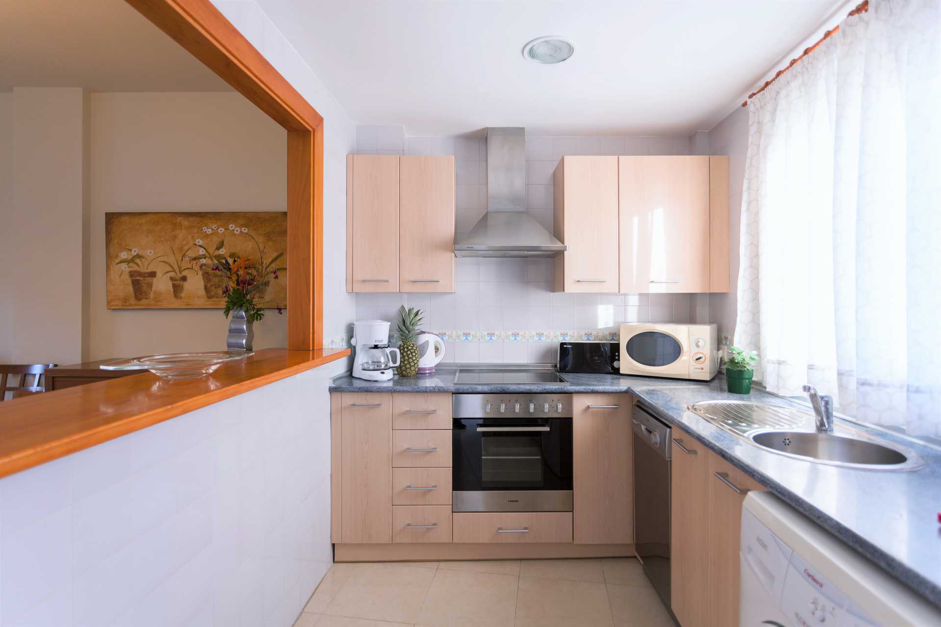 Fireromsleilighet i etasje med terrasse og eget basseng. På terrassen er det to solsenger, bord og stoler og en stige ned i bassenget. Tre soverom og en stue med minikjøkken. To enkeltsenger i to soverom og en dobbeltseng i det tredje soverommet. Mulig med ekstrasenger i sovesofa. Minikjøkken med kokeplater, kjøleskap, mikrobølgeovn, vannkoker, kaffetrakter samt oppvaskmaskin og enkelt kjøkkenutstyr. Wifi og luftkondisjonering er inkludert. Safe mot avgift. TV. Strykejern og strykebrett. Vaskemaskin. Hårføner. To bad med badekar eller dusj samt wc. Rengjøring 7 ggr/uke.