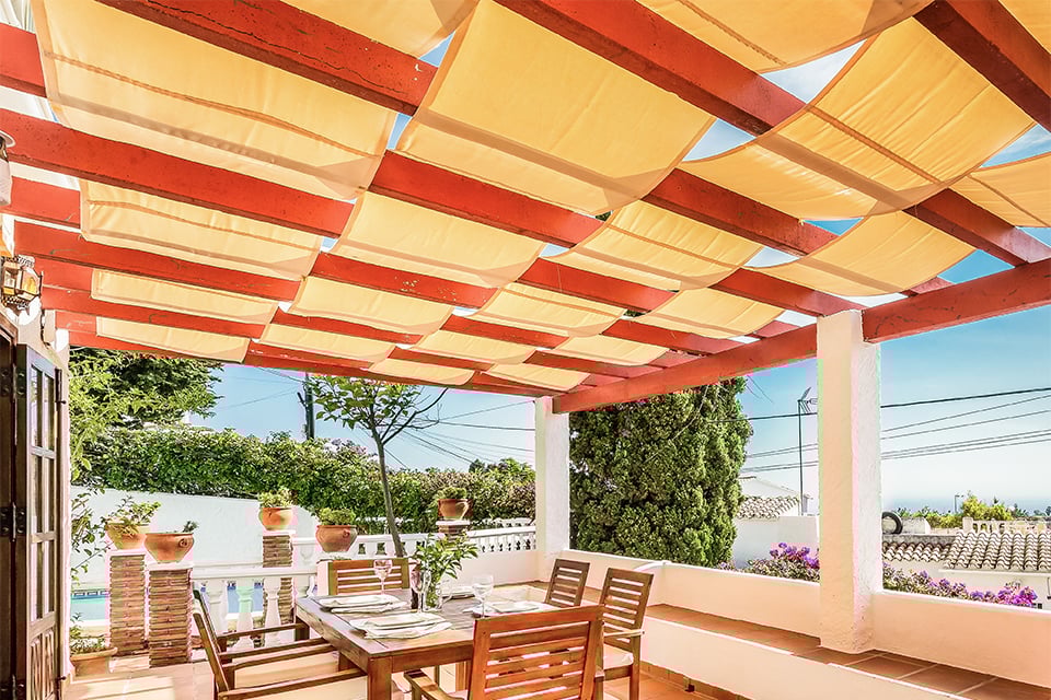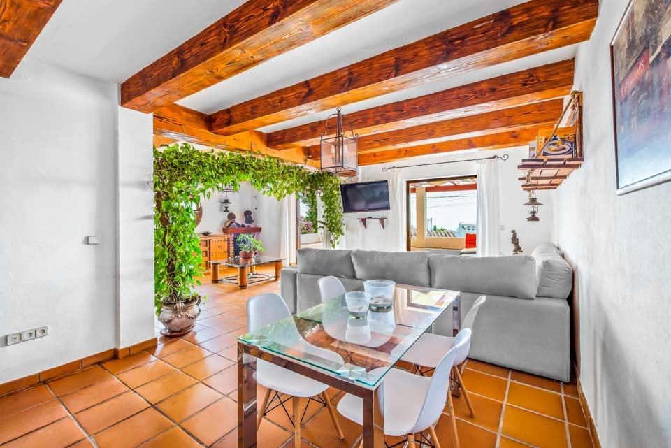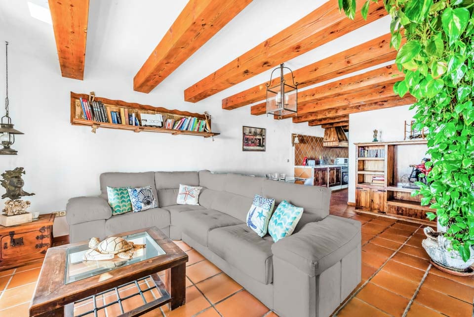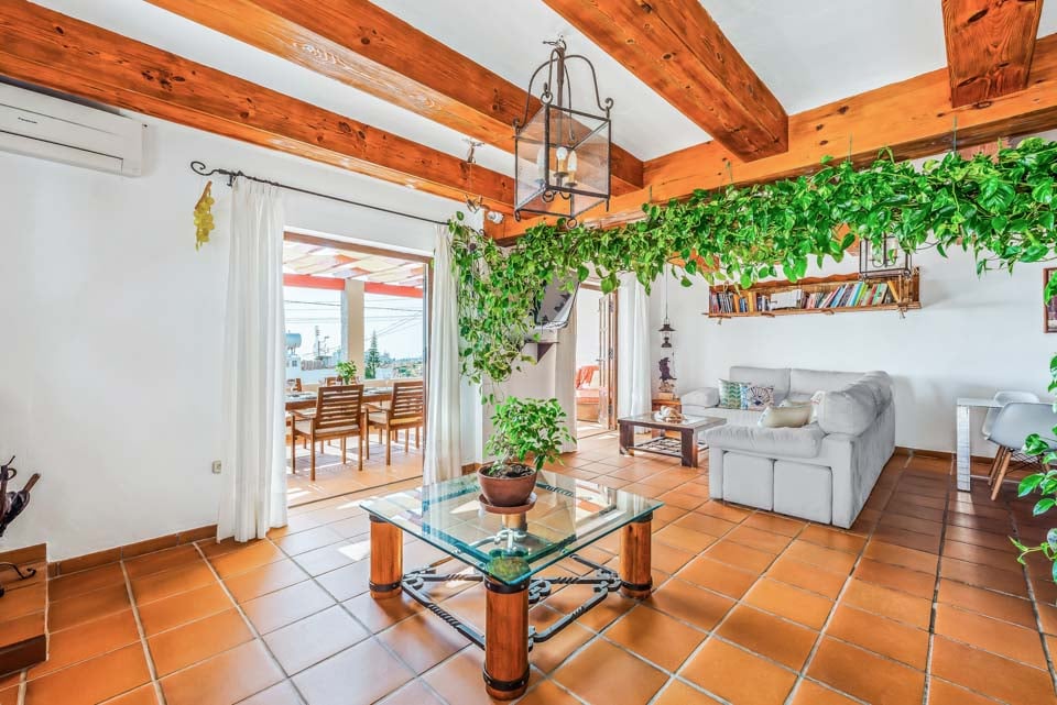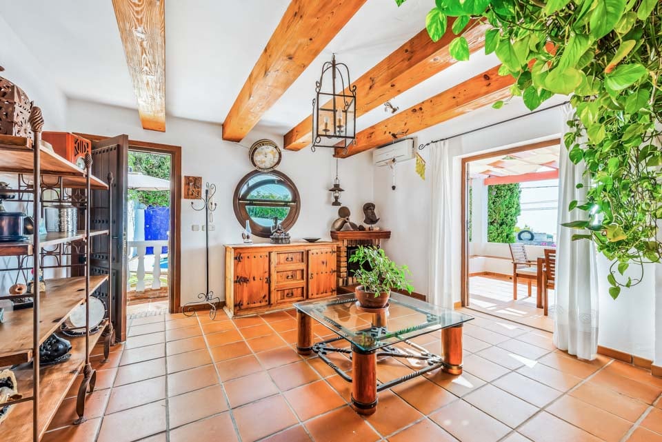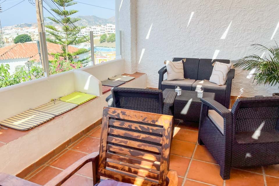 Denne vakre andalusiske villaen ligger nordøst for sentrale Nerja, i det trendy nabolaget El Capistrano. Gå opp trappen til hovedinngangen til bygningen, hvor du blir møtt av en herlig, romslig terrasse med innbydende sofaer, samt et spisebord og stoler – ideelt for lange sommerdager hvor du kan sitte og se ut på den pittoreske havutsikten som denne flotte lille eiendommen byr på.