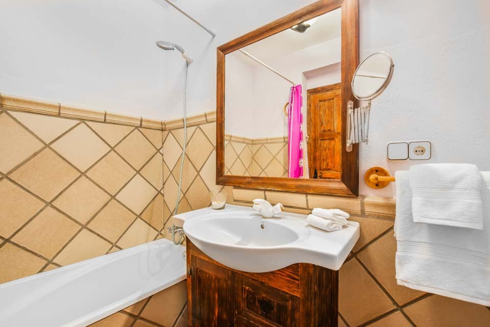 Gå inn i hovedvillaen, og du har en åpen stue/spisestue/kjøkkenløsning med alle moderne fasiliteter for å sikre et komfortabelt opphold. Nede i gangen finner du et moderne soverom med to enkeltsenger og innebygde garderober. Et separat bad har badekar med dusj. Utenfor kommer du til en separat inngang til dobbeltsoverommet, hvor du har den ekstra bonusen av et eget bad med utsikt over svømmebassenget, samt den ekstra luksusen av et ekstra garderoberom.