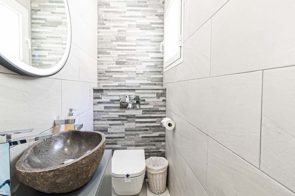 Gå ut på den lille terrakottaterrassen som fører ut fra stuen, hvor du finner en komfortabel hagesofa, ideell for å sole deg eller nyte utsikten over fjellene i det fjerne. Uteplassen gir avslappende omgivelser for rolige morgener eller avslappende kvelder.
