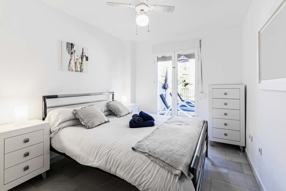 Dobbel, dobbeltseng, klimaanlegg, takvifte, vifte, dører til terrasse