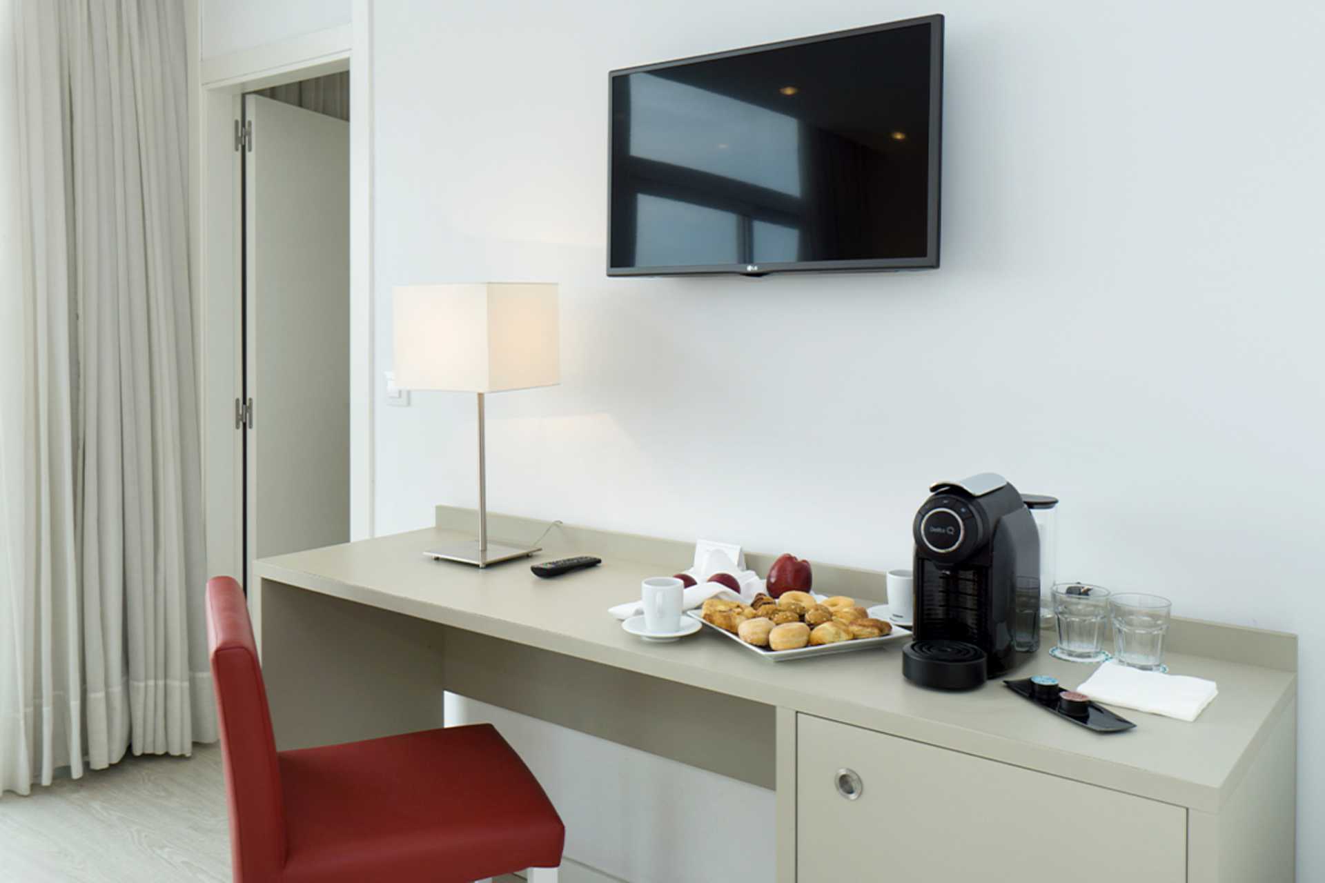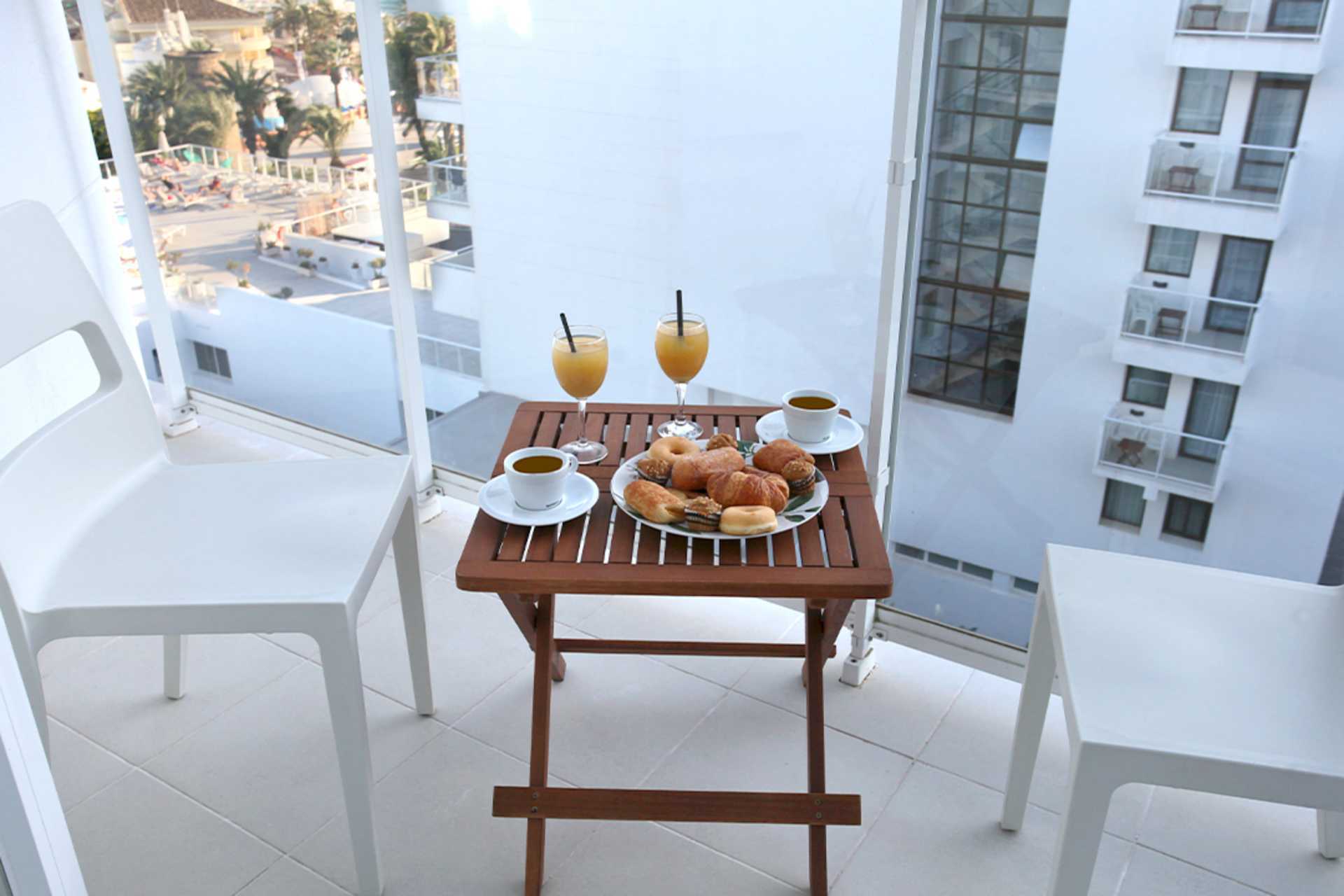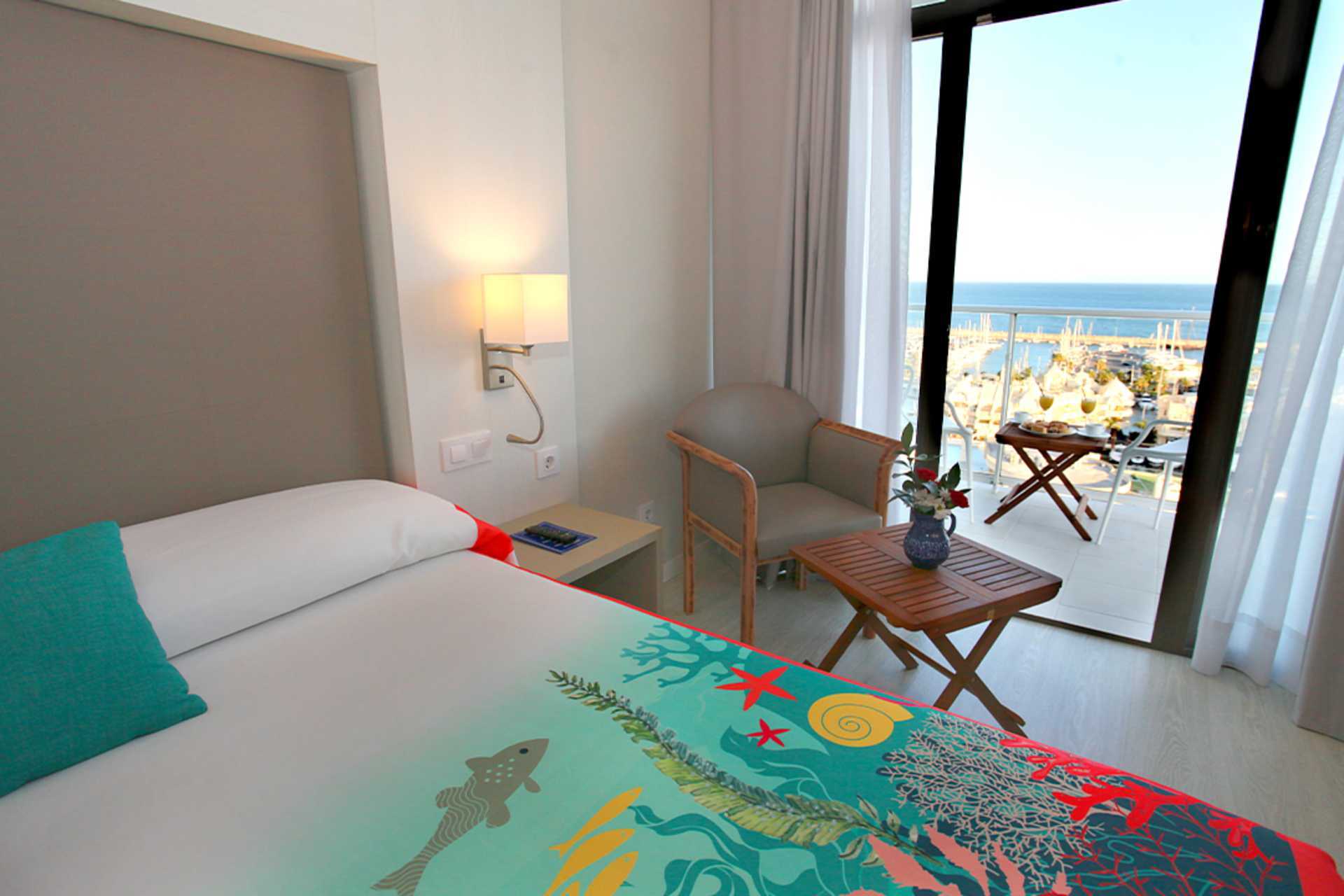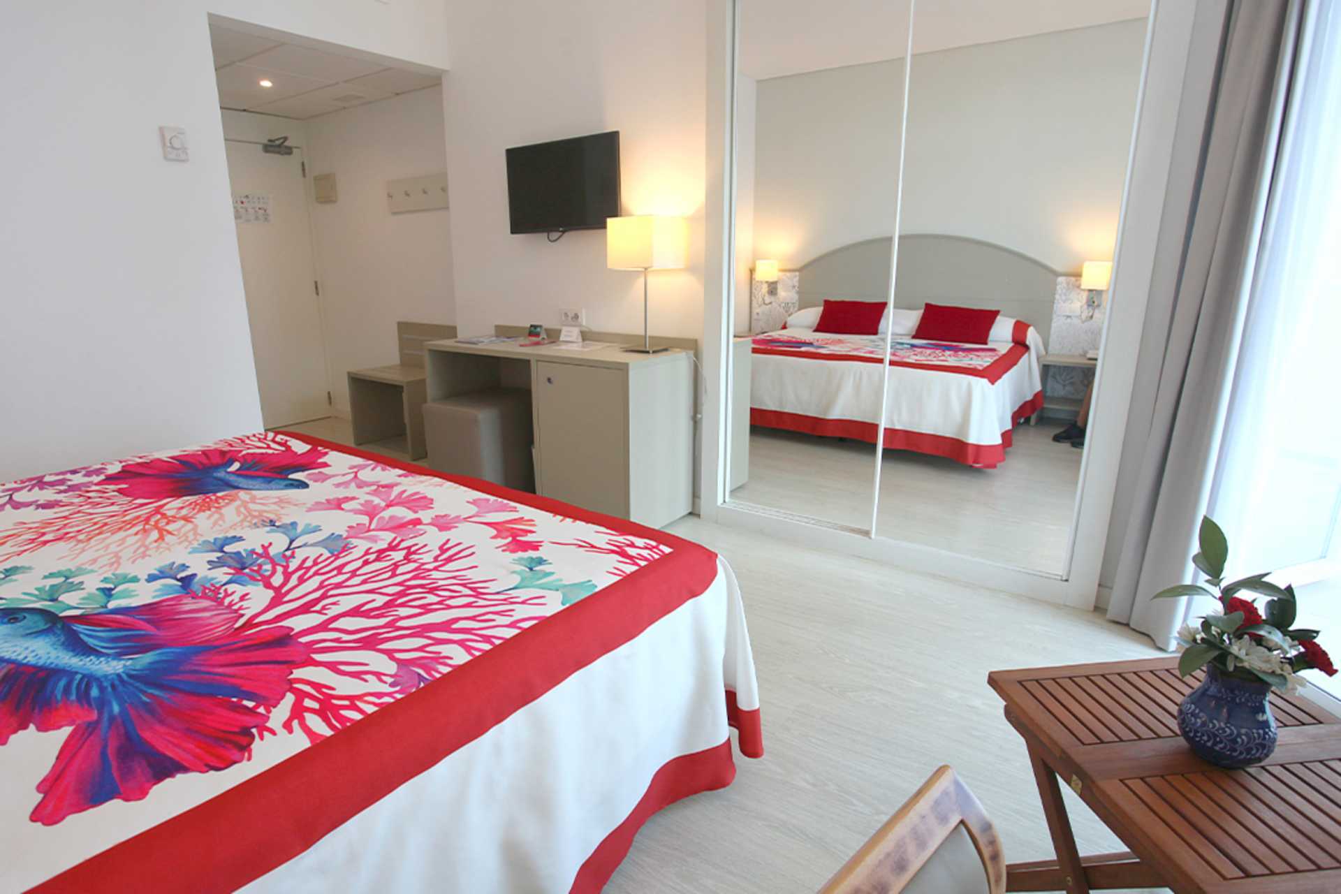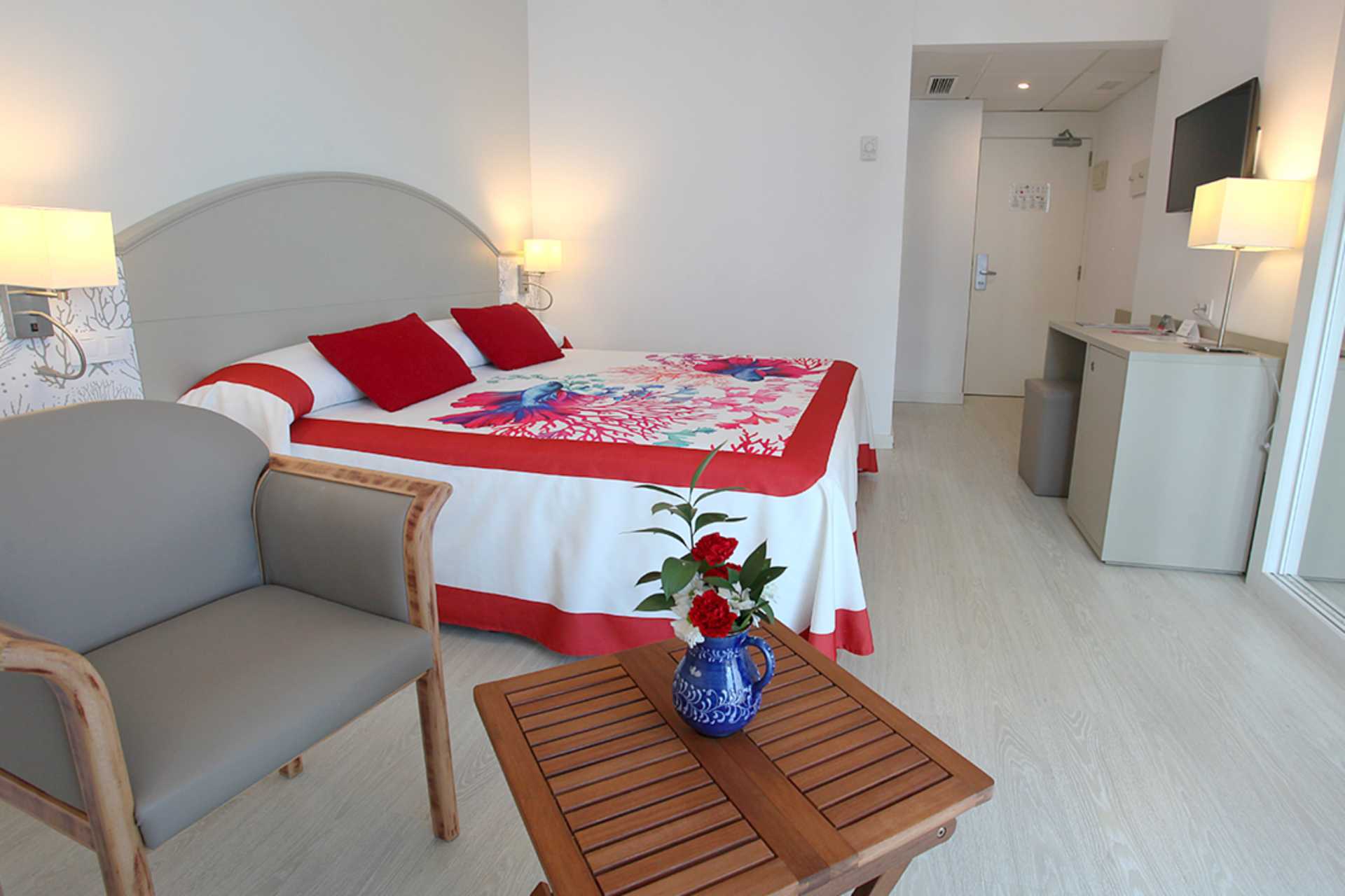 Dobbeltrom med balkong, noen med havutsikt. En dobbeltseng eller to enkeltsenger. Wifi, safe og luftkondisjonering inkludert. Minibar. TV. Badekar og wc. Rengjøring 7 ggr/uke.
