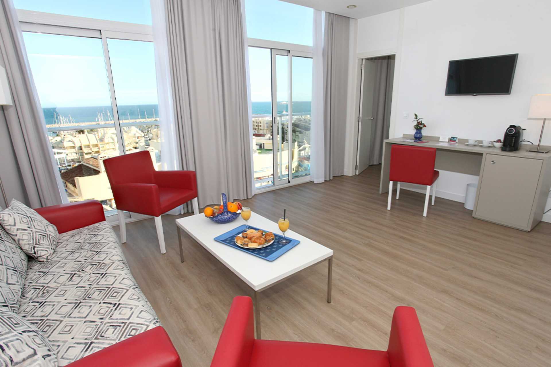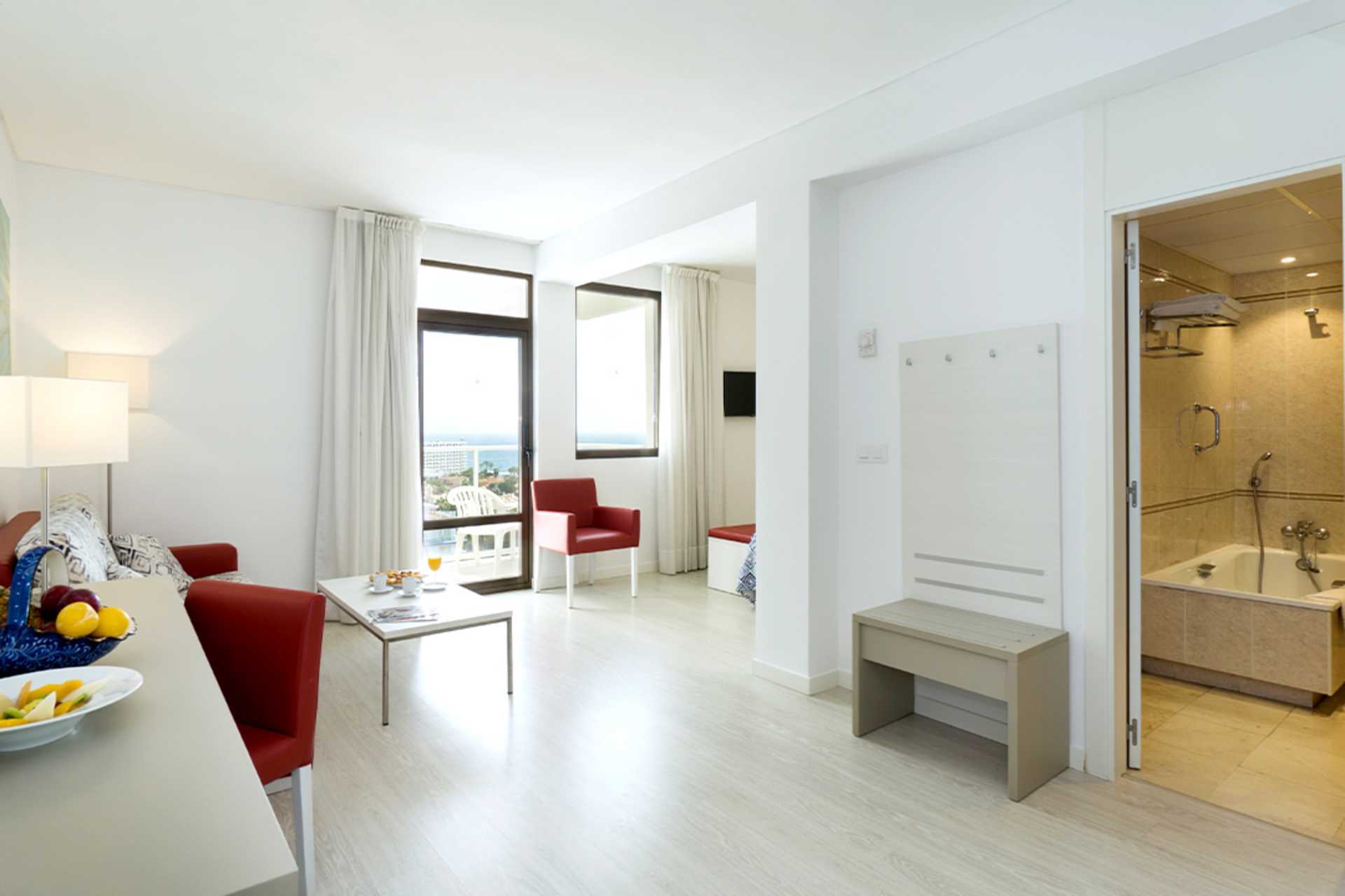 Juniorsuiter med balkong og havutsikt. En soveromsdel med en dobbeltseng eller to enkeltsenger. Stuedel med sofa. Wifi, safe og luftkondisjonering inkludert. Minibar. TV. Badekar og wc. Rengjøring 7 ggr/uke.