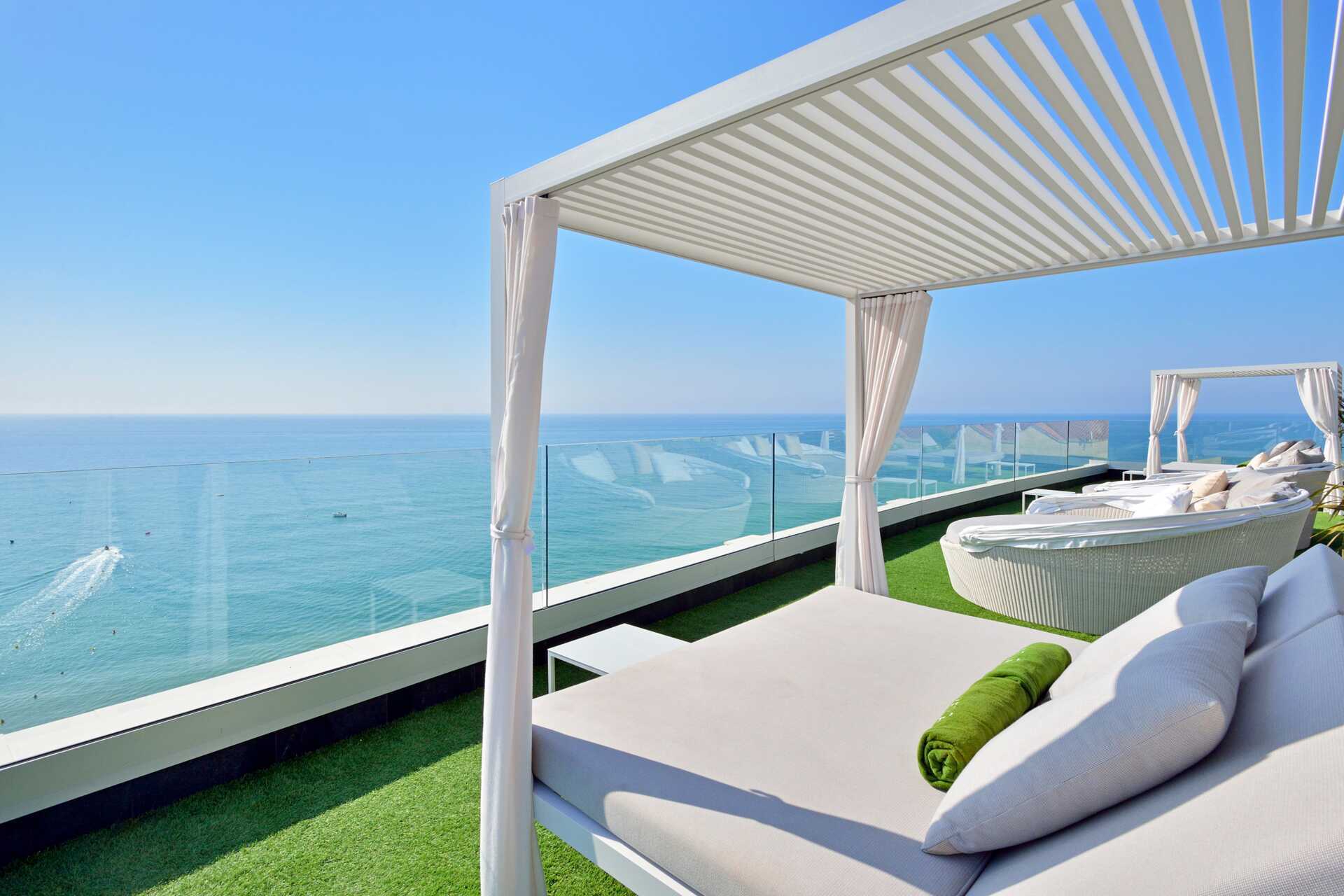 Fra hotellet Sky & Sea Rooftop Pool and Terrace har du en fantastisk utsikt over havet og kysten. Det er et basseng på hver takterrasse, hvorav det ene har en aldersgrense på 16 og det andre bassenget er for Level-gjester. Solsenger, balisenger og parasoller samt en bar som serverer småretter og drikke. Det er også et større bassengområde for alle gjester med solsenger og parasoller samt et innendørsbasseng med saltvann i hotellets spa. En lang, bred og deilig sandstrand venter rett over gaten. Hotellet har sin egen Beach Club hvor du kan nyte drinker, solsenger og balisenger. Basseng- og strandhåndklær mot depositum.