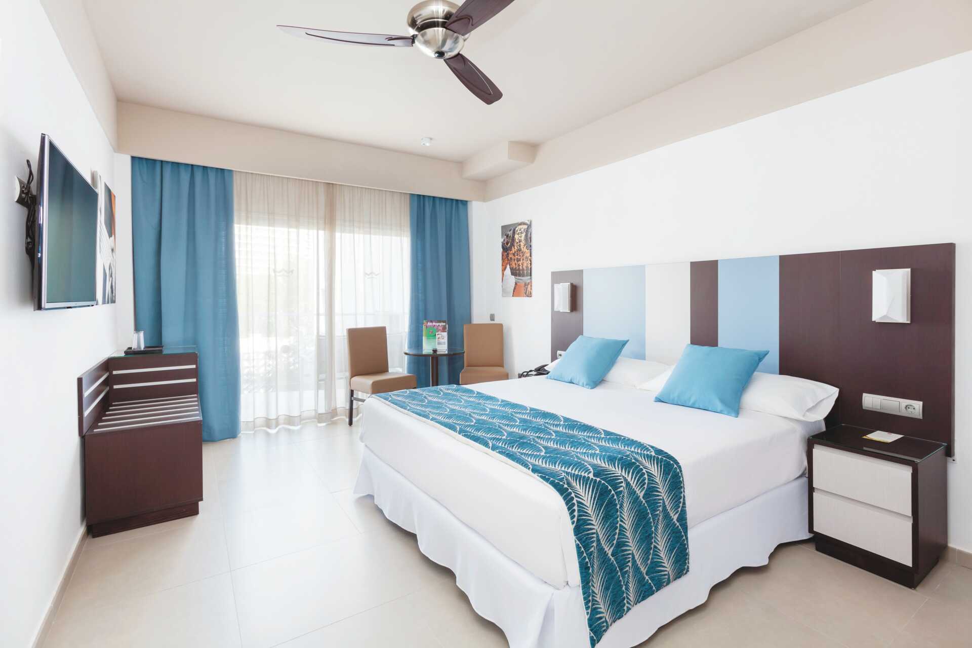 Dobbeltrom med balkong eller terrasse, noen med begrenset havutsikt. En dobbeltseng eller to enkeltsenger. Mulig med en ekstraseng i sovesofa. Wifi, luftkondisjonering og safe inkludert. Takvifte. Kjøleskap. Vannkoker. TV. Hårføner. Baderom med dusj og wc. Rengjøring 5 ggr/uke.