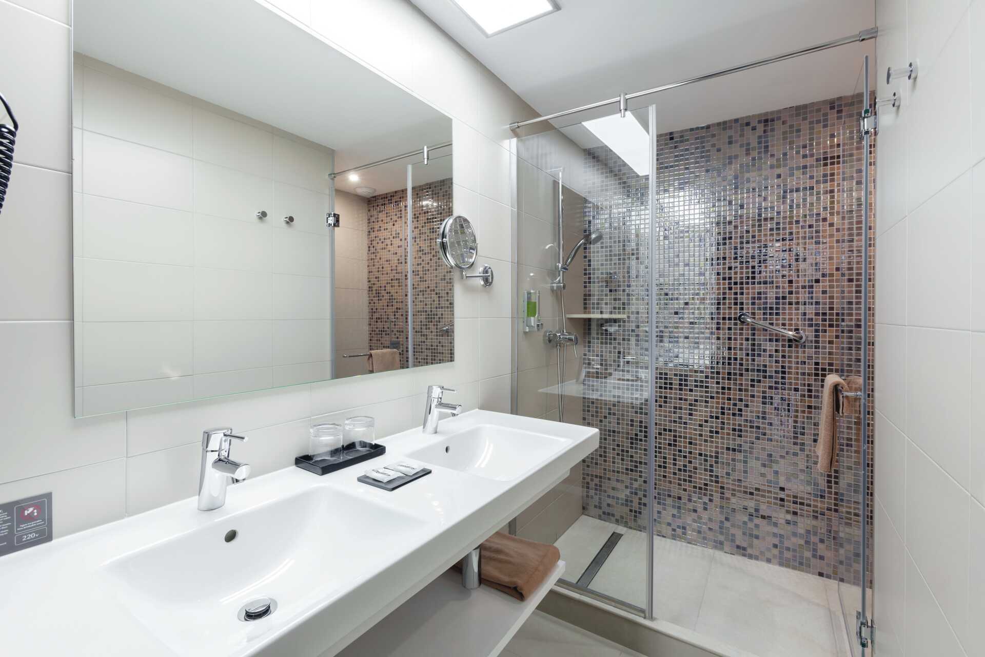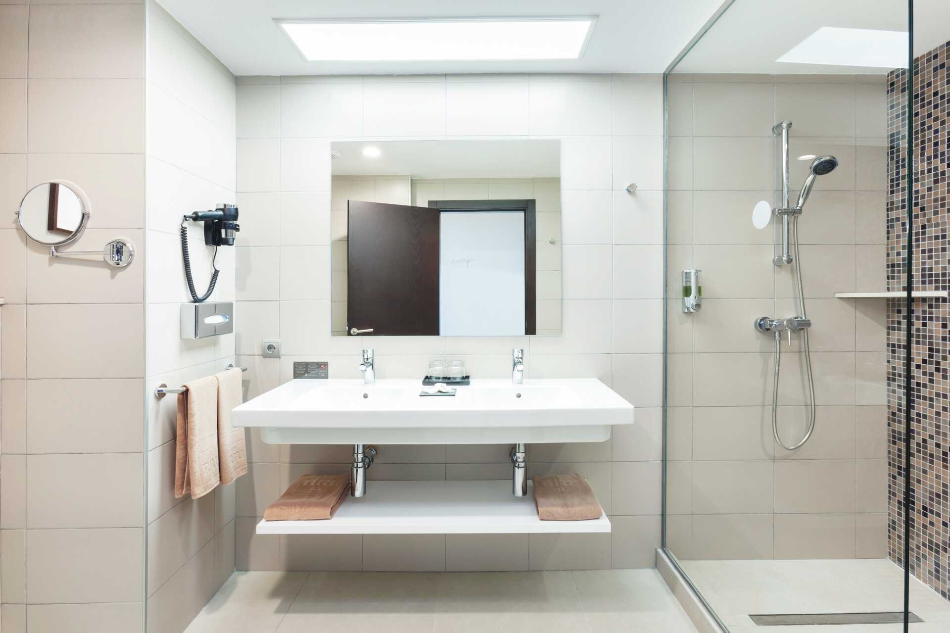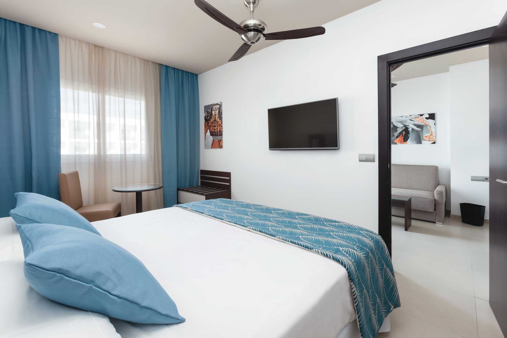 Juniorsuite med balkong eller terrasse. En dobbeltseng eller to enkeltsenger. Mulig med ekstrasenger i sovesofa. Wifi, luftkondisjonering og safe inkludert. Takvifte. Kjøleskap. Vannkoker. TV. Hårføner. Bad med to vasker, dusj og separat wc.