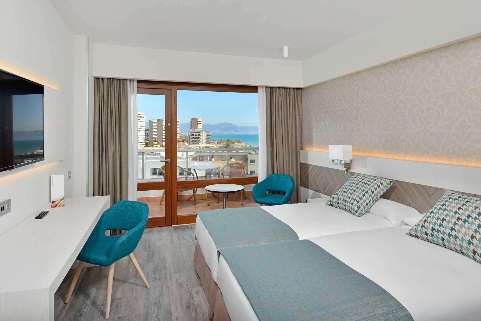 Dobbeltrom med balkong, noen med begrenset havutsikt. En dobbeltseng eller to enkeltsenger. Mulig med en ekstraseng i sovesofa. Wifi, luftkondisjonering og safe inkludert. Minibar. TV. Hårføner. Baderom med dusj og wc. Rengjøring 7 ggr/uke. Barn under 2 år regnes inn i maksantallet i rommet.